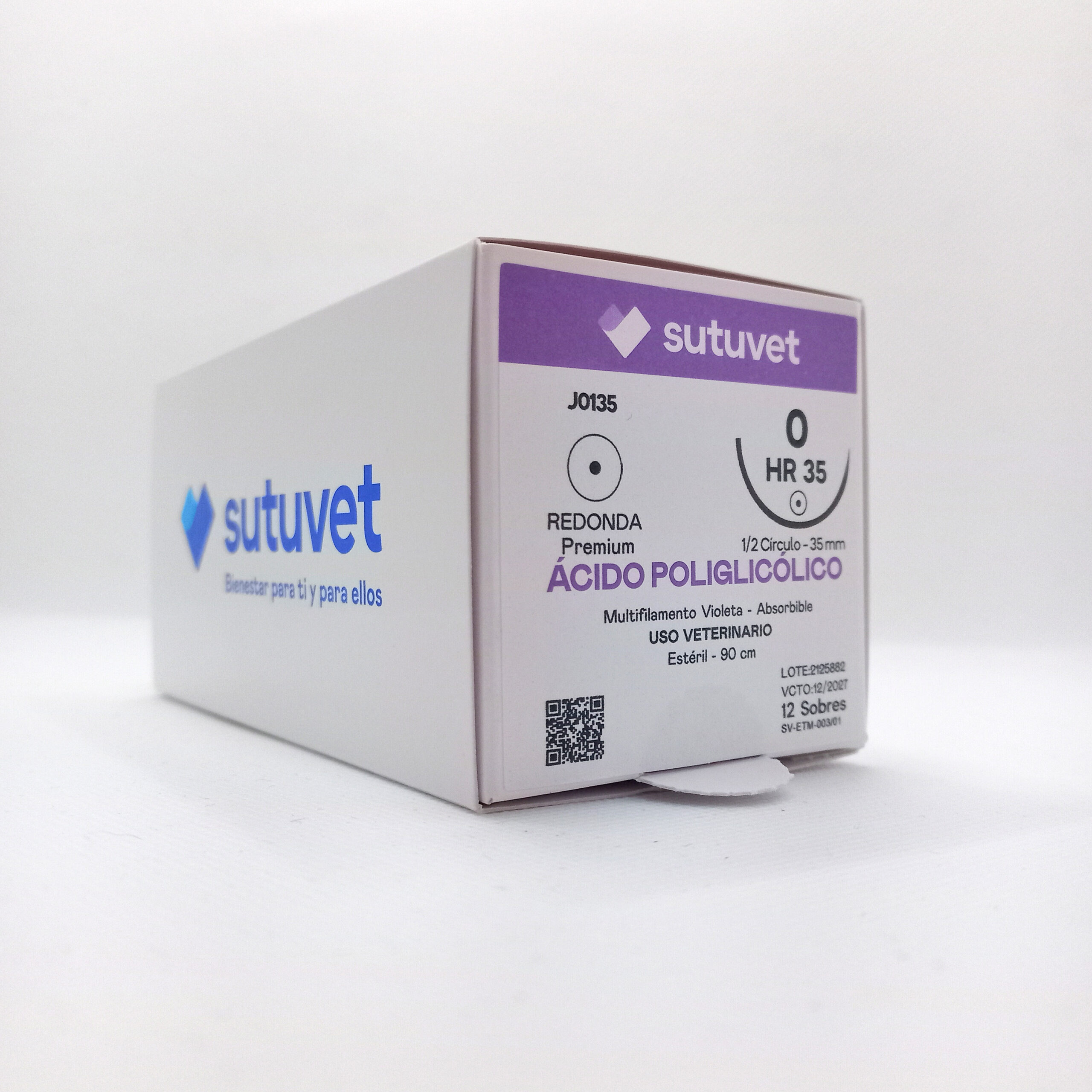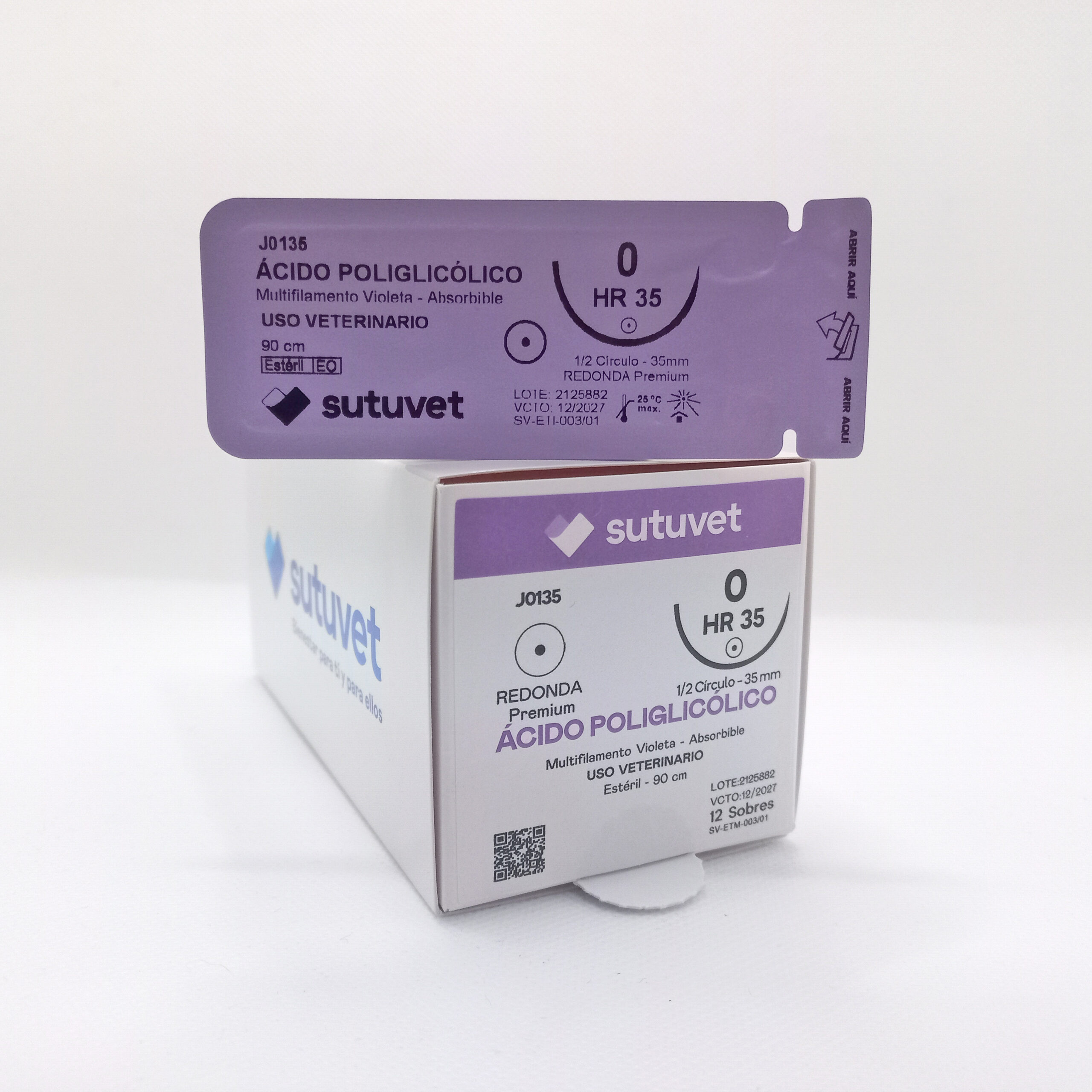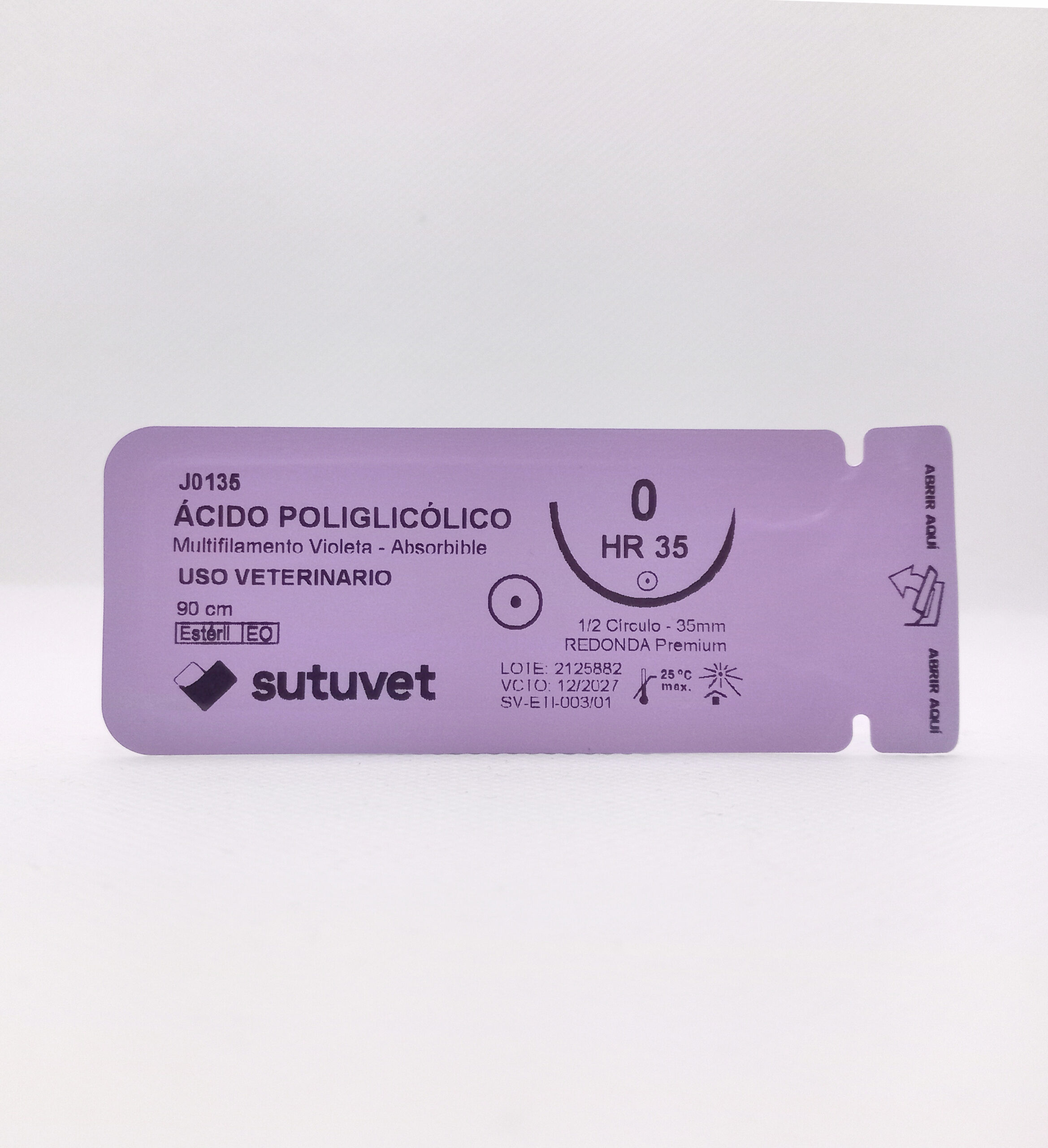 Suturas quirúrgicas veterinarias Sutuvet. LANR distribuciones, distribuidor autorizado Colombia. Sutura Absorbible de Ácido Poliglicólico, calibre 0, longitud de 90cm con aguja curva, medio circulo de 35 mm, punta atraumática.