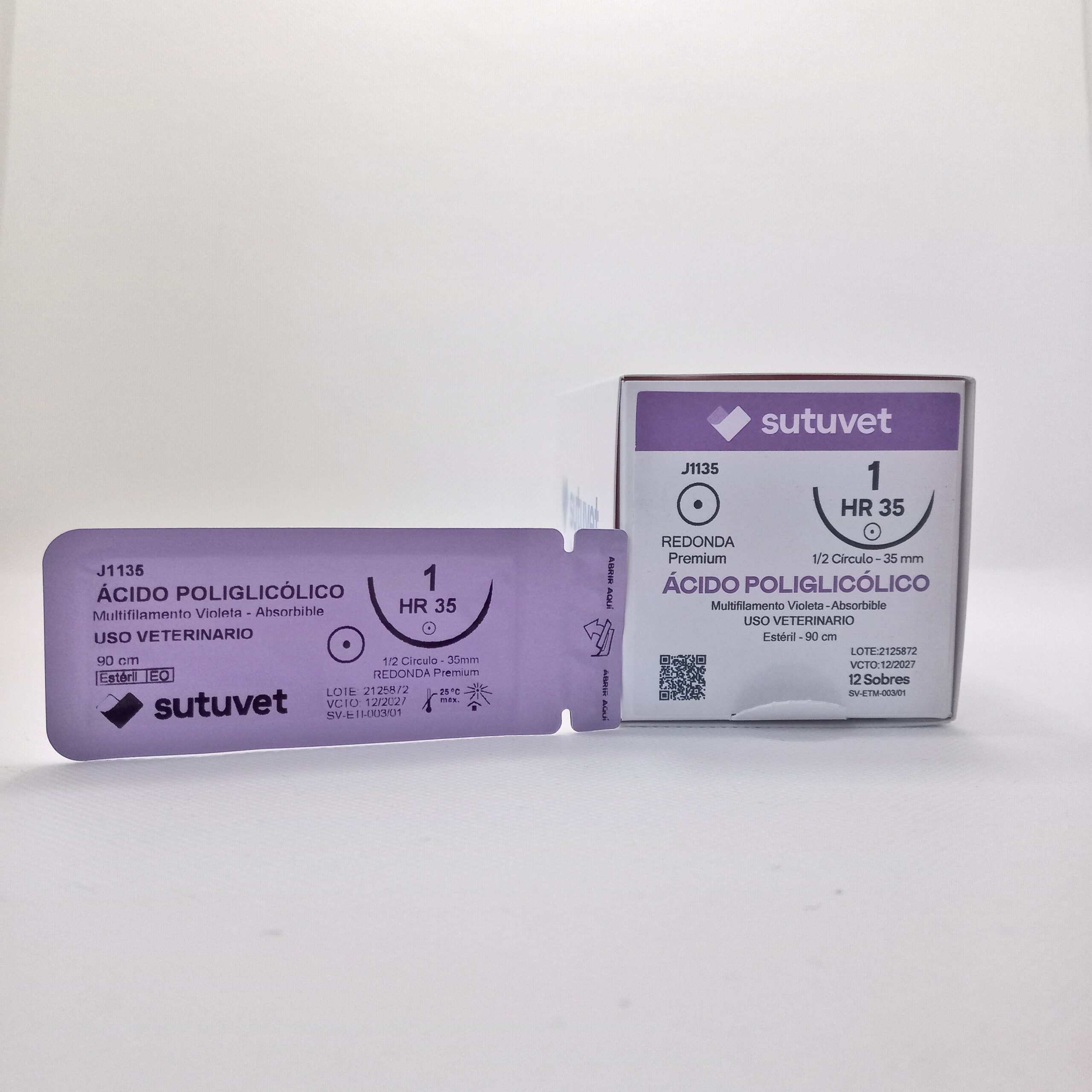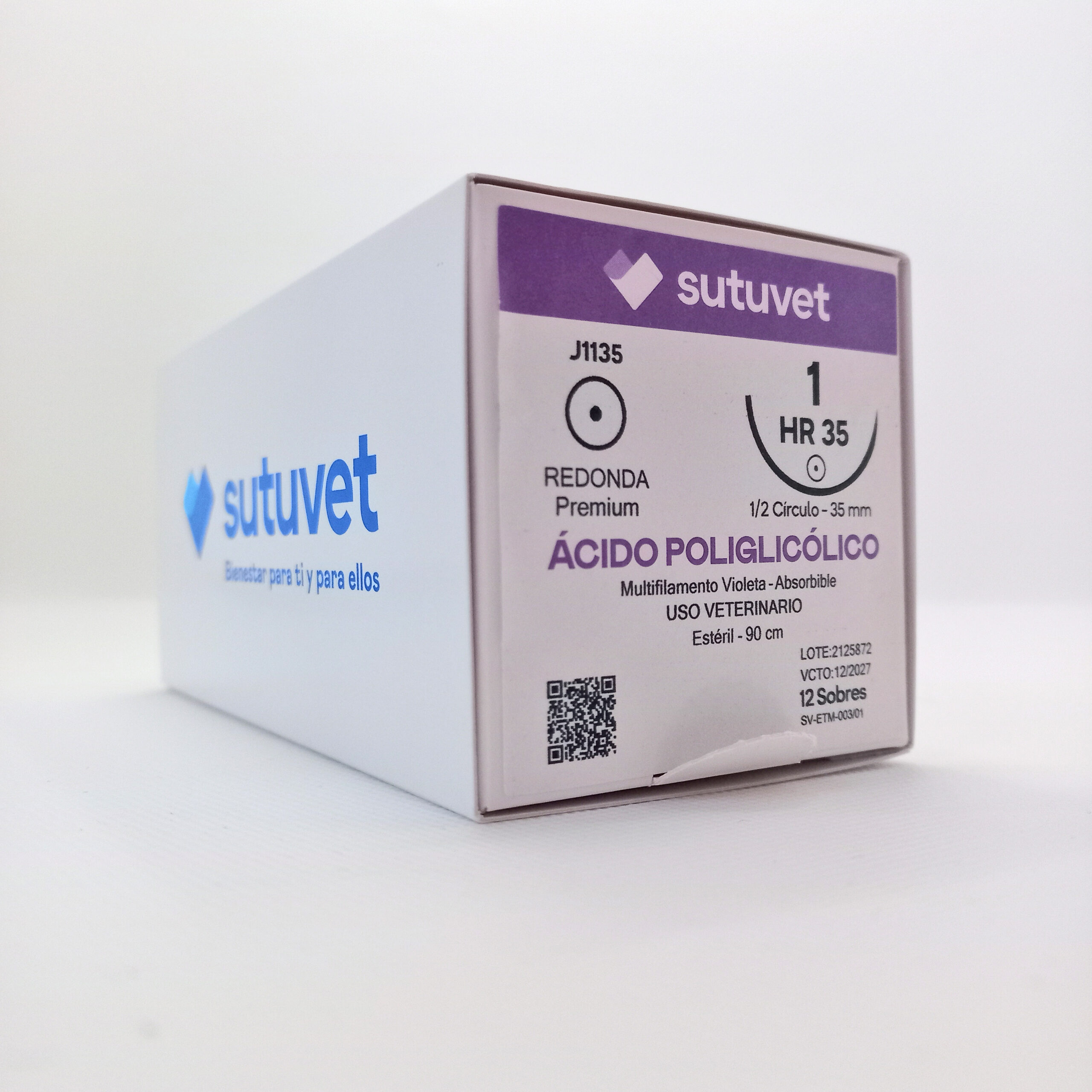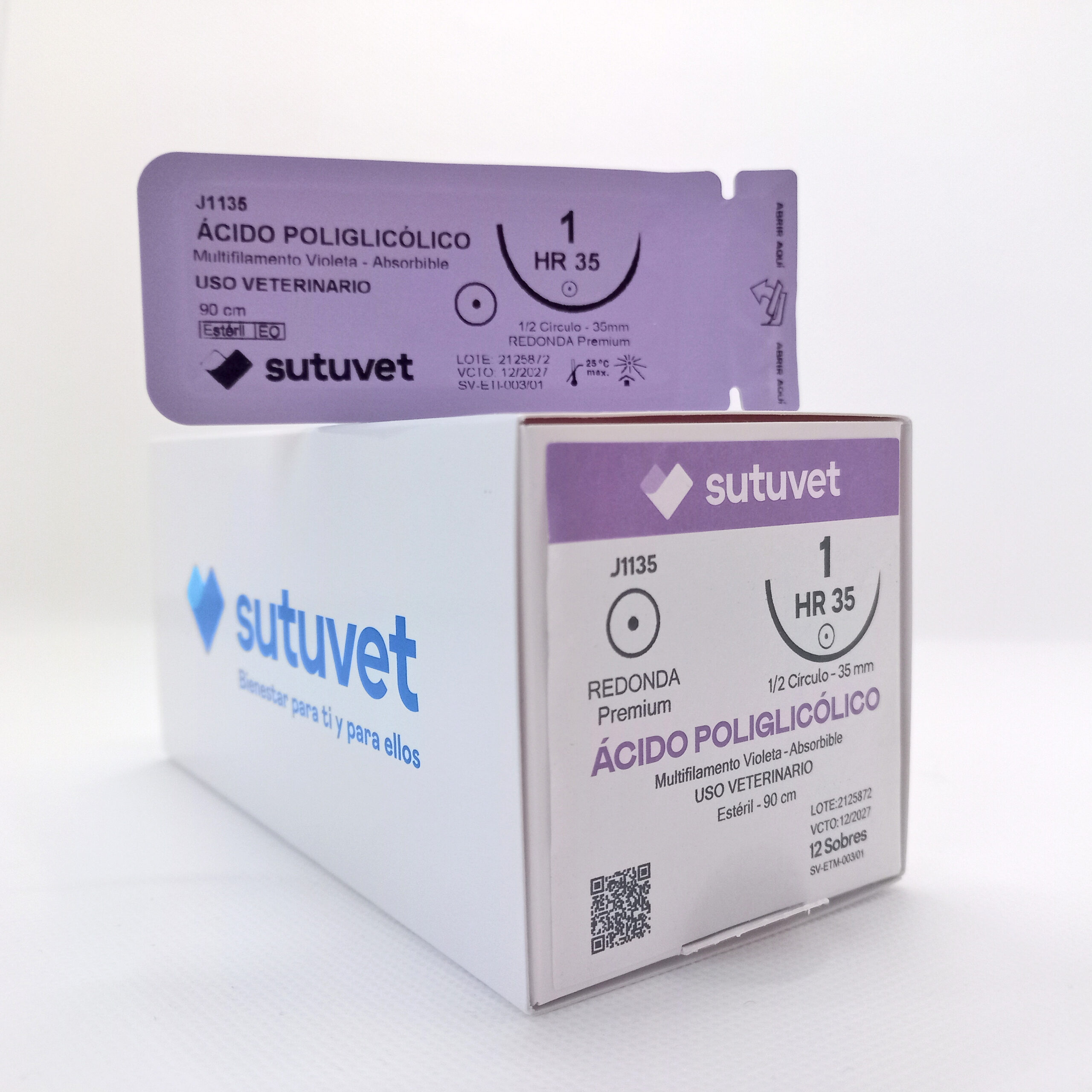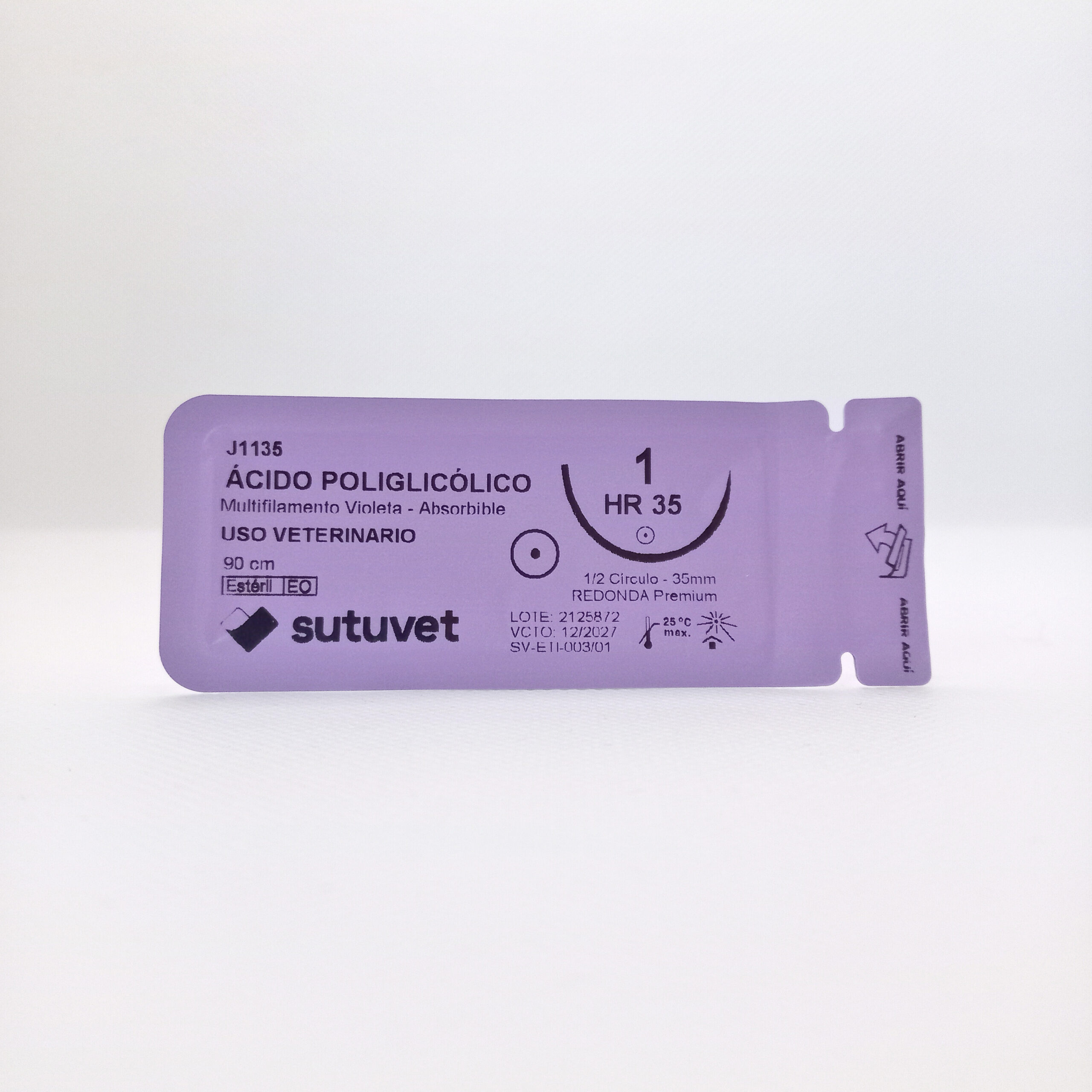 Suturas quirúrgicas veterinarias Sutuvet. LANR distribuciones, distribuidor autorizado Colombia. Sutura Multifilamento Absorbible de Ácido Poliglicólico, calibre 1, longitud de 90cm con aguja curva, medio circulo de 35 mm, punta atraumática.
