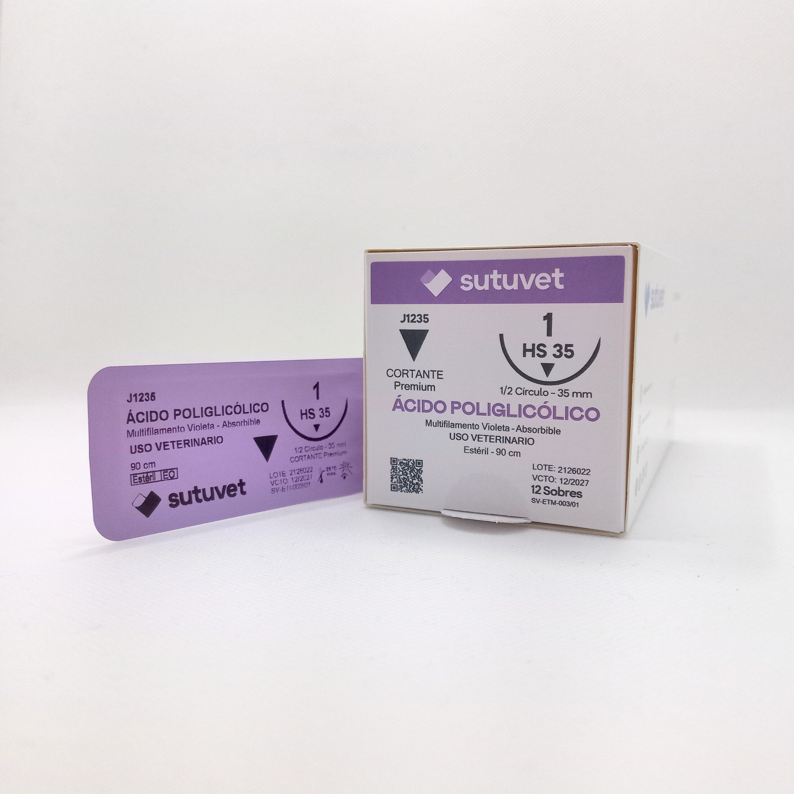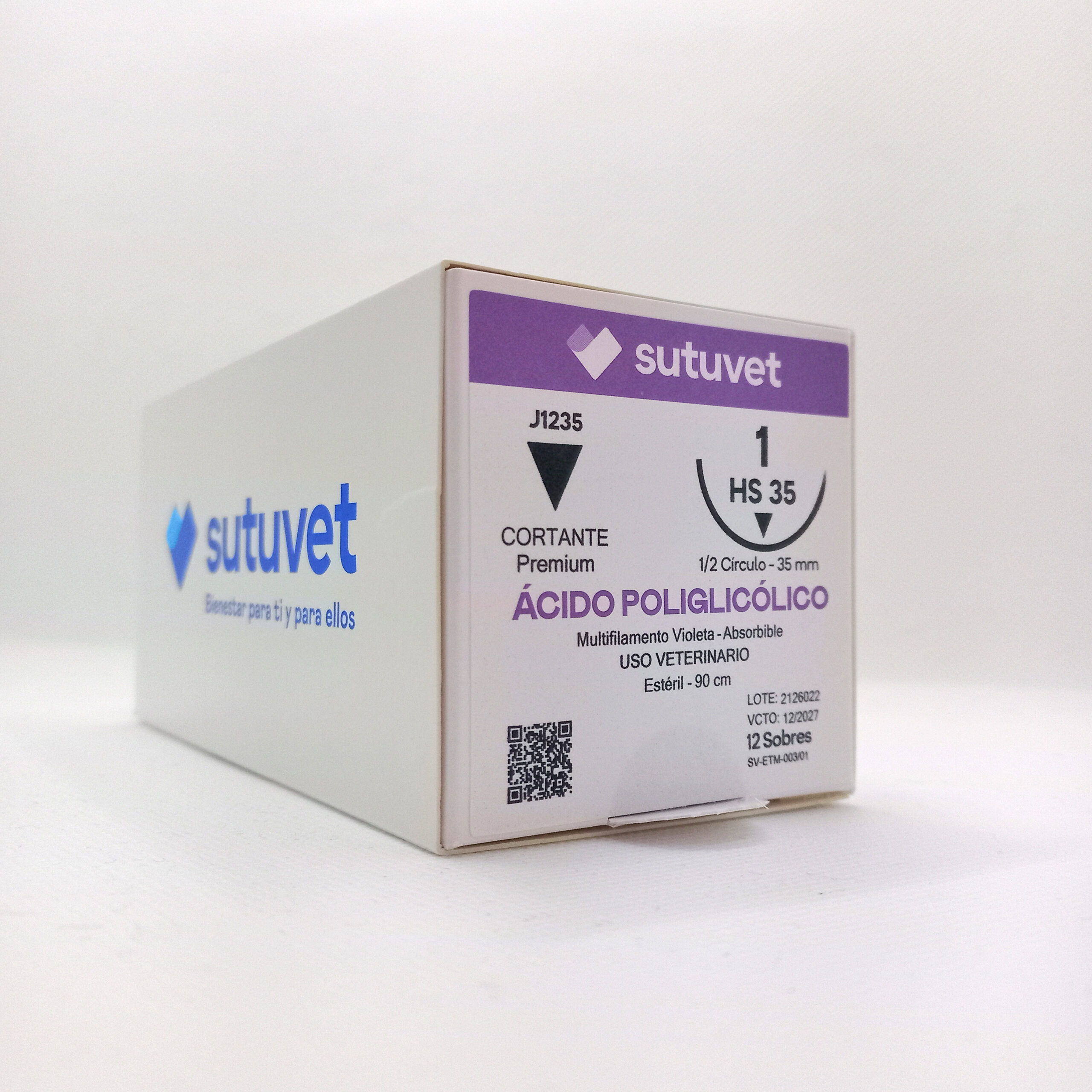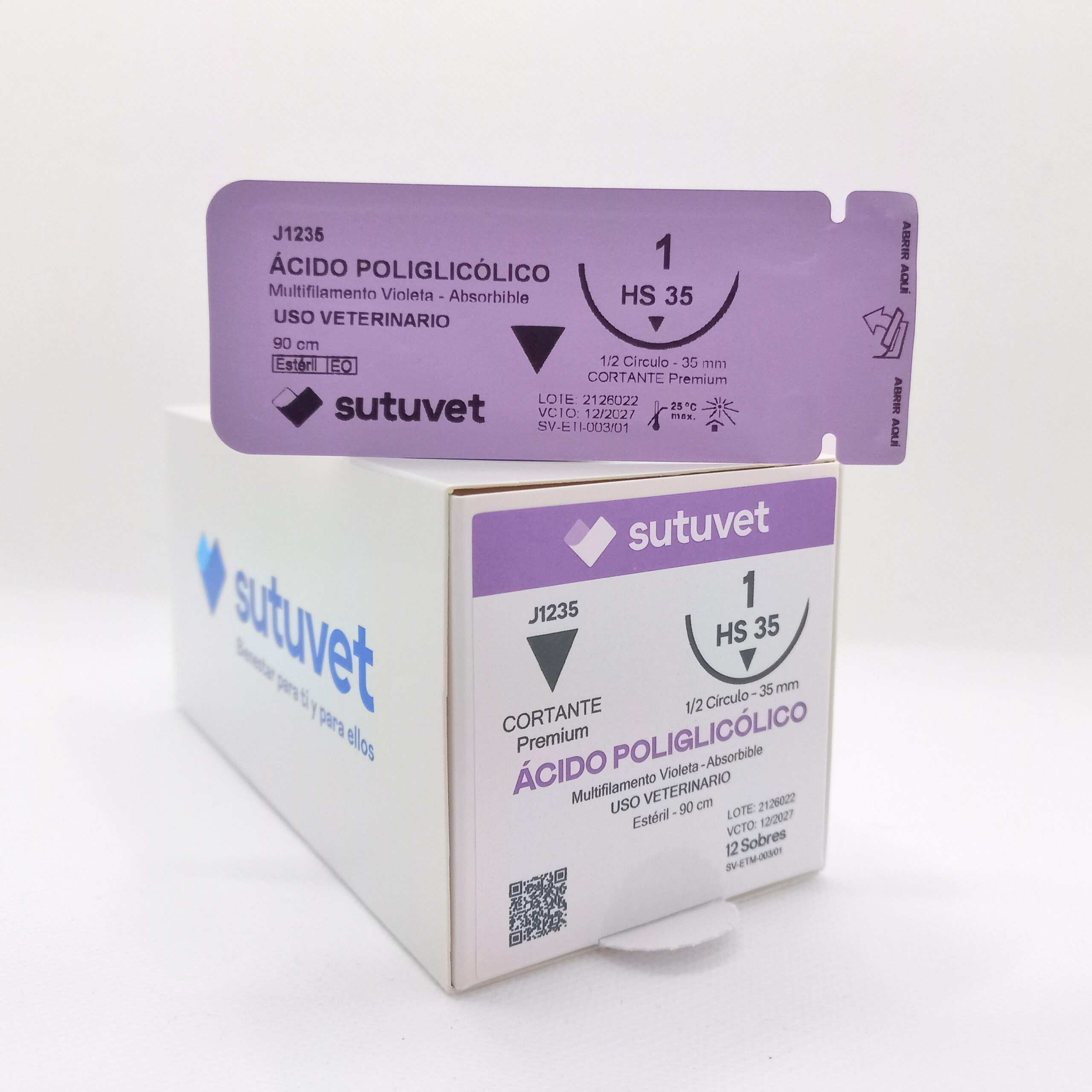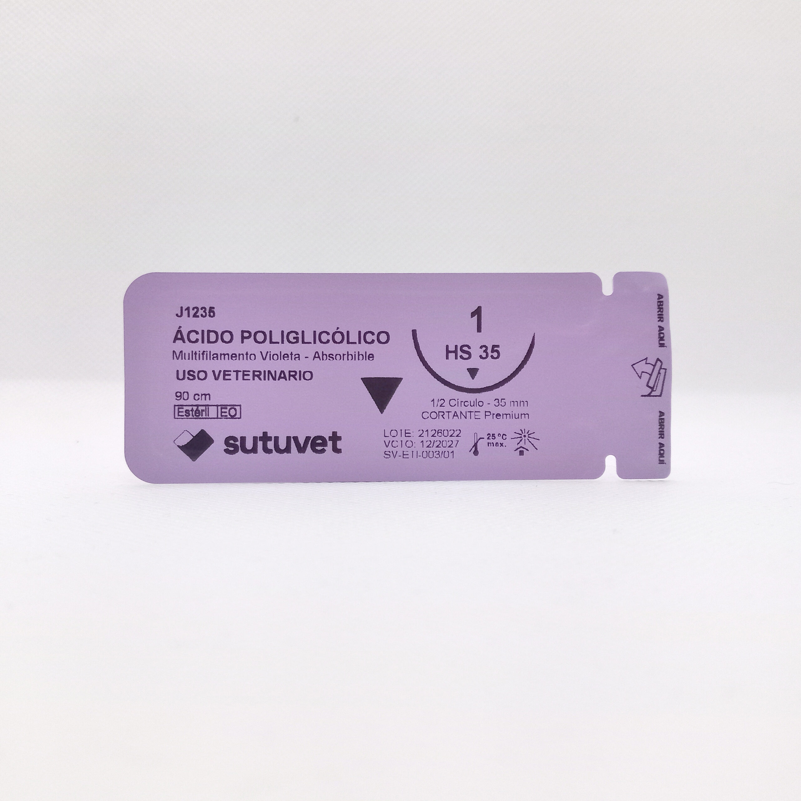 Suturas quirúrgicas veterinarias Sutuvet. LANR distribuciones, distribuidor autorizado Colombia. Sutura Multifilamento Absorbible de Ácido Poliglicólico, calibre 1, longitud de 90cm con aguja curva, medio circulo de 35 mm, punta traumática.