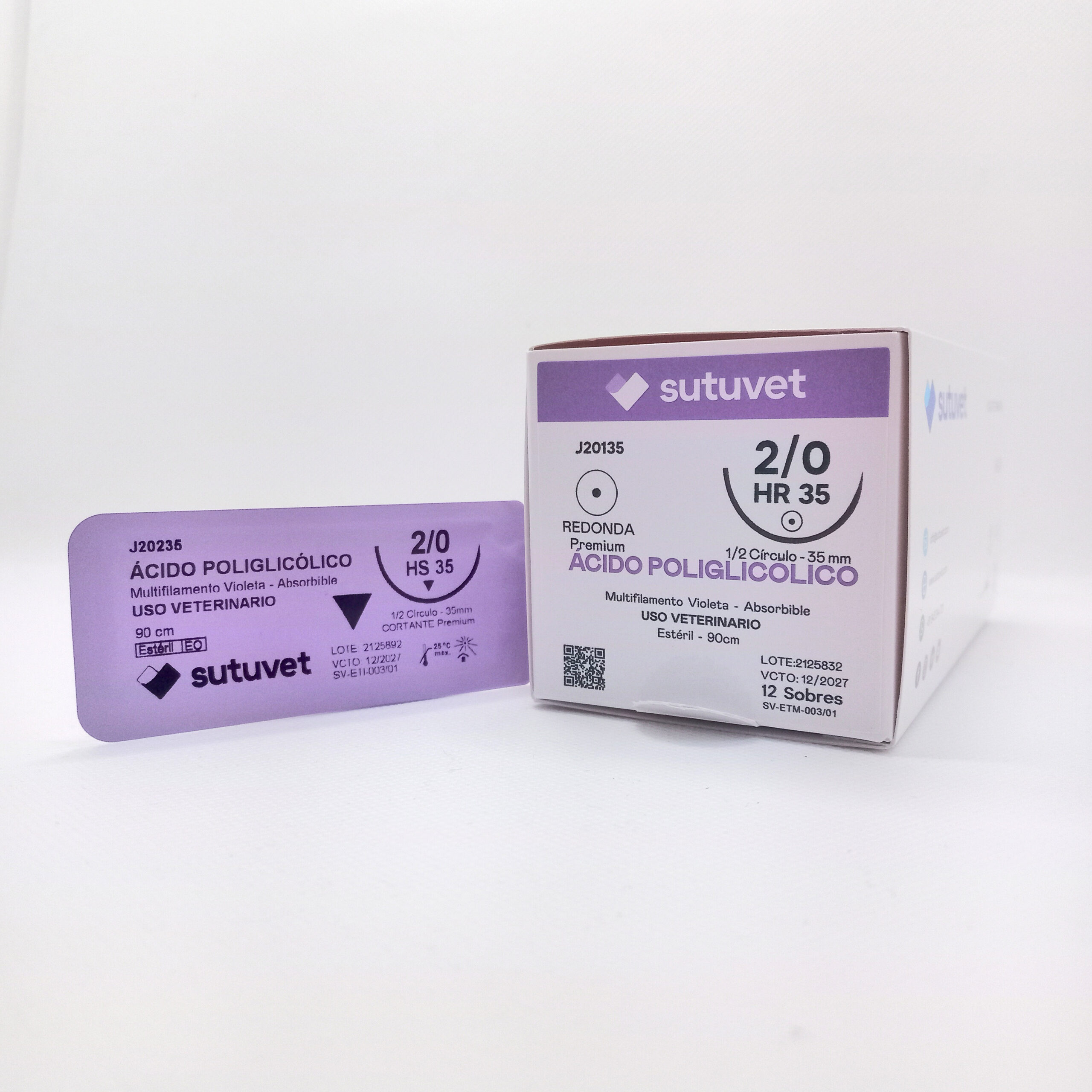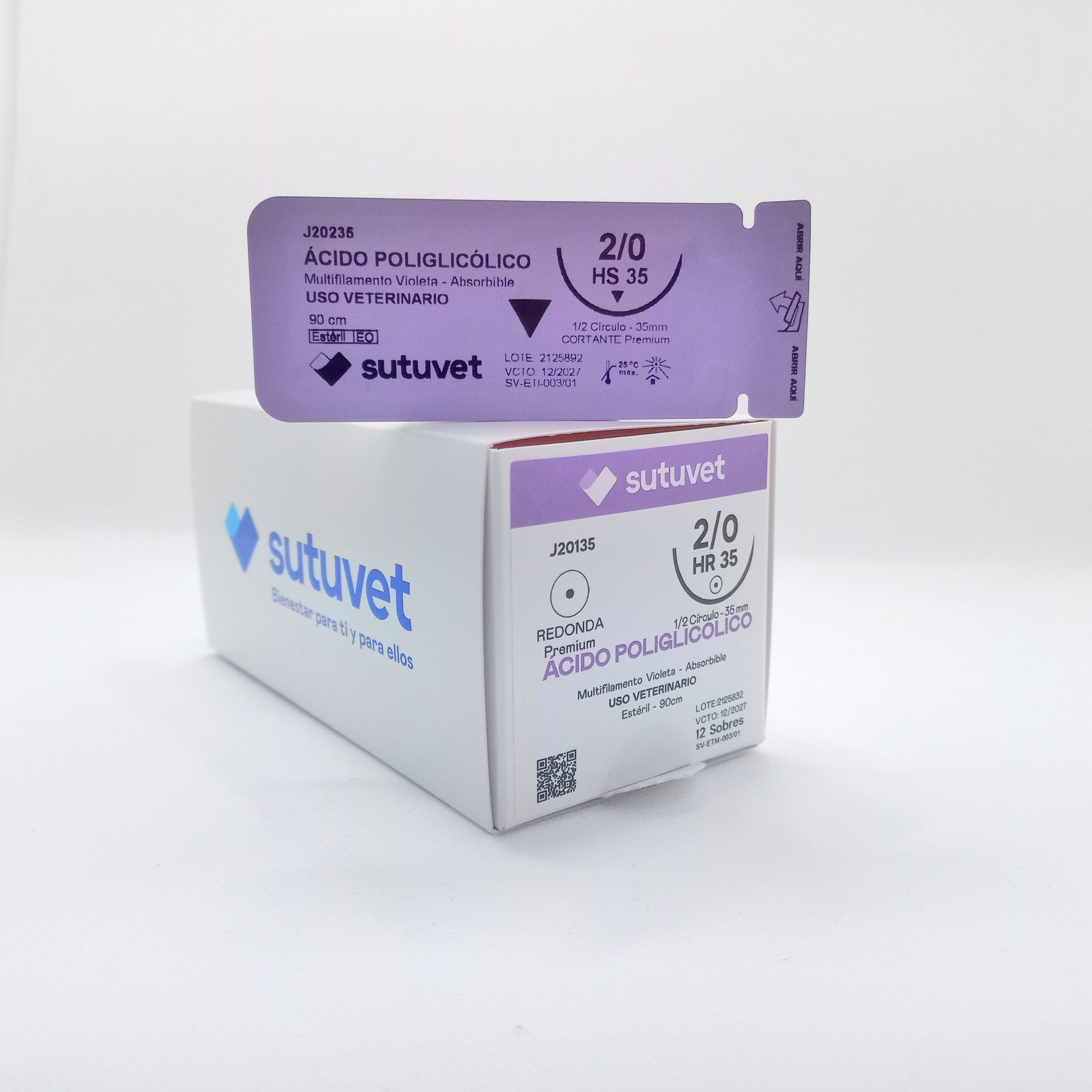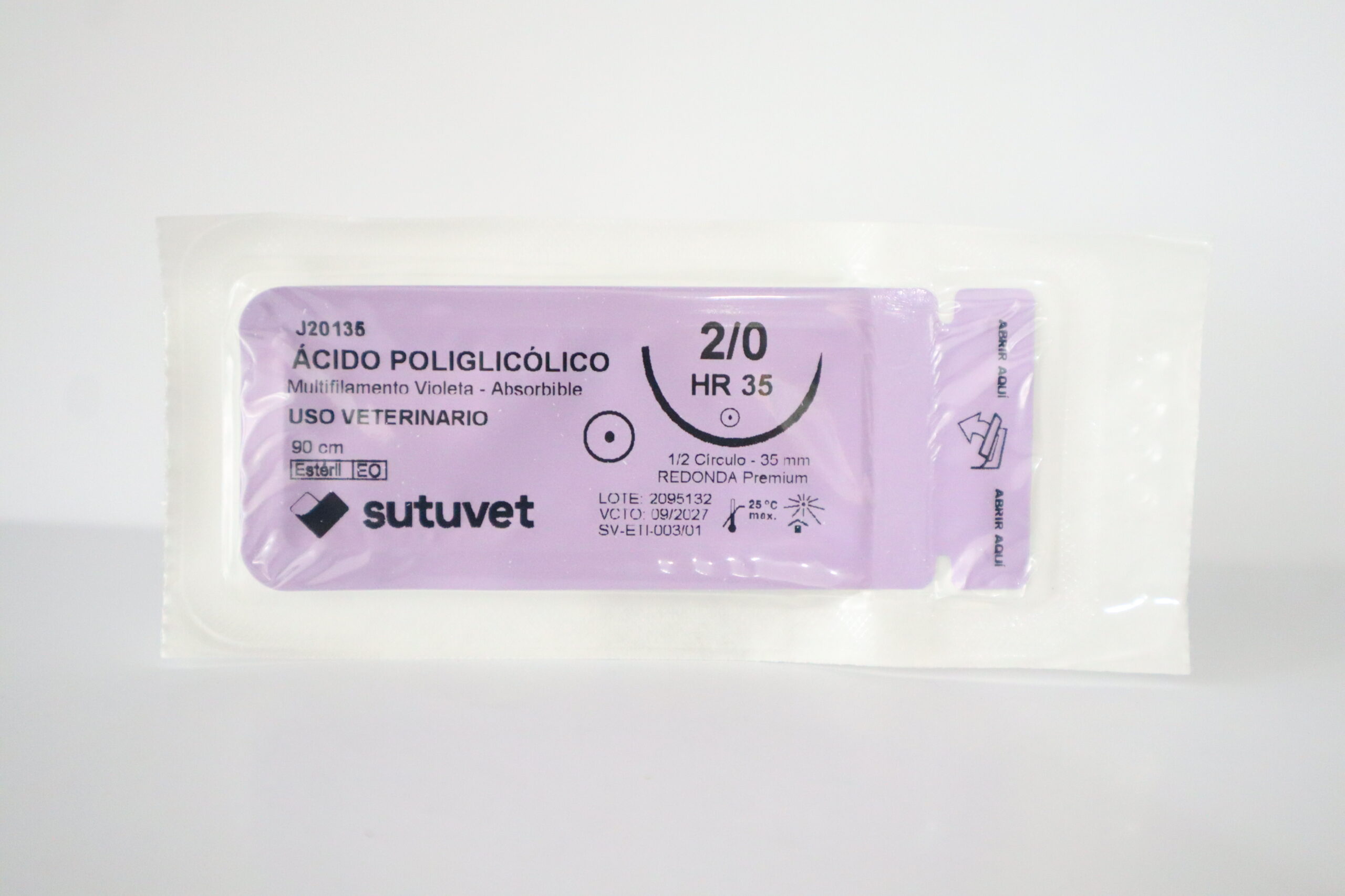 Suturas quirúrgicas veterinarias Sutuvet. LANR distribuciones, distribuidor autorizado Colombia. Sutura Multifilamento Absorbible de Ácido Poliglicólico, calibre 2/0, longitud de 90cm con aguja curva, medio circulo de 35 mm, punta atraumática.