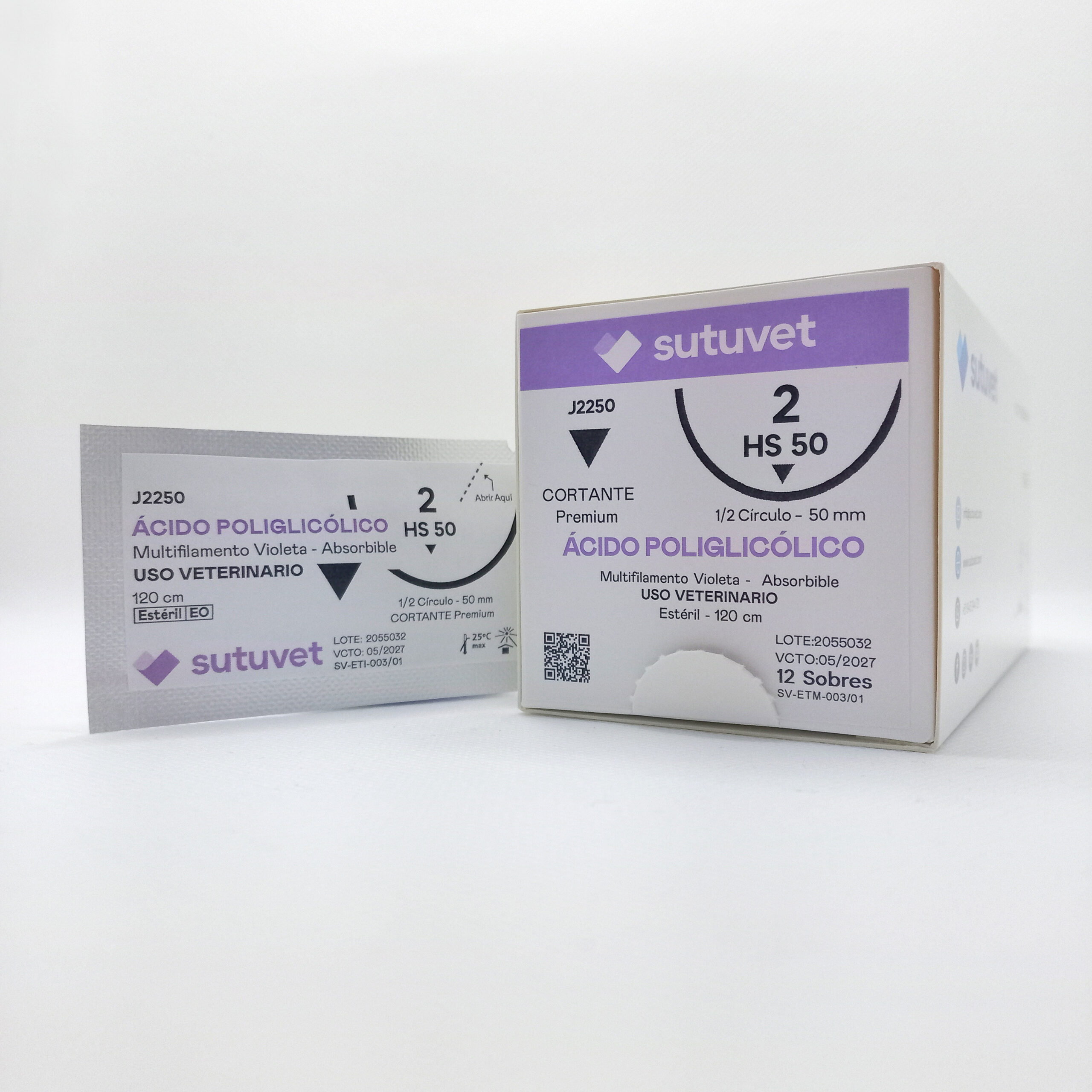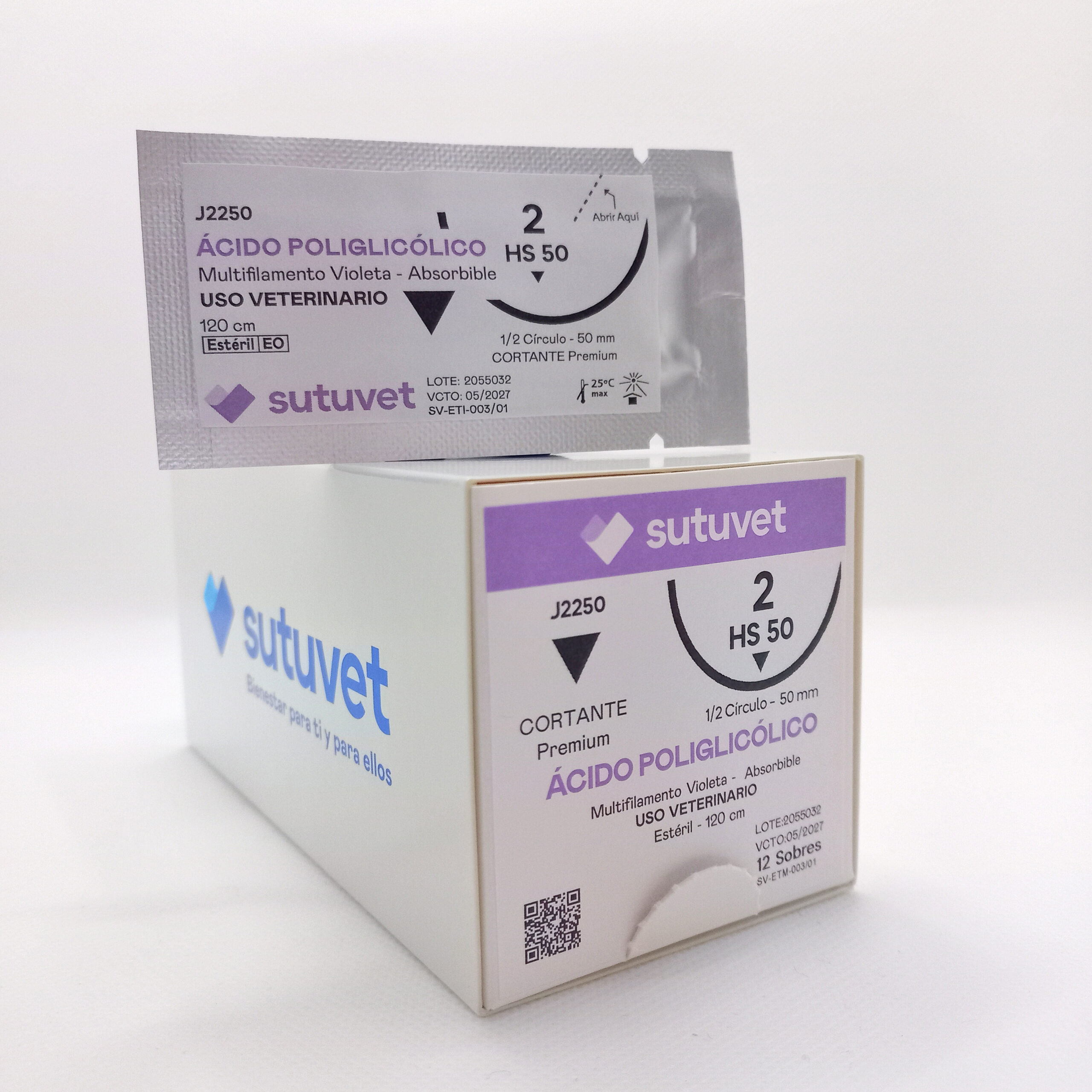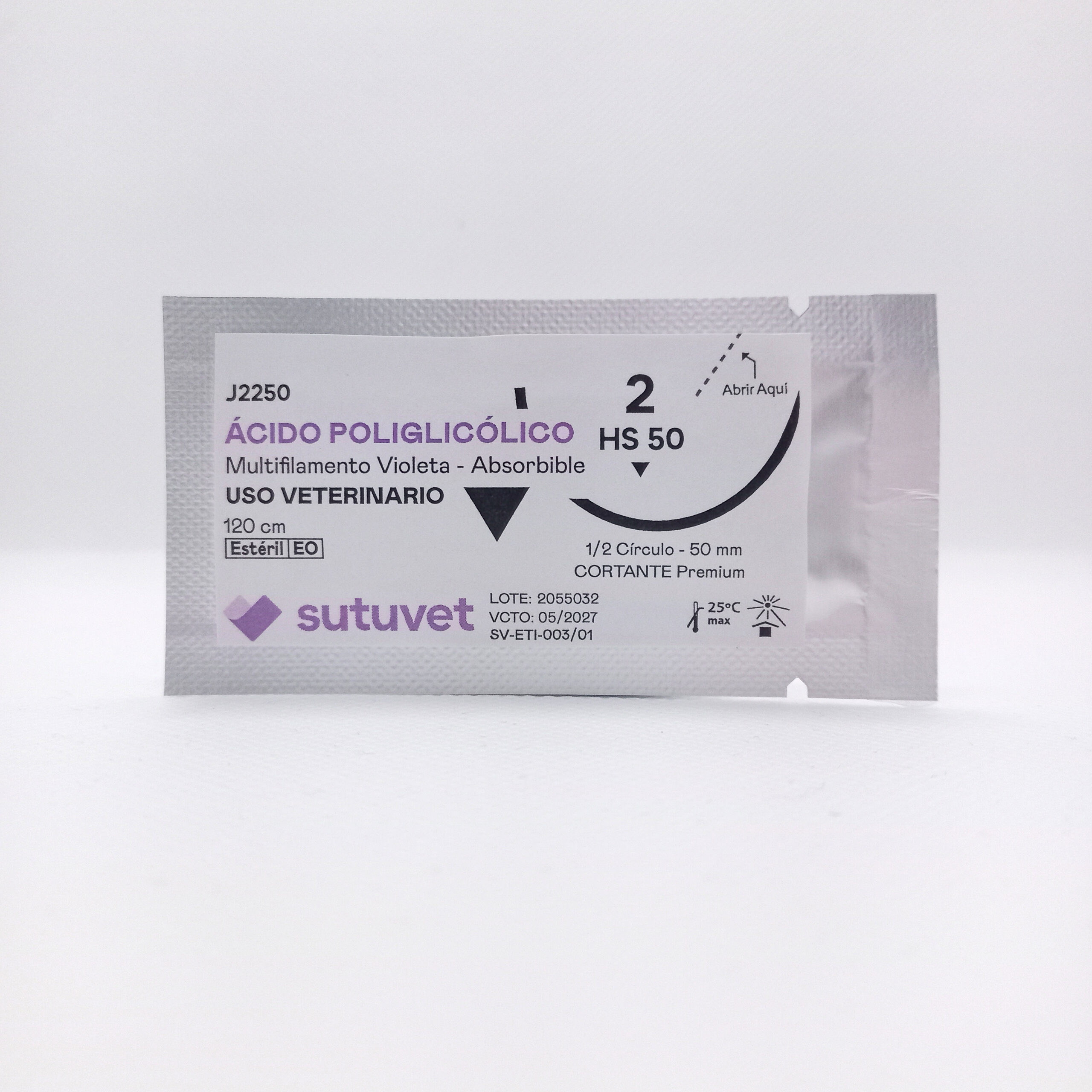 Suturas quirúrgicas veterinarias Sutuvet. LANR distribuciones, distribuidor autorizado Colombia. Sutura Multifilamento Absorbible de Ácido Poliglicólico, calibre 2, longitud de 120cm con aguja curva, medio circulo de 50 mm, punta traumática.