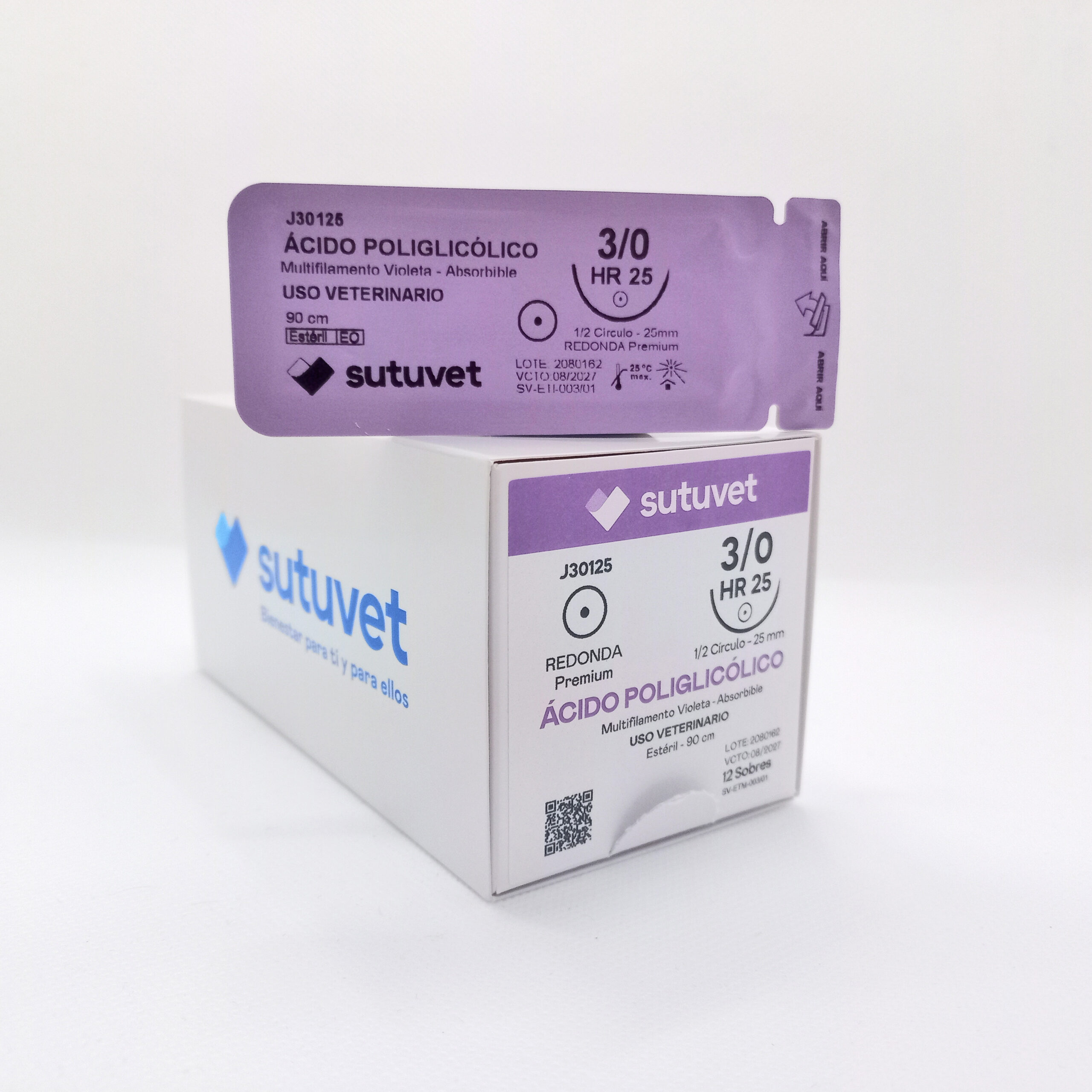 Suturas quirúrgicas veterinarias Sutuvet. LANR distribuciones, distribuidor autorizado Colombia. Sutura Multifilamento Absorbible de Ácido Poliglicólico, calibre 3/0, longitud de 90cm con aguja curva, medio circulo de 25 mm, punta atraumática.
