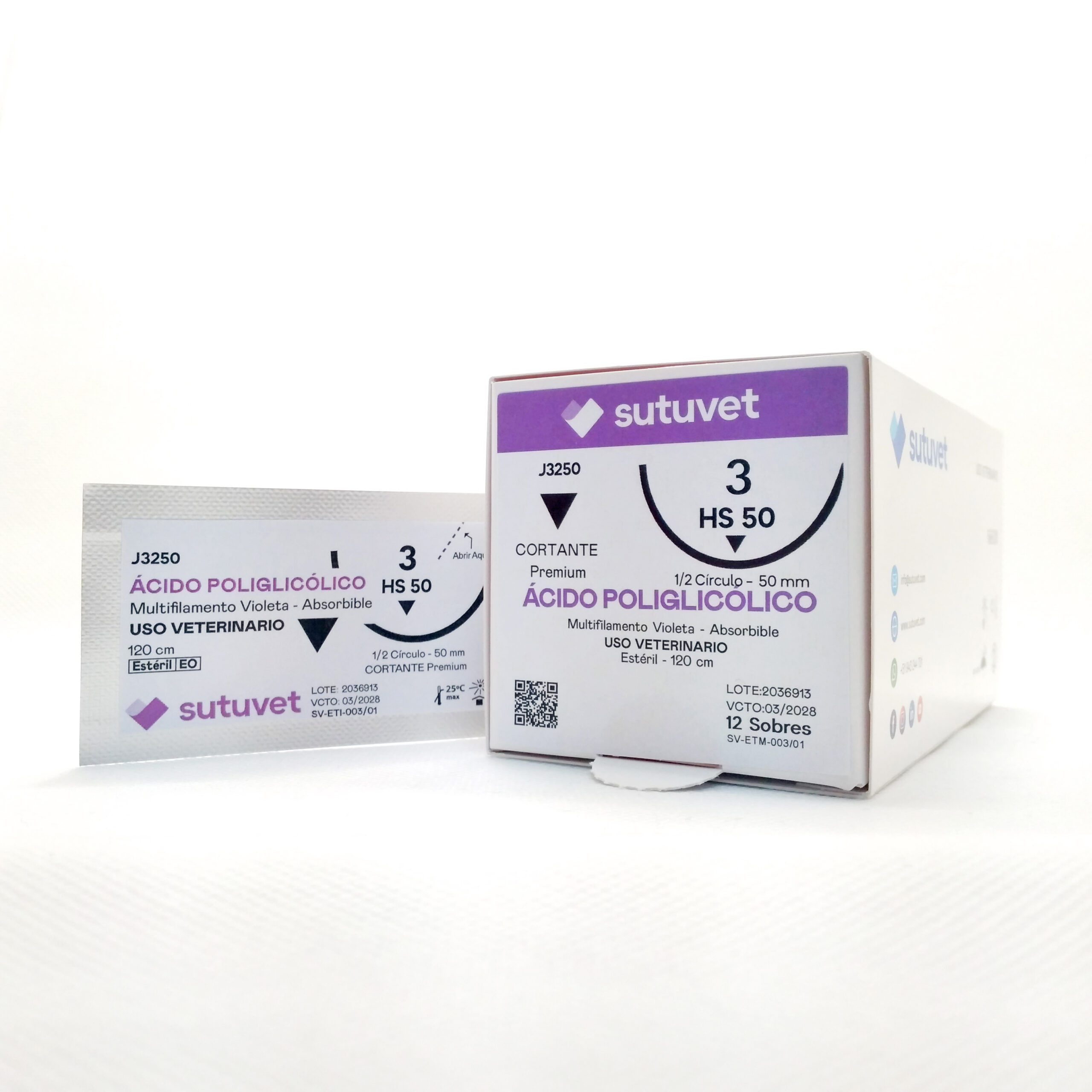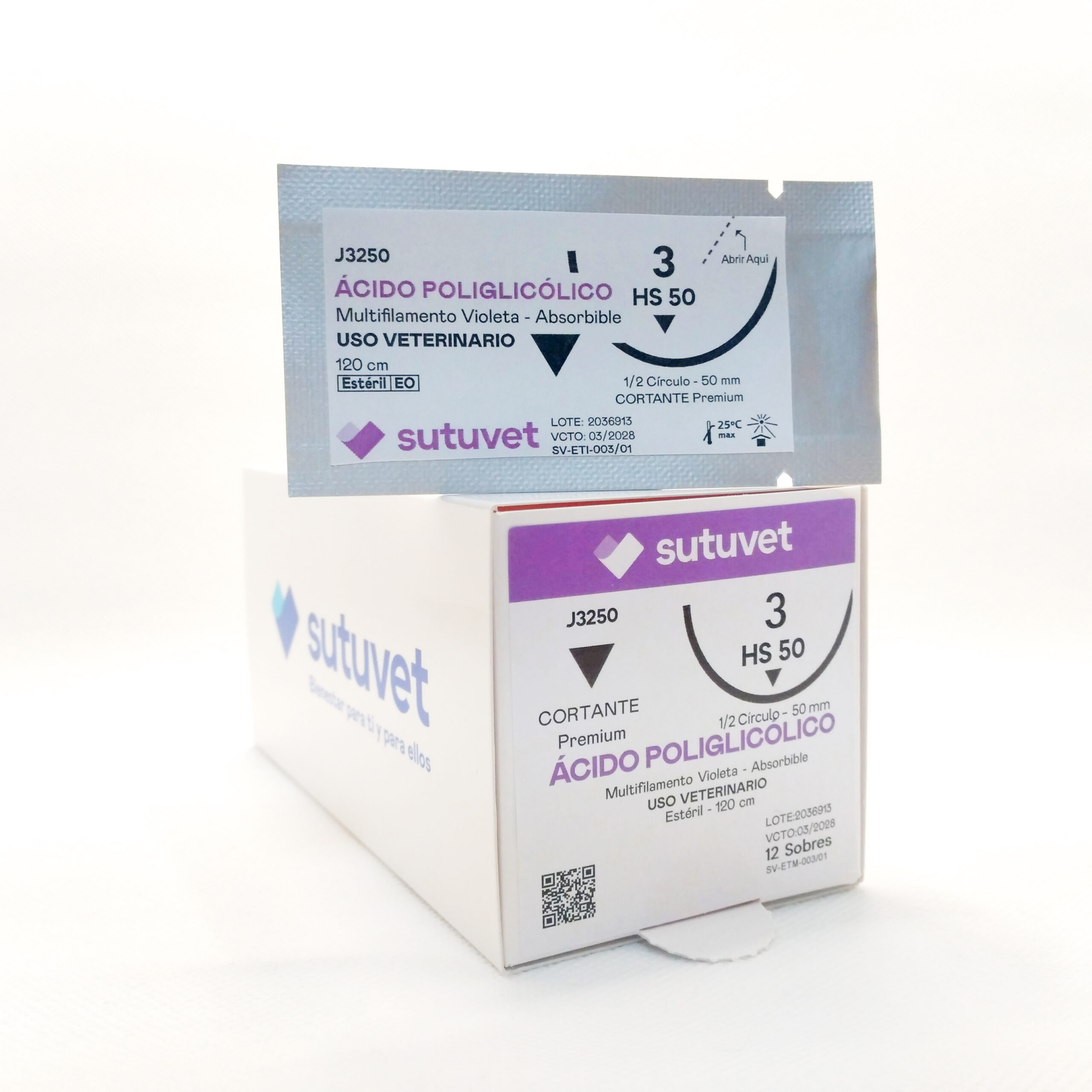 Suturas quirúrgicas veterinarias Sutuvet. LANR distribuciones, distribuidor autorizado Colombia. Sutura Multifilamento Absorbible de Ácido Poliglicólico, calibre 3, longitud de 120cm con aguja curva, medio circulo de 50 mm, punta traumática.