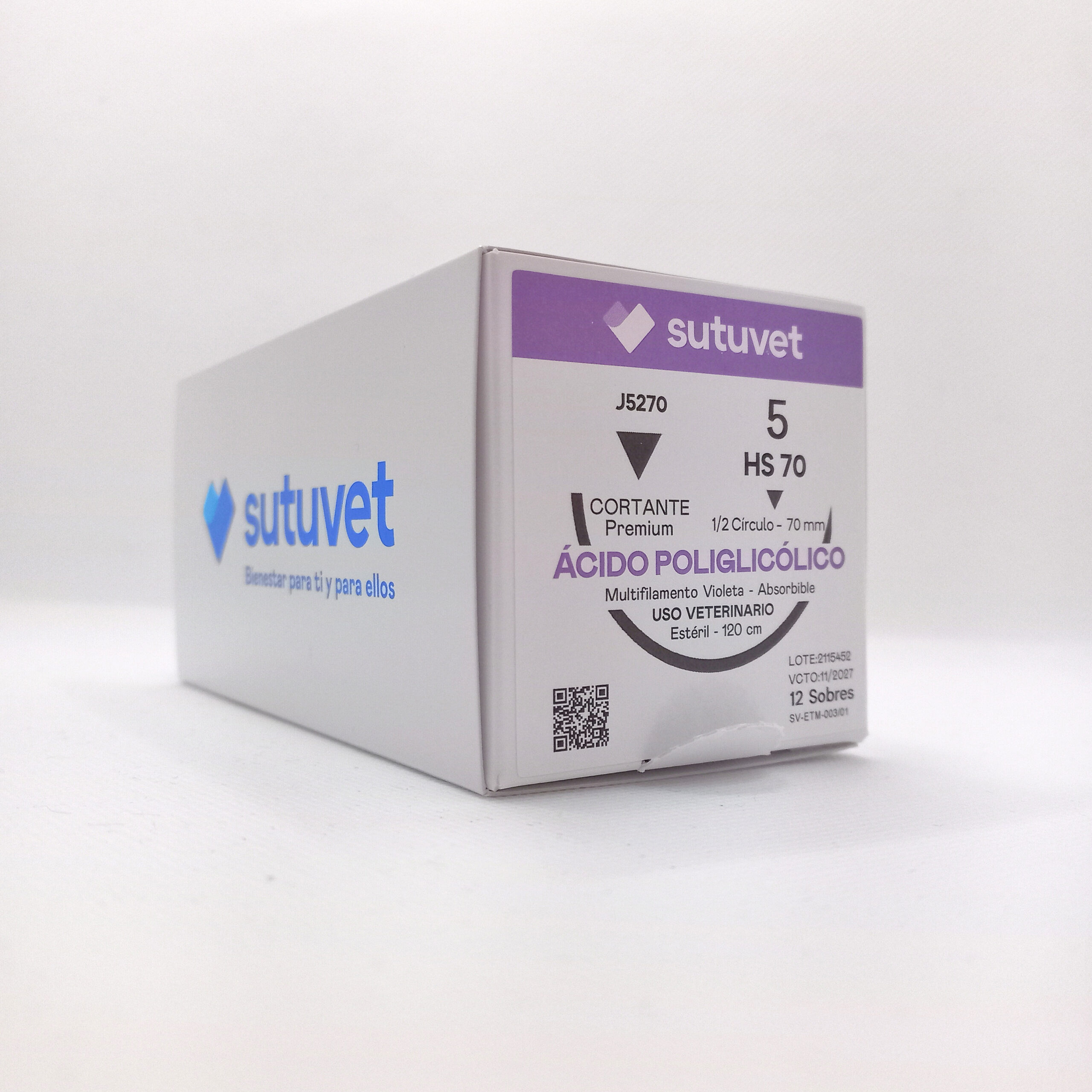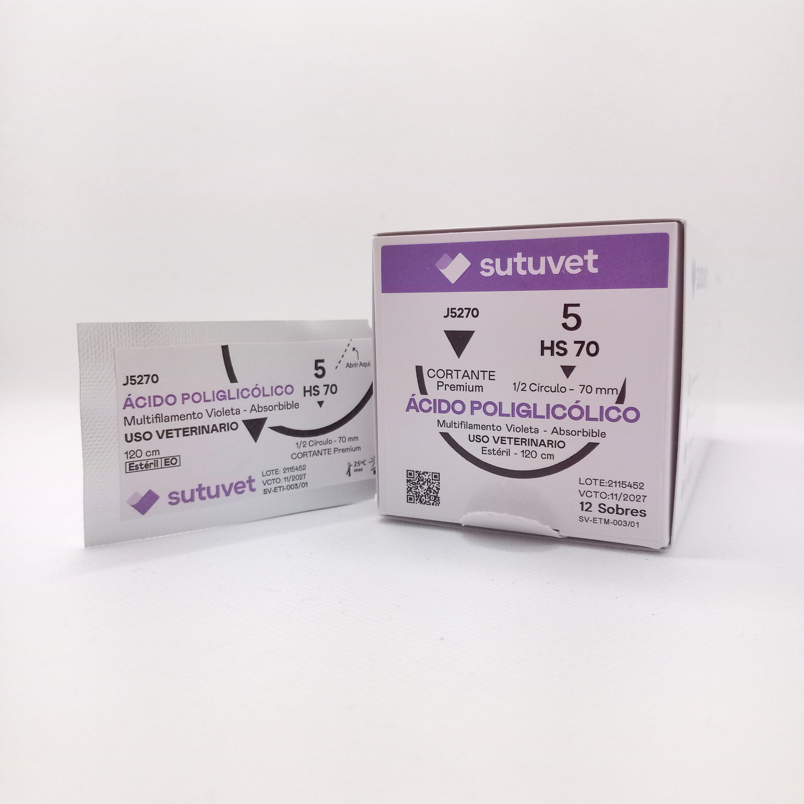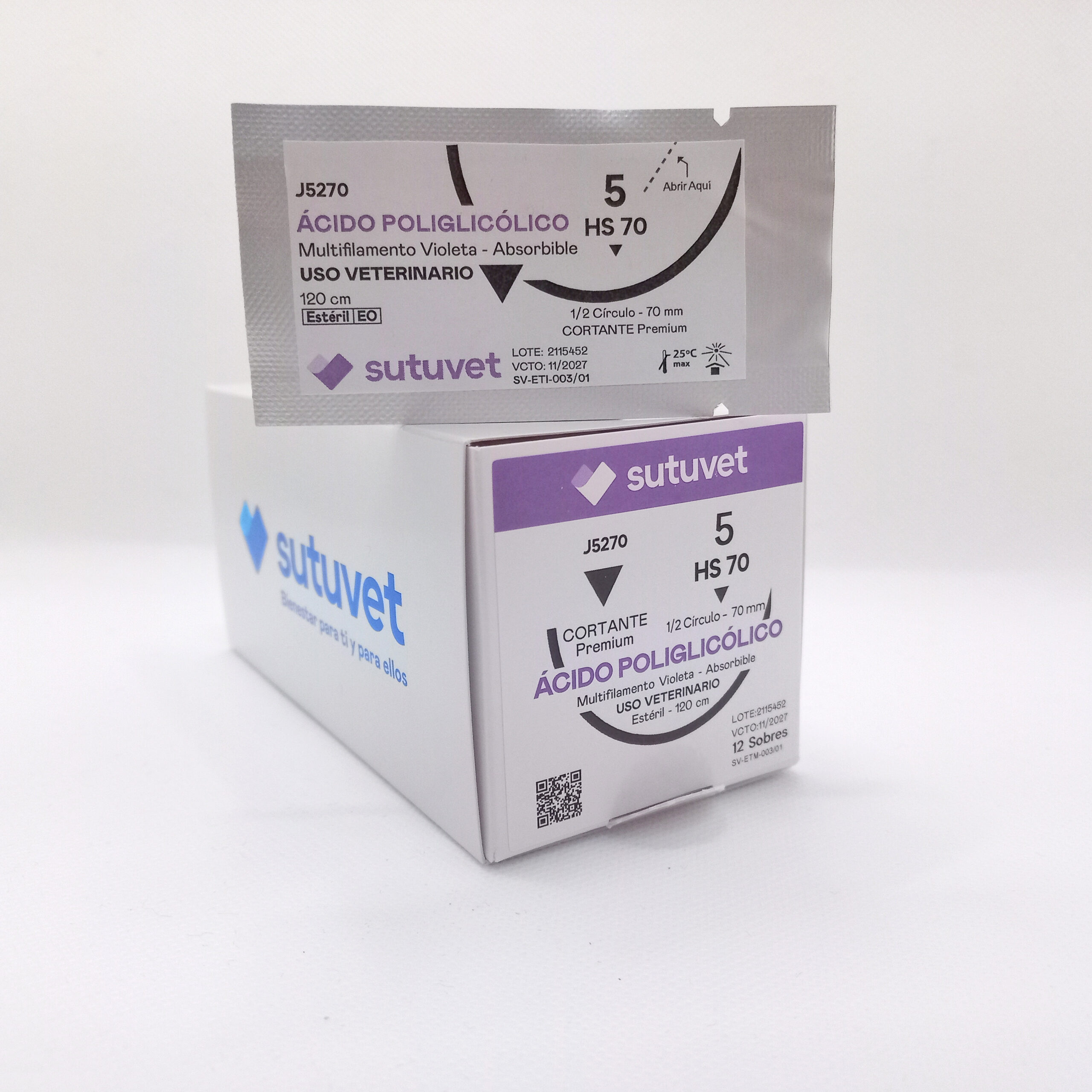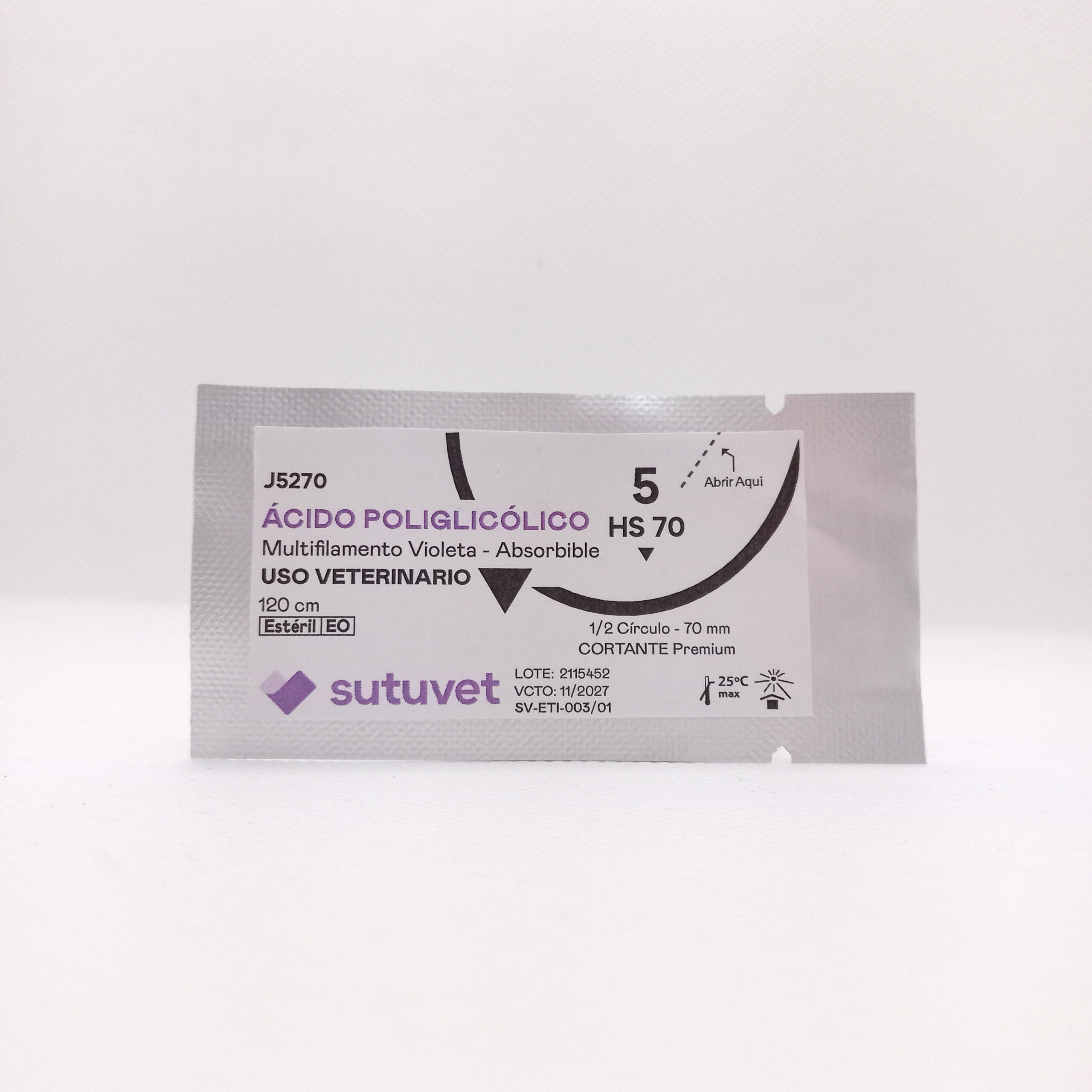 Suturas quirúrgicas veterinarias Sutuvet. LANR distribuciones, distribuidor autorizado Colombia. Sutura Multifilamento Absorbible de Ácido Poliglicólico, calibre 5, longitud de 120cm con aguja curva, medio circulo de 70 mm, punta traumática.