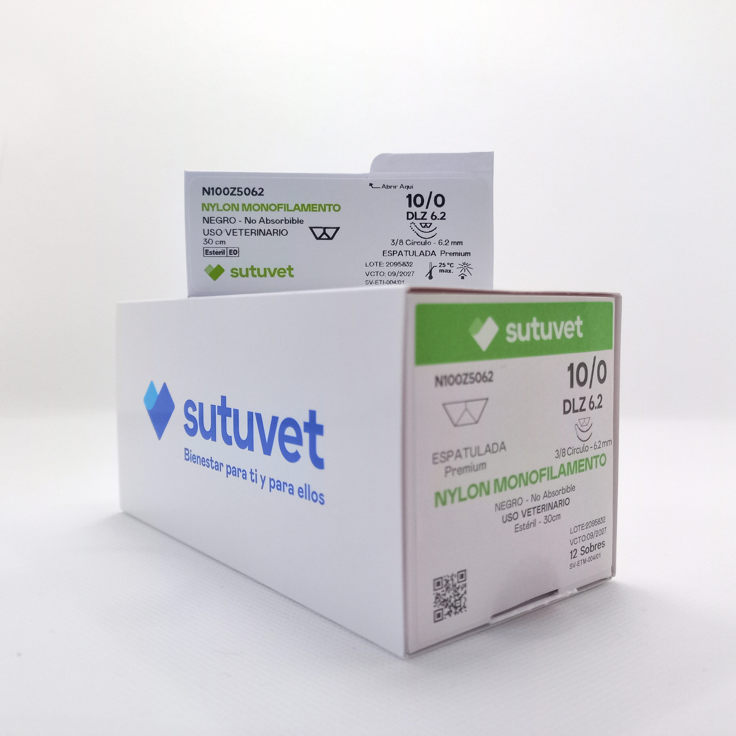 Sutuvet Colombia. Distribuidor exclusivo para Colombia, LANR Distribuciones. Sutura Monofilamento No absorbible de Nylon, calibre 10/0, longitud de 30cm con doble aguja curva, 3/8 de circulo de 6.2 mm, punta espatulada.