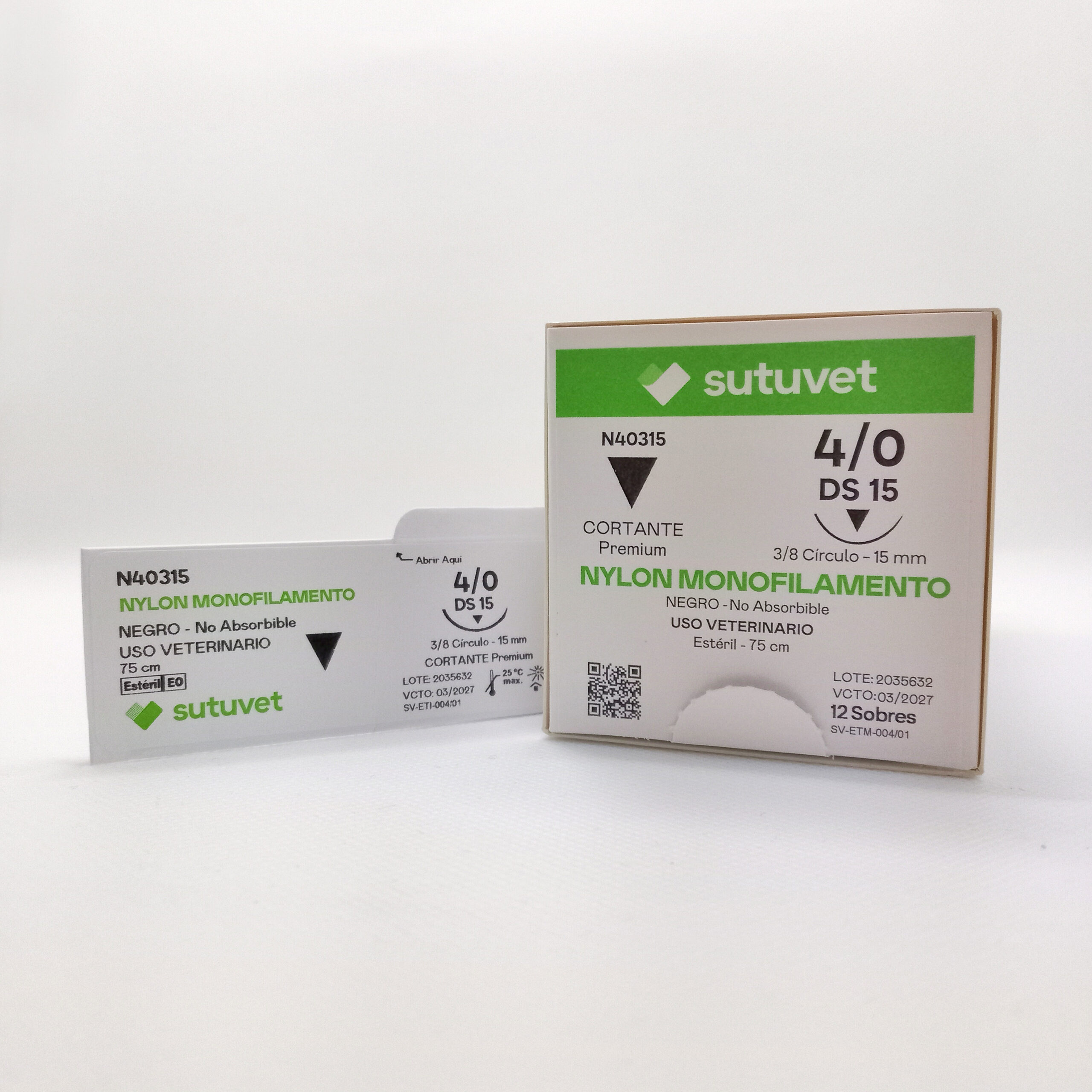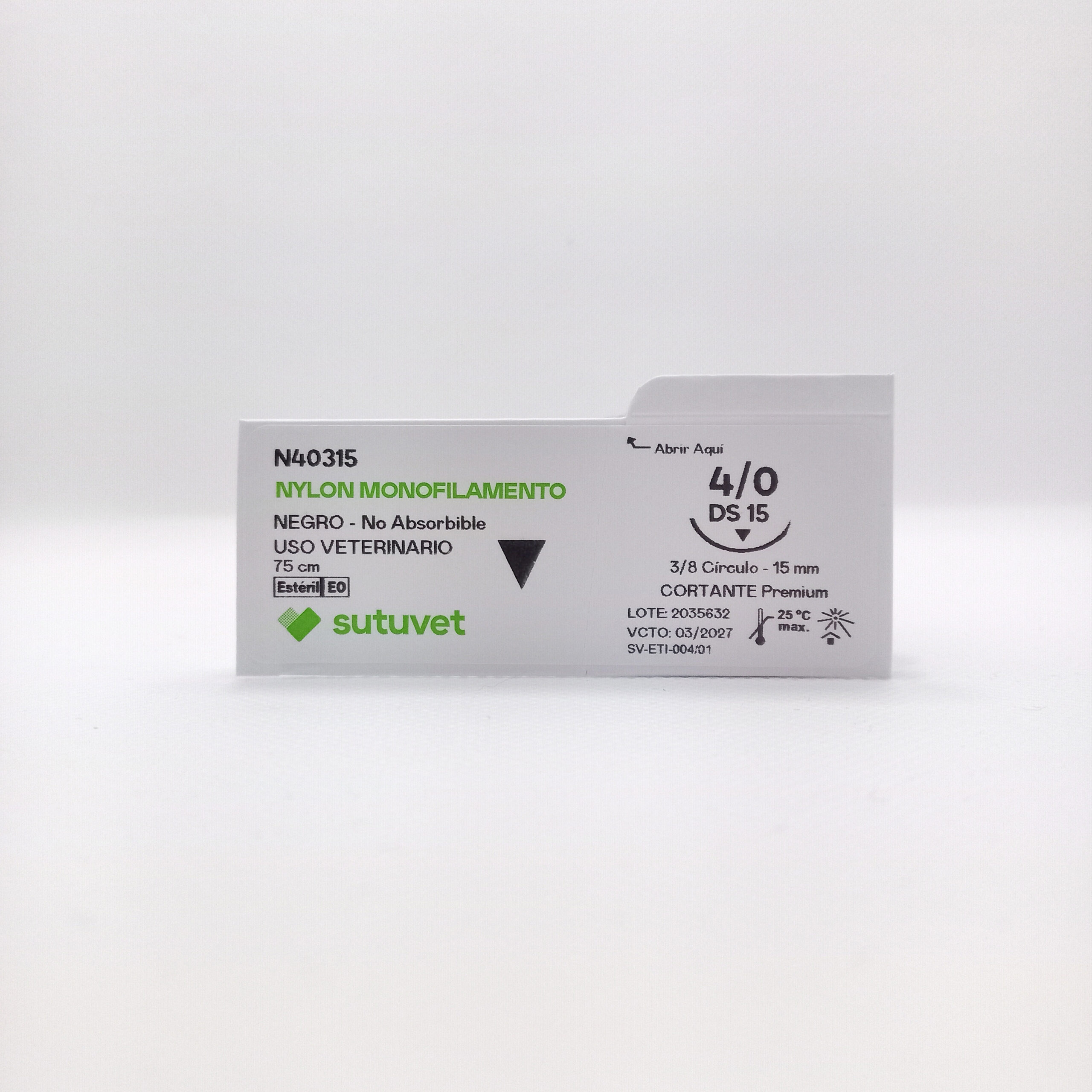 Suturas quirúrgicas veterinarias Sutuvet. LANR distribuciones, distribuidor autorizado Colombia. Sutura Monofilamento No absorbible de Nylon, calibre 4/0, longitud de 75cm con aguja curva, 3/8 de circulo de 15 mm, punta traumática.