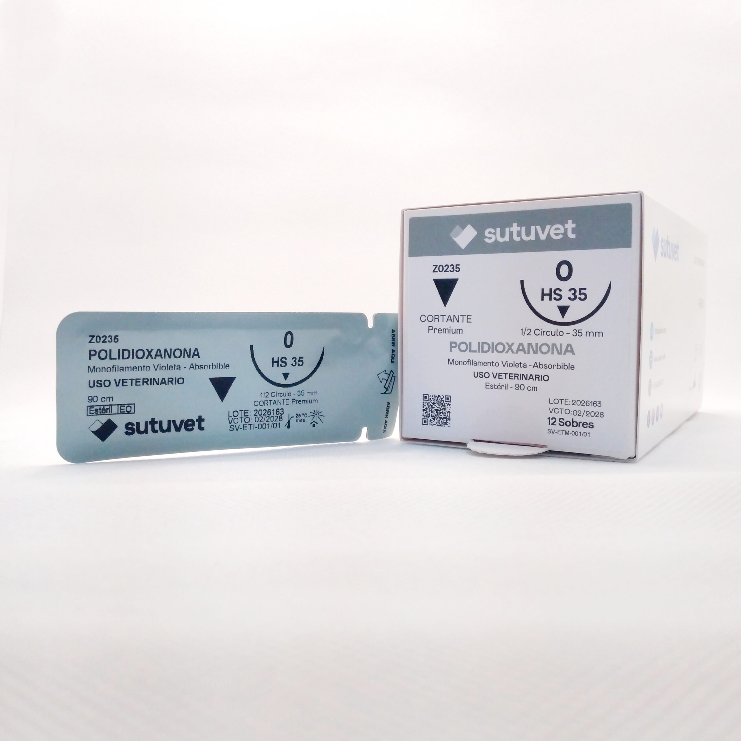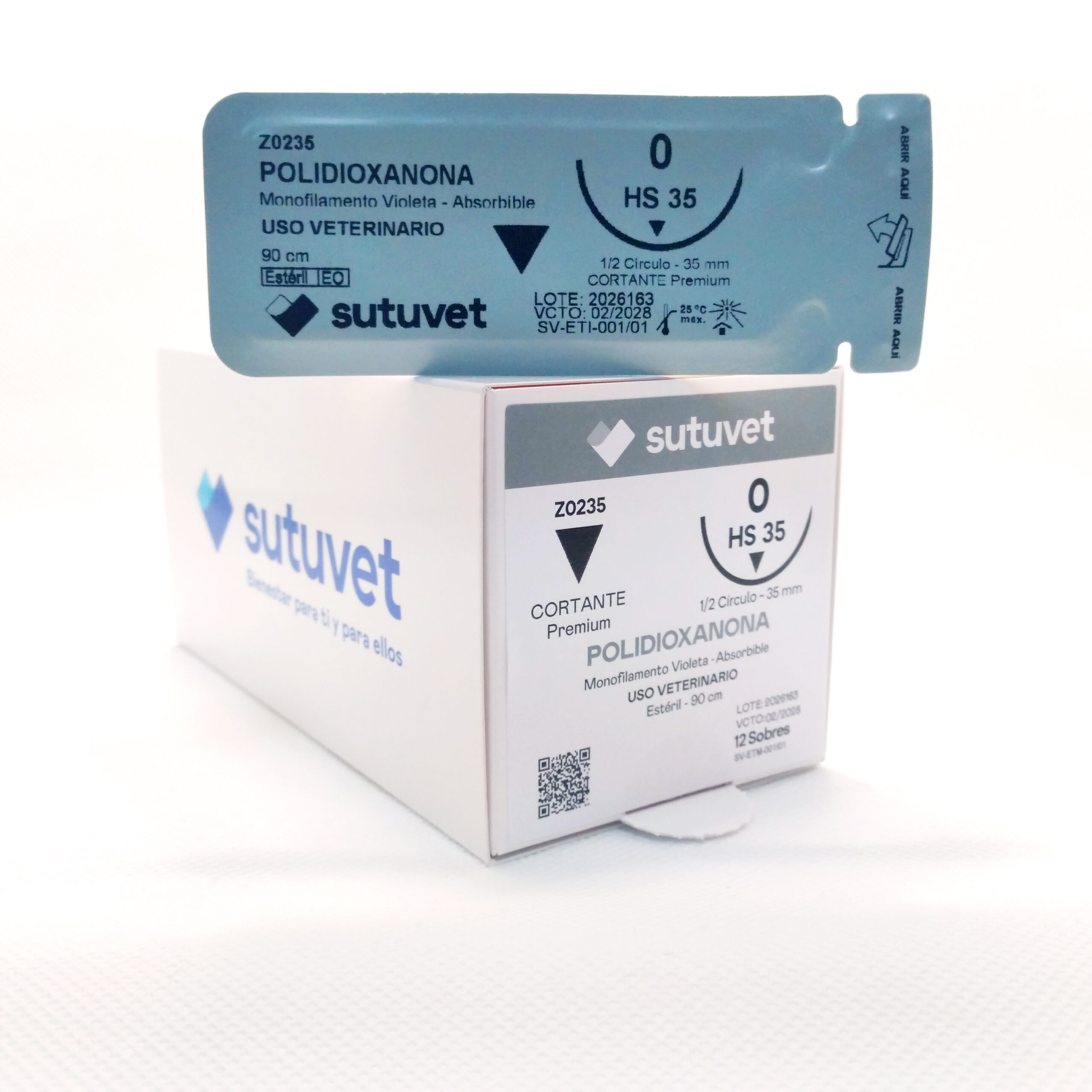 Sutuvet Colombia. Distribuidor exclusivo para Colombia, LANR Distribuciones. Sutura Monofilamento Absorbible de Polidioxanona, calibre 0, longitud de 90cm con aguja curva, medio circulo de 35 mm, punta traumática. Tiempo de absorción 120-180 días.