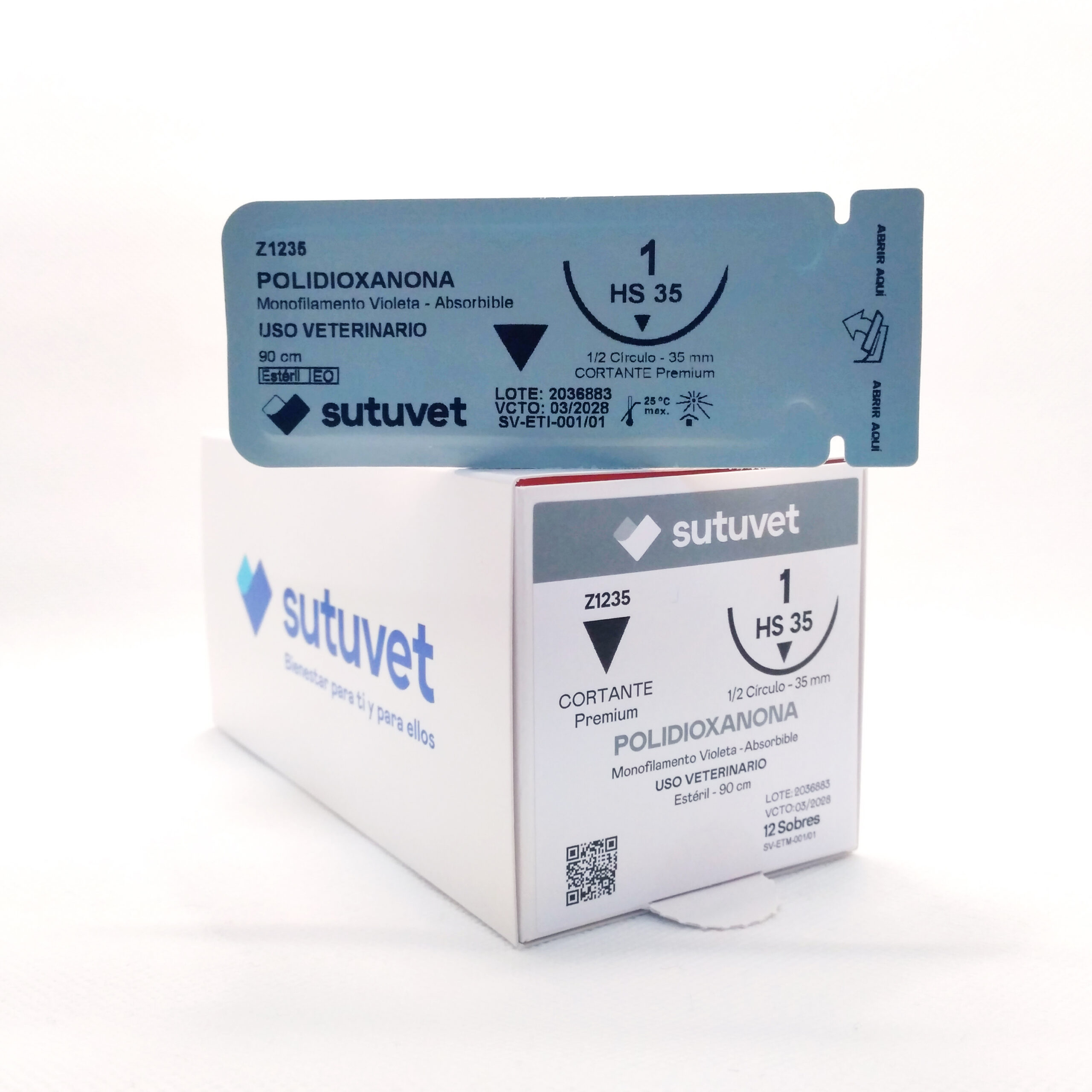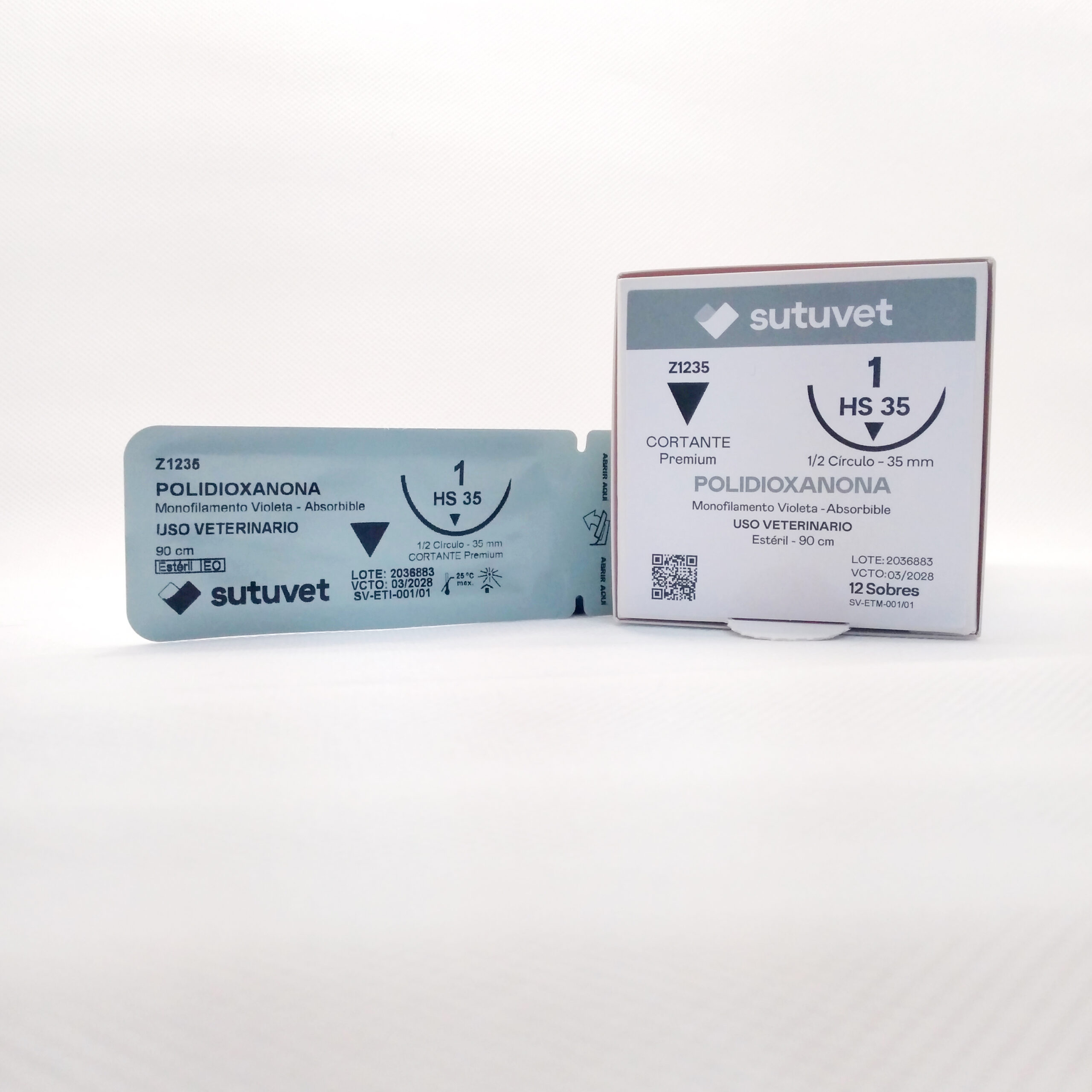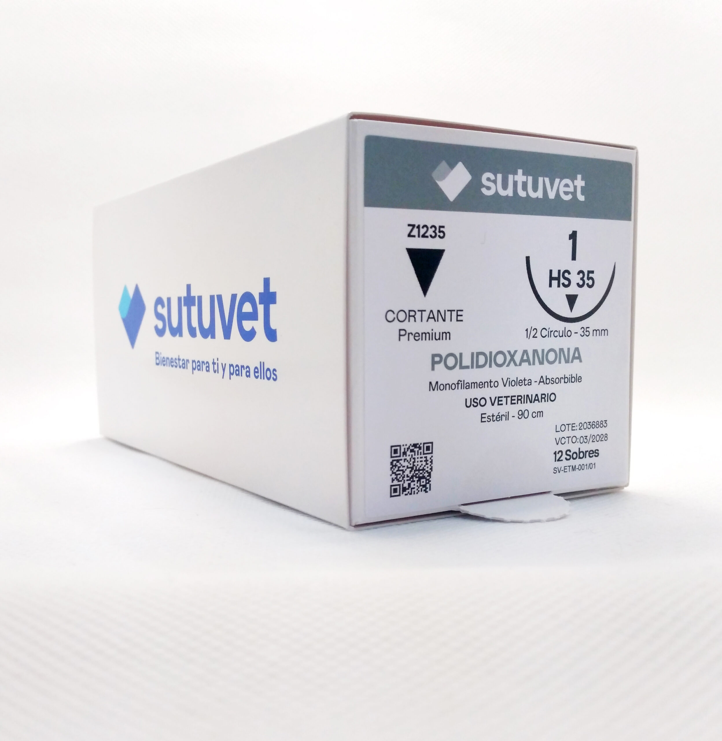 Sutuvet Colombia. Distribuidor exclusivo para Colombia, LANR Distribuciones. Sutura Monofilamento Absorbible de Polidioxanona, calibre 1, longitud de 90cm con aguja curva, medio circulo de 35 mm, punta traumática. Tiempo de absorción 120-180 días.