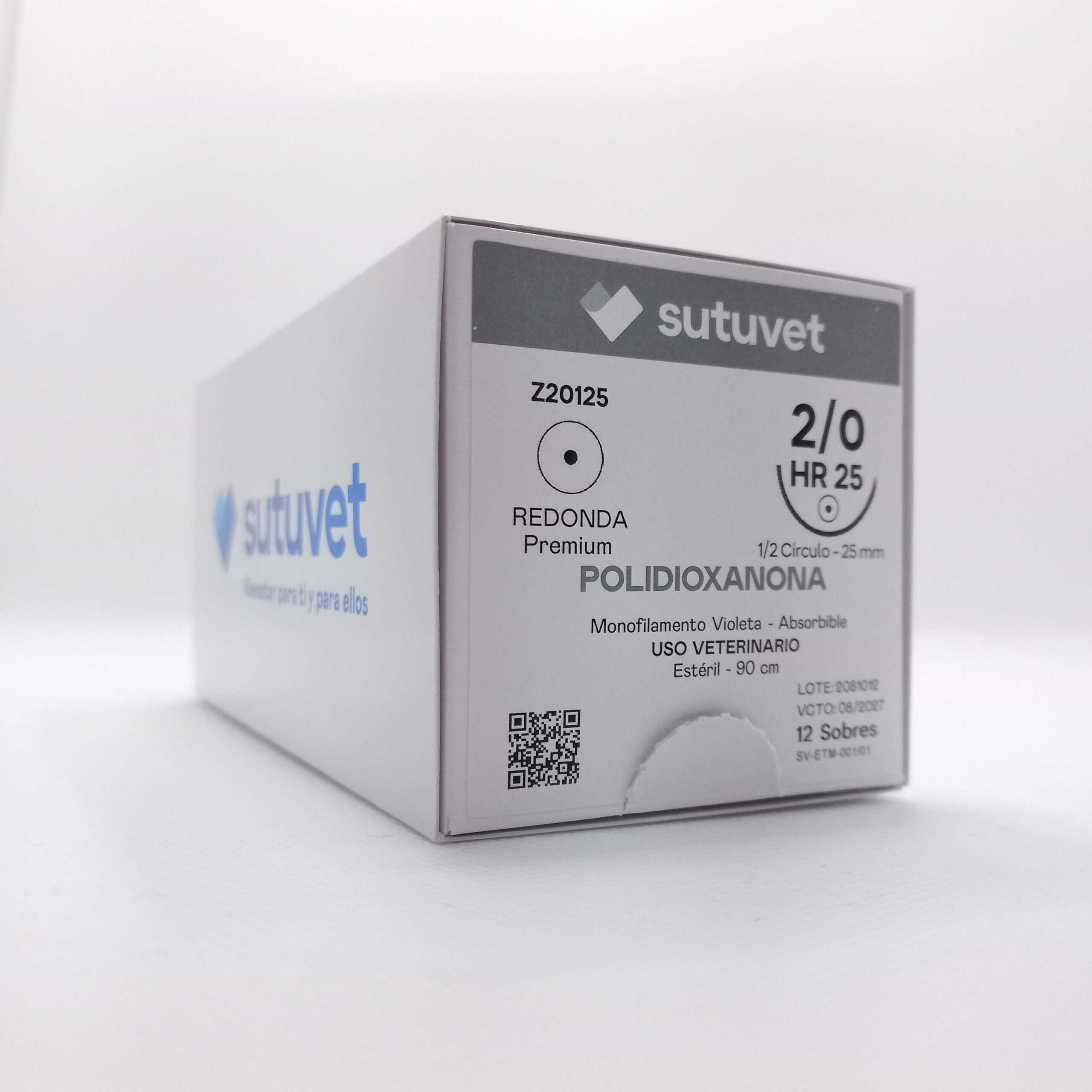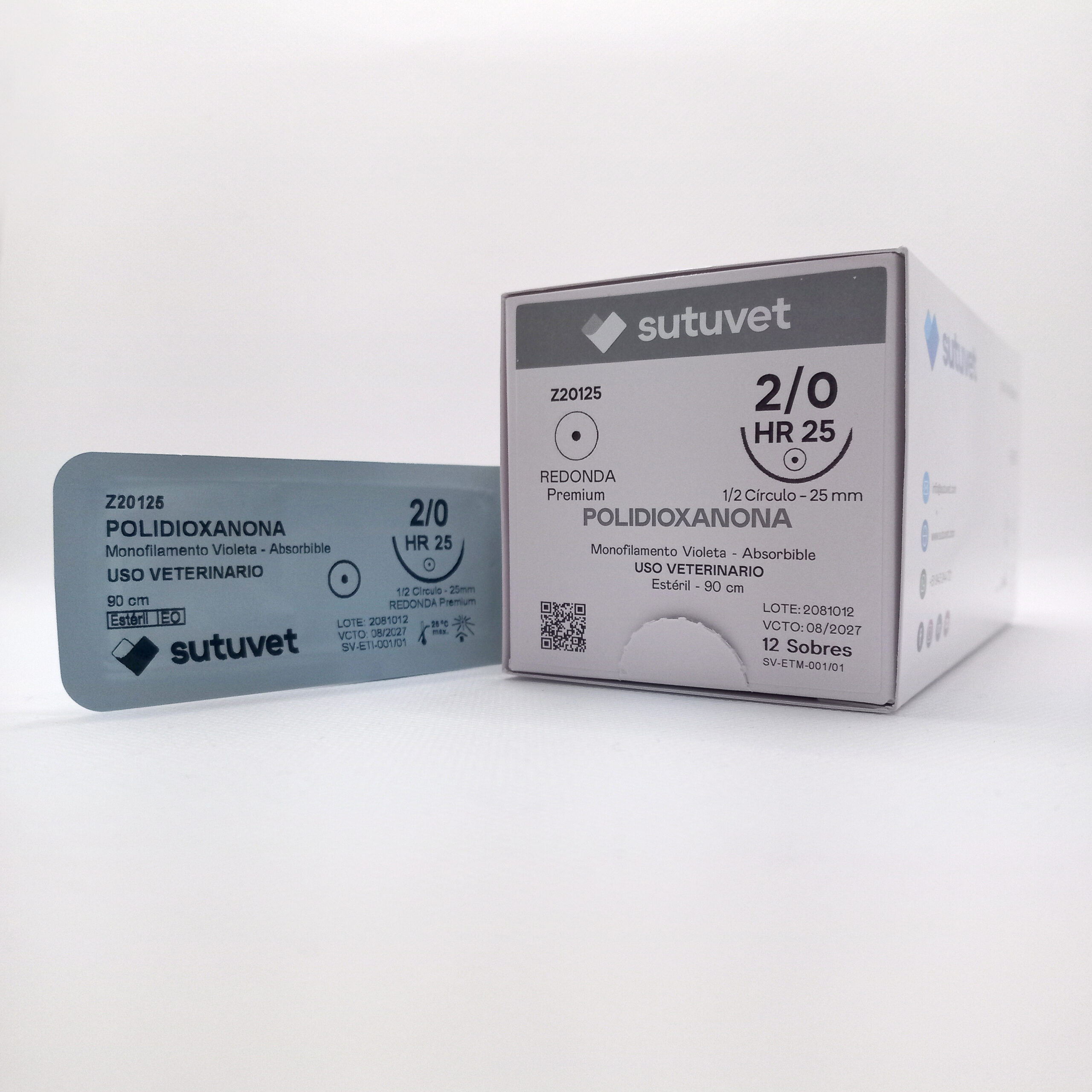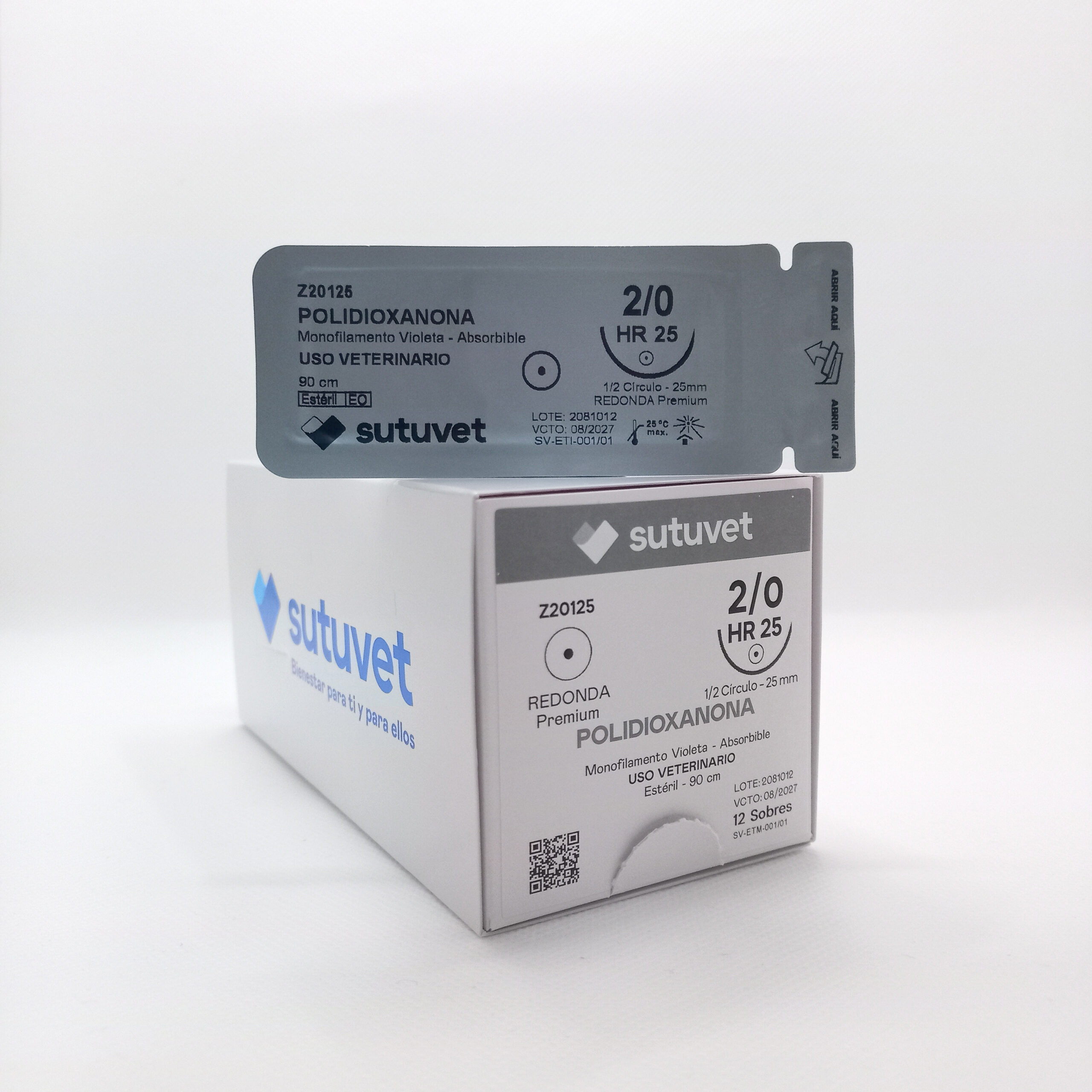 Sutuvet Colombia. Distribuidor exclusivo para Colombia, LANR Distribuciones. Sutura Monofilamento Absorbible de Polidioxanona, calibre 2/0, longitud de 90cm con aguja curva, medio circulo de 25 mm, punta atraumática. Tiempo de absorción 120-180 días.