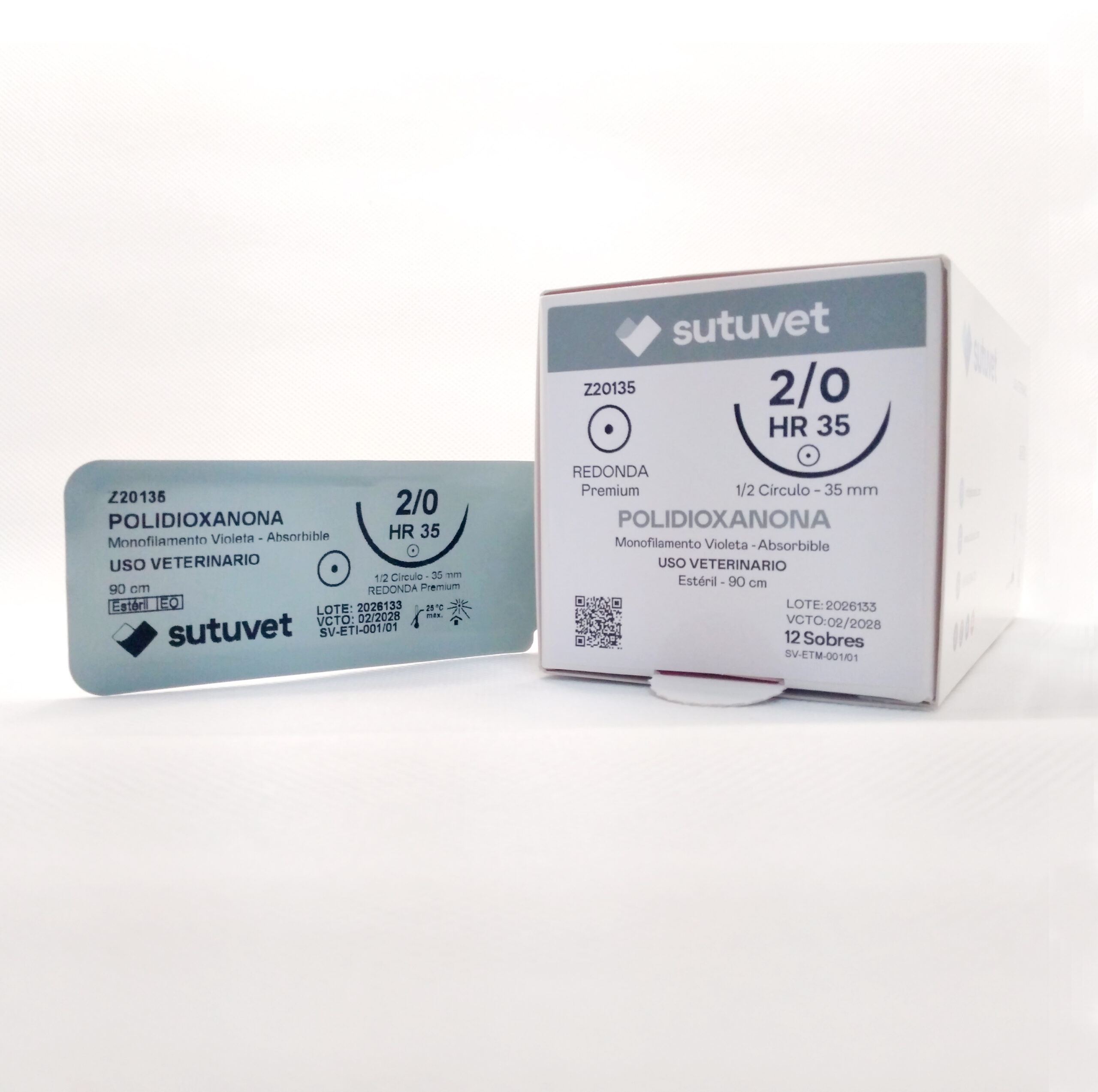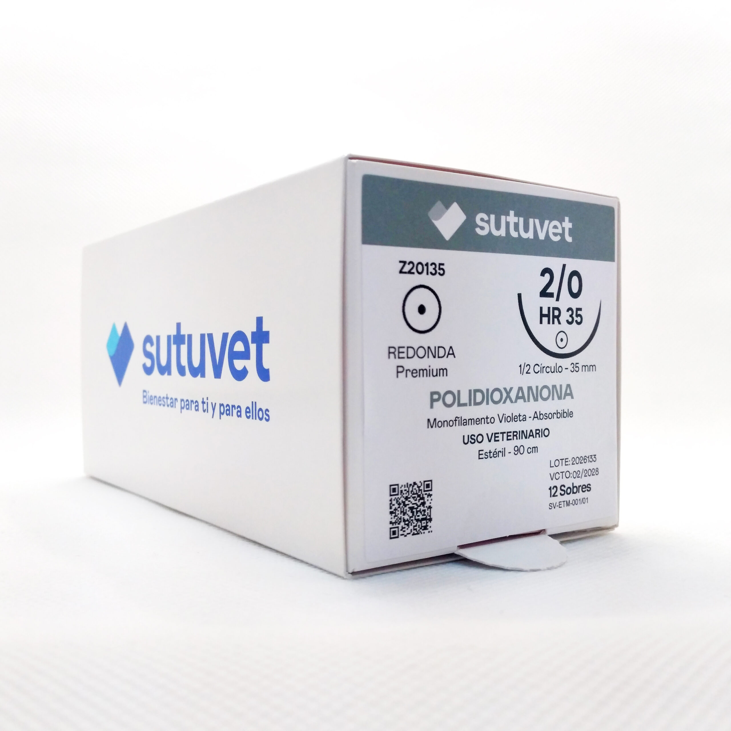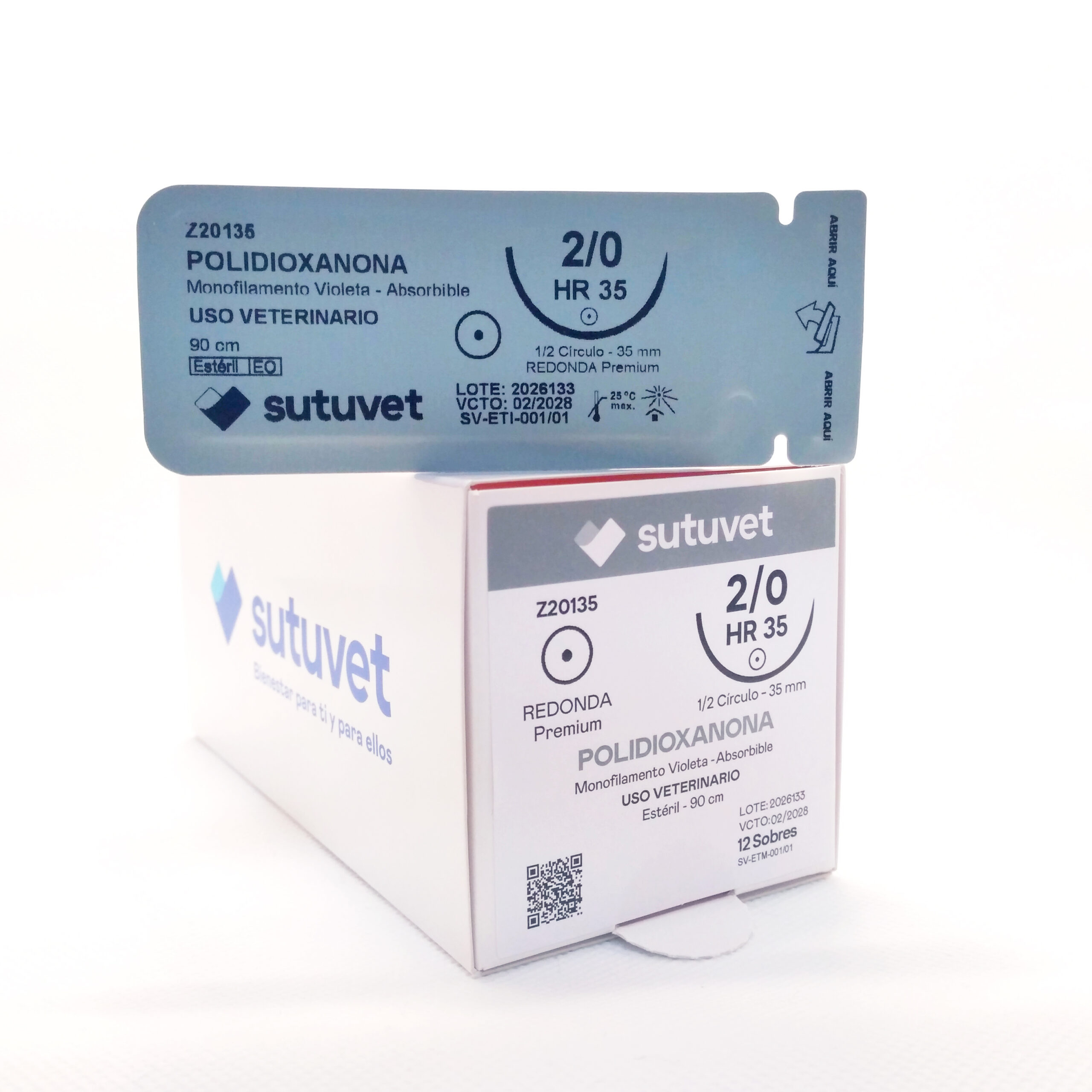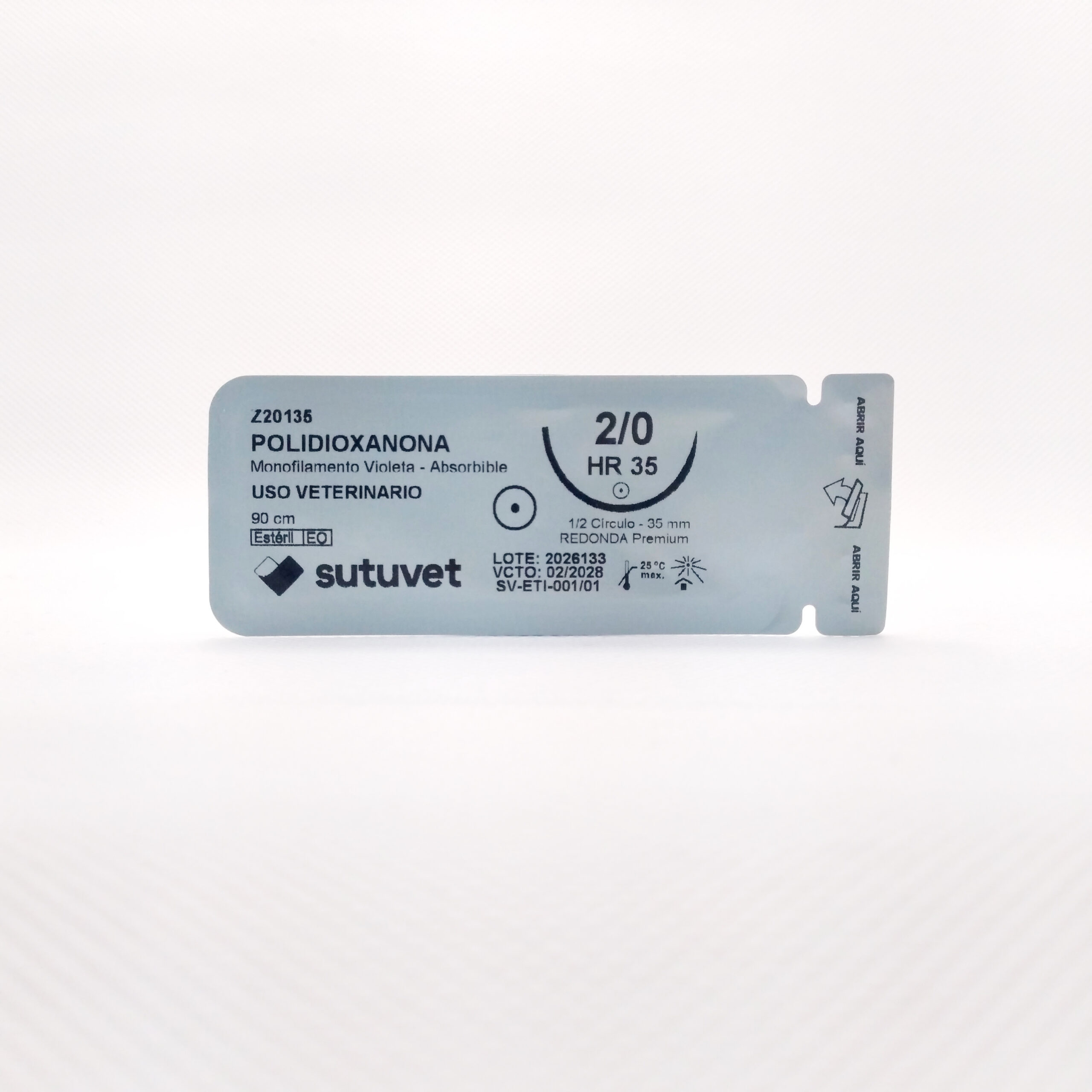 Sutuvet Colombia. Distribuidor exclusivo para Colombia, LANR Distribuciones. Sutura Monofilamento Absorbible de Polidioxanona, calibre 2/0, longitud de 90cm con aguja curva, medio circulo de 35 mm, punta atraumática. Tiempo de absorción 120-180 días.
