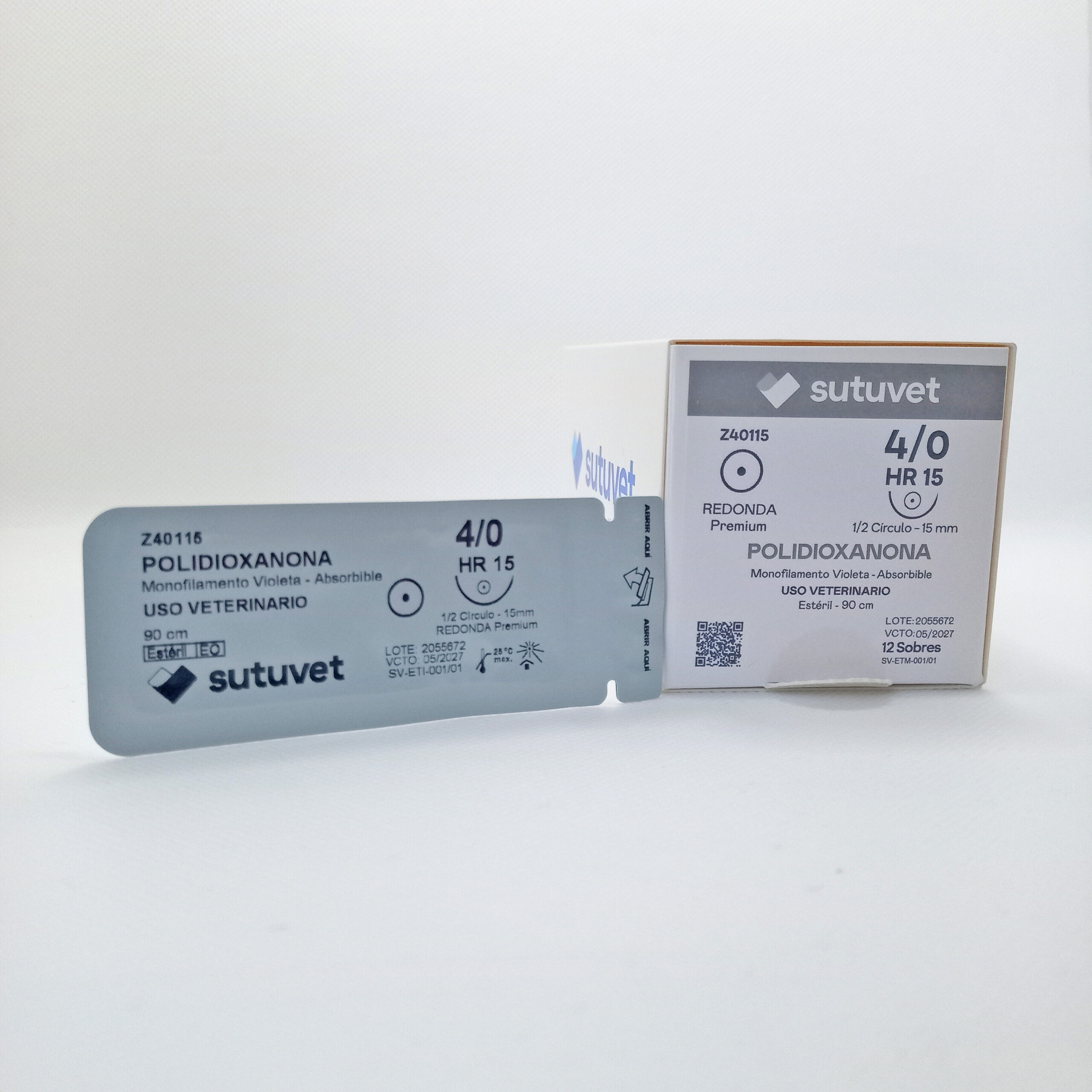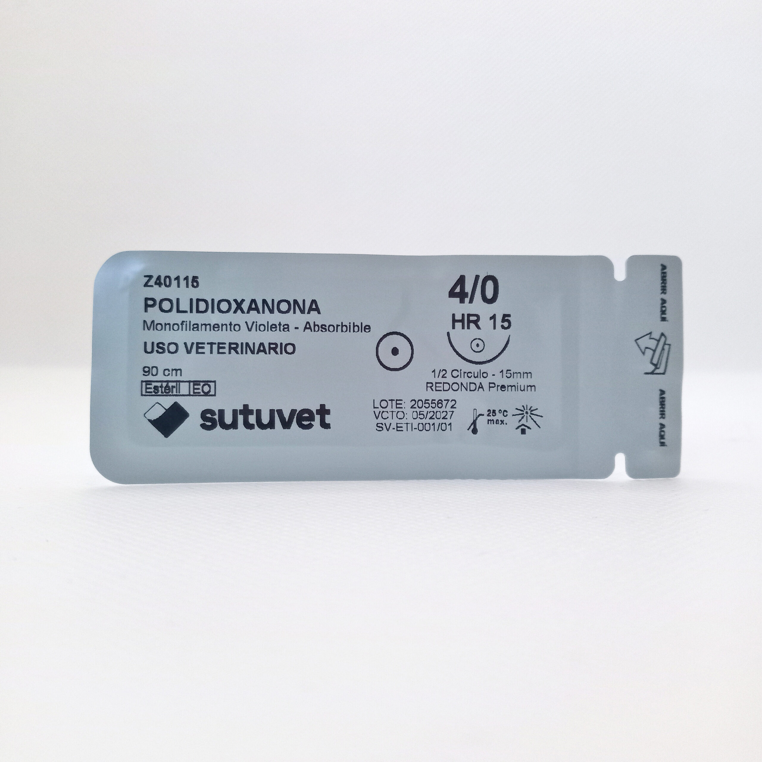 Sutuvet Colombia. Distribuidor exclusivo para Colombia, LANR Distribuciones. Sutura Monofilamento Absorbible de Polidioxanona, calibre 4/0, longitud de 70cm con aguja curva, medio circulo de 15 mm, punta atraumática. Tiempo de absorción 120-180 días.