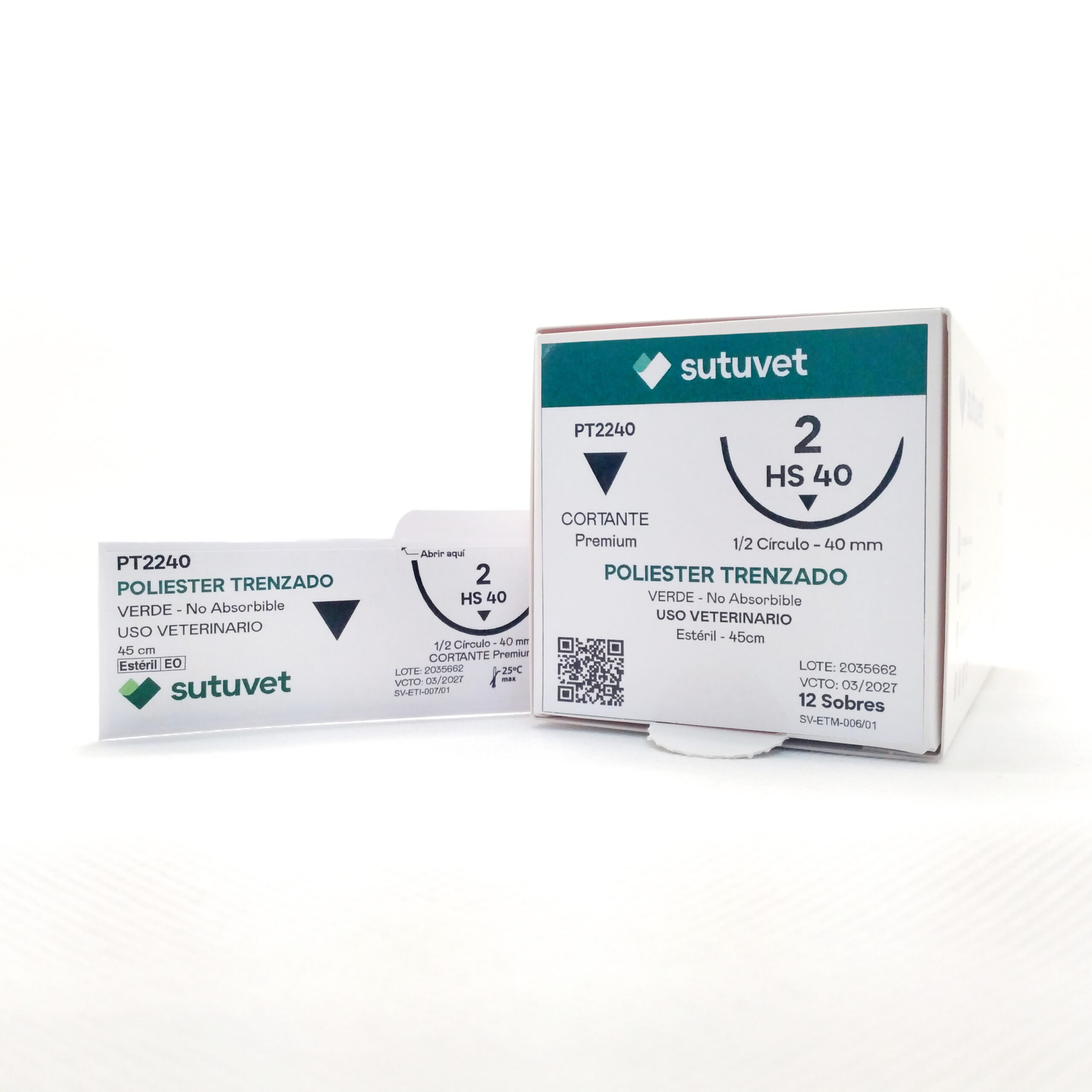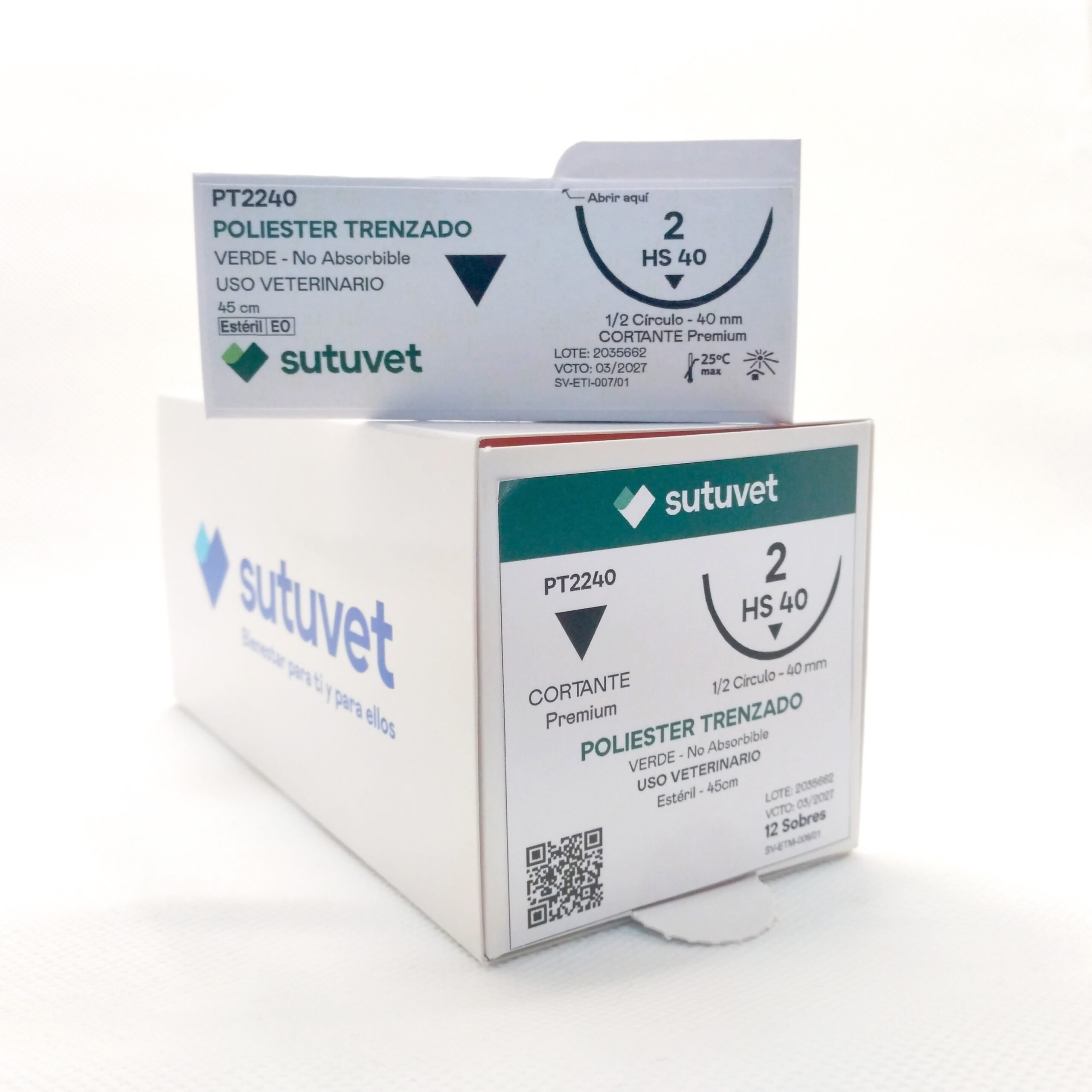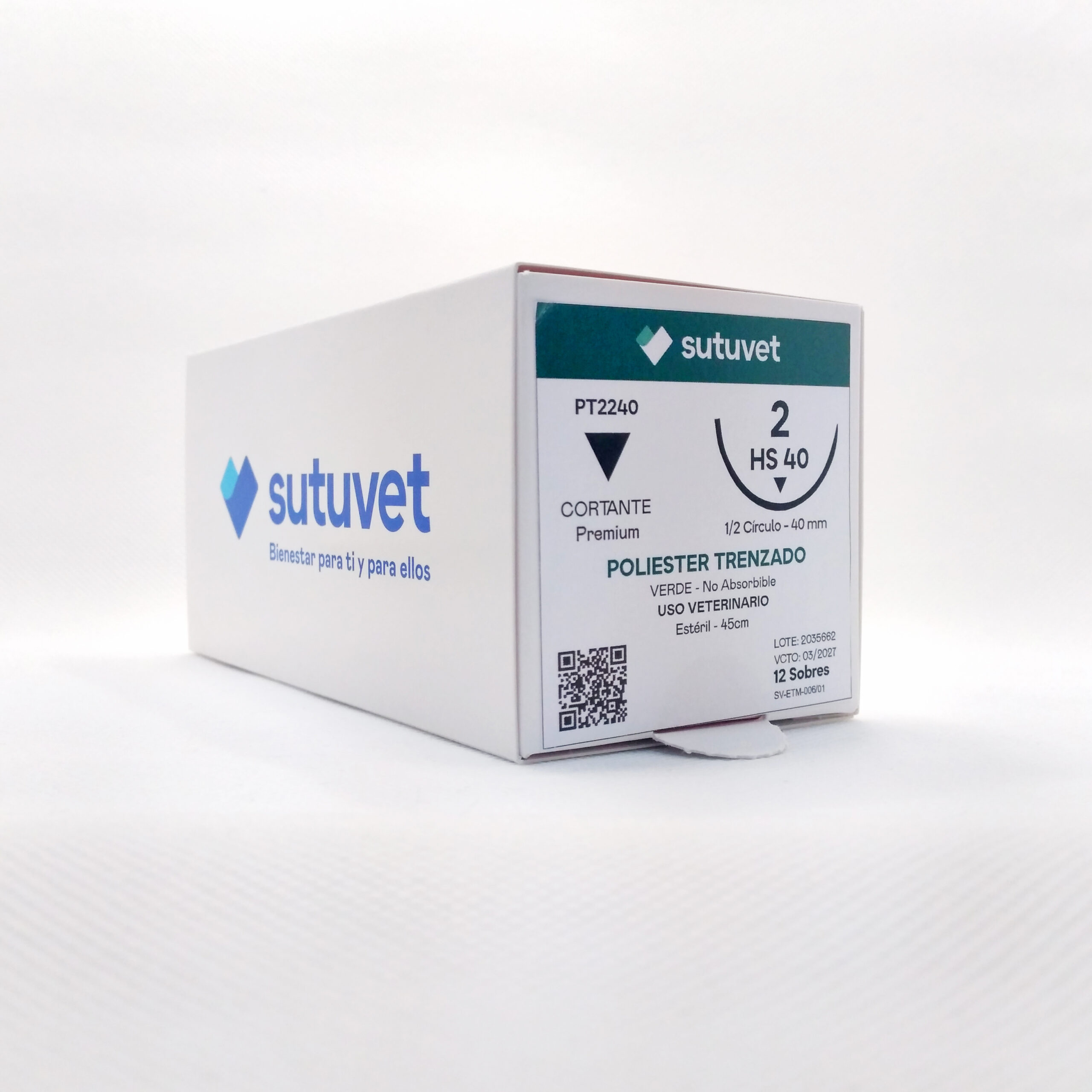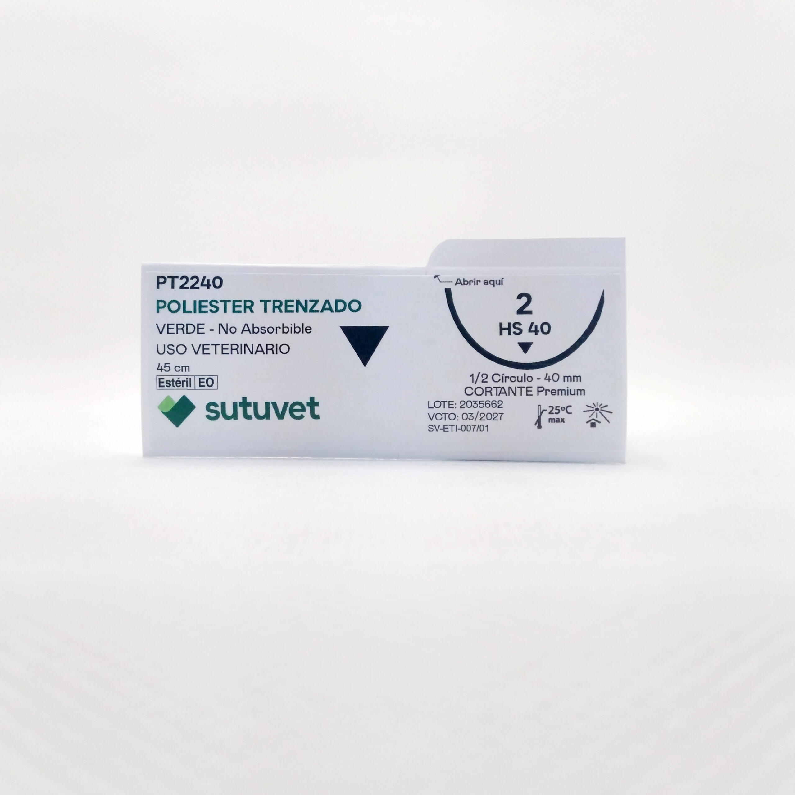 Sutuvet Colombia. Distribuidor exclusivo para Colombia, LANR Distribuciones. Sutura Multifilamento No absorbible de Poliester, calibre 2, longitud de 45 cm con aguja curva, medio circulo de 35 mm, punta traumática.