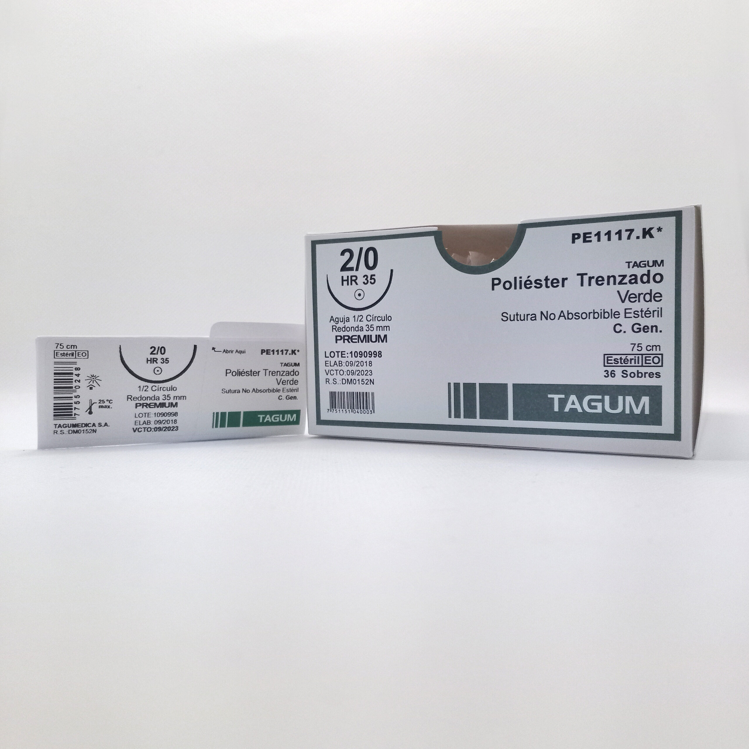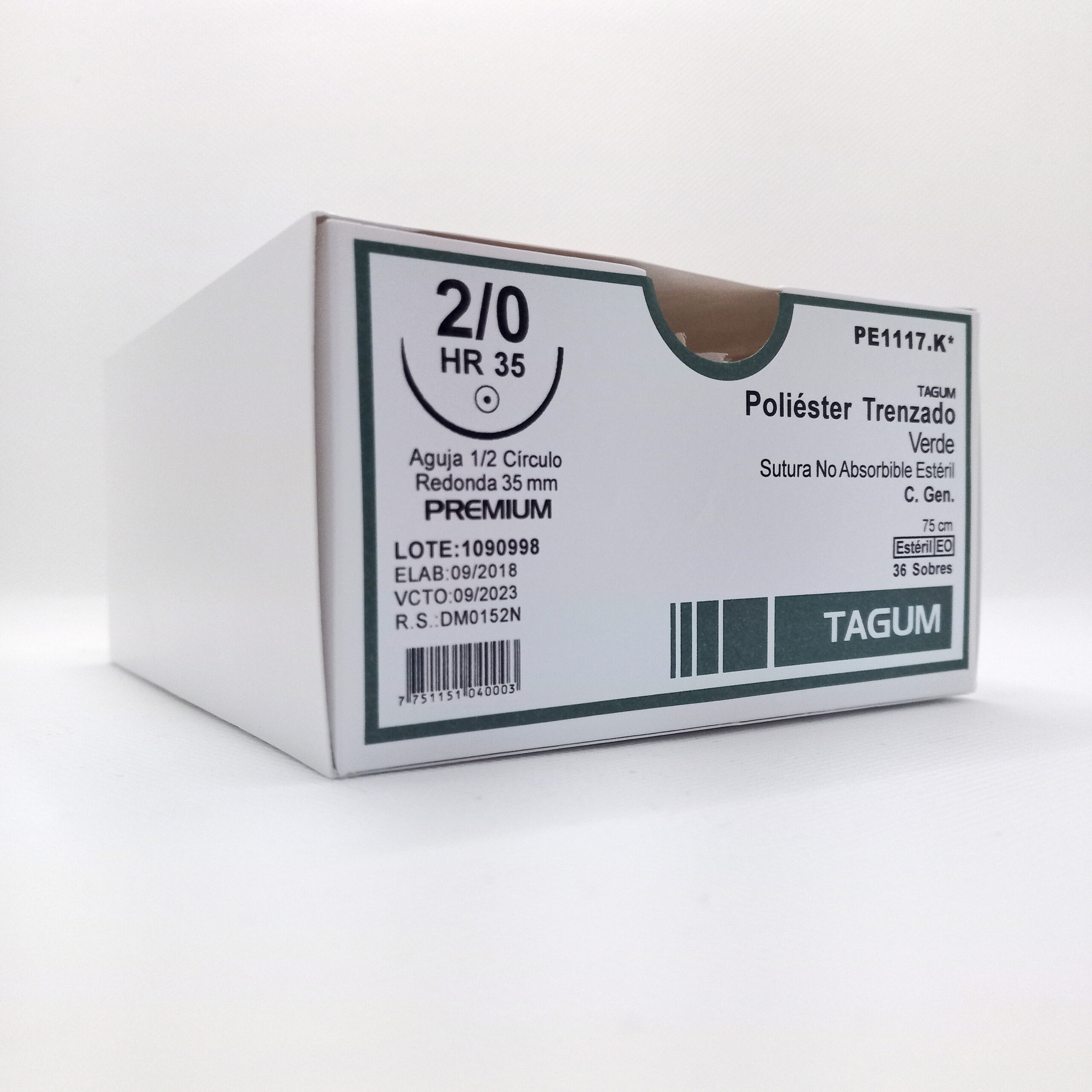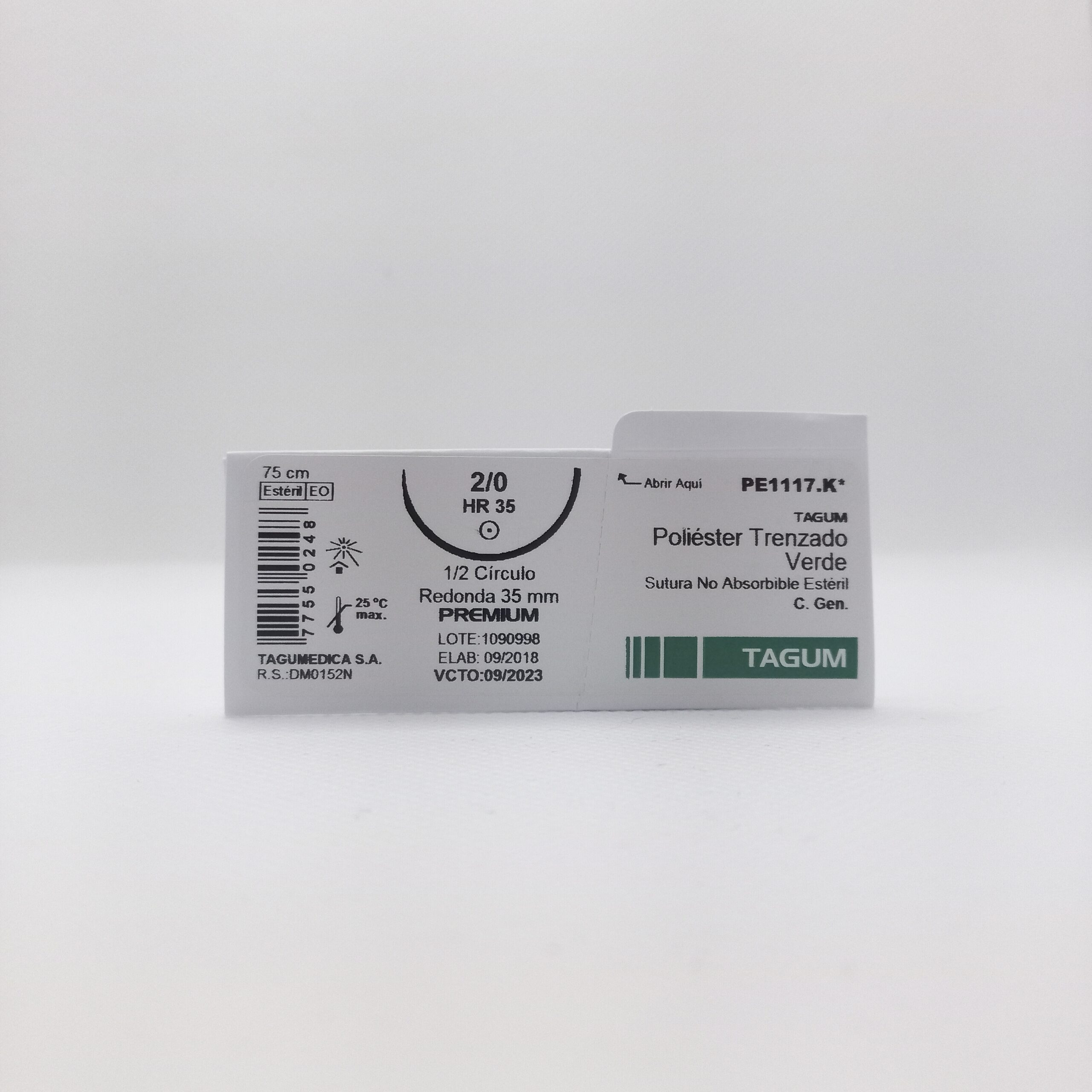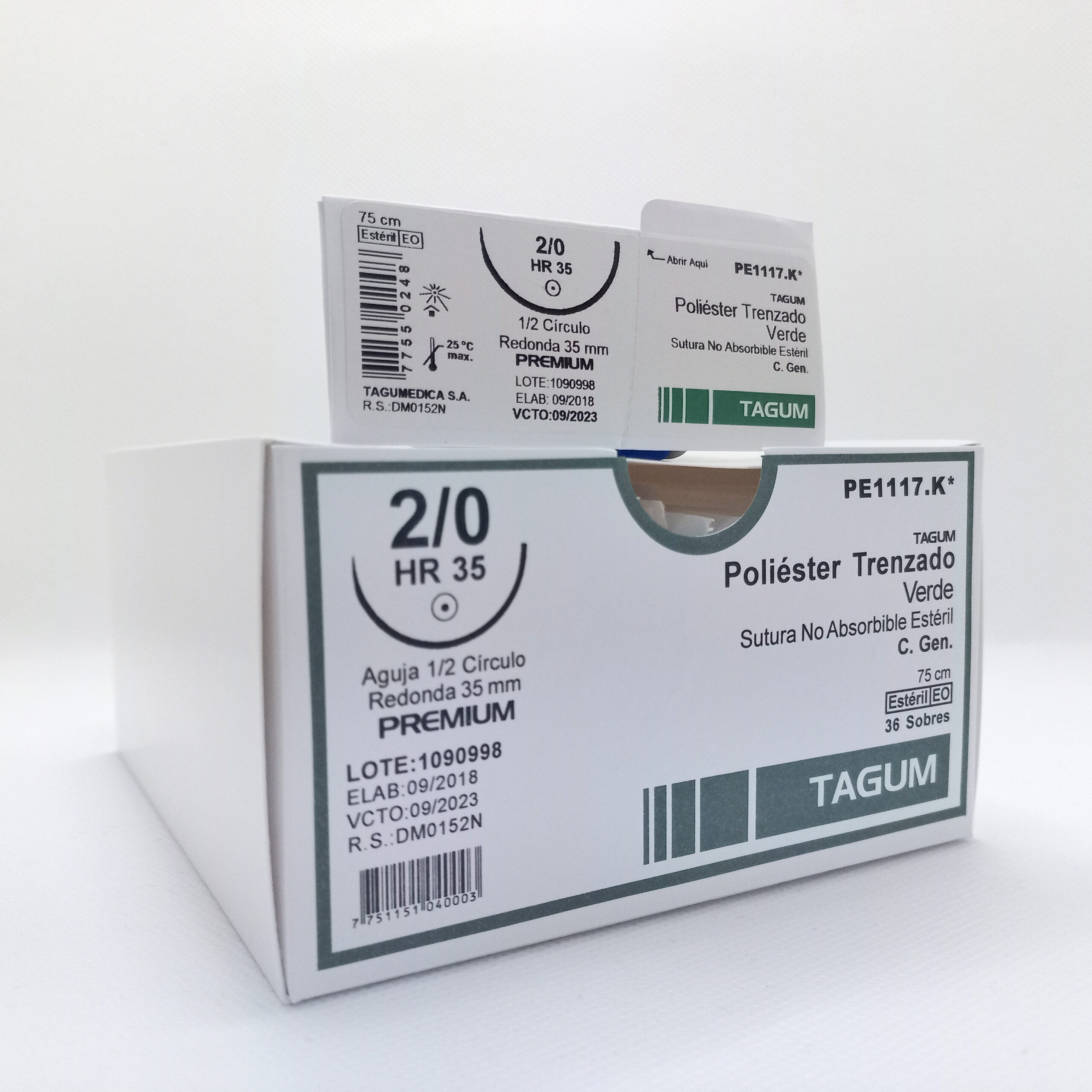 Sutuvet Colombia. Distribuidor exclusivo para Colombia, LANR Distribuciones. Sutura Multifilamento No absorbible de Poliester, calibre 2/0, longitud de 75 cm con aguja curva, medio circulo de 35 mm, punta atraumáticas.