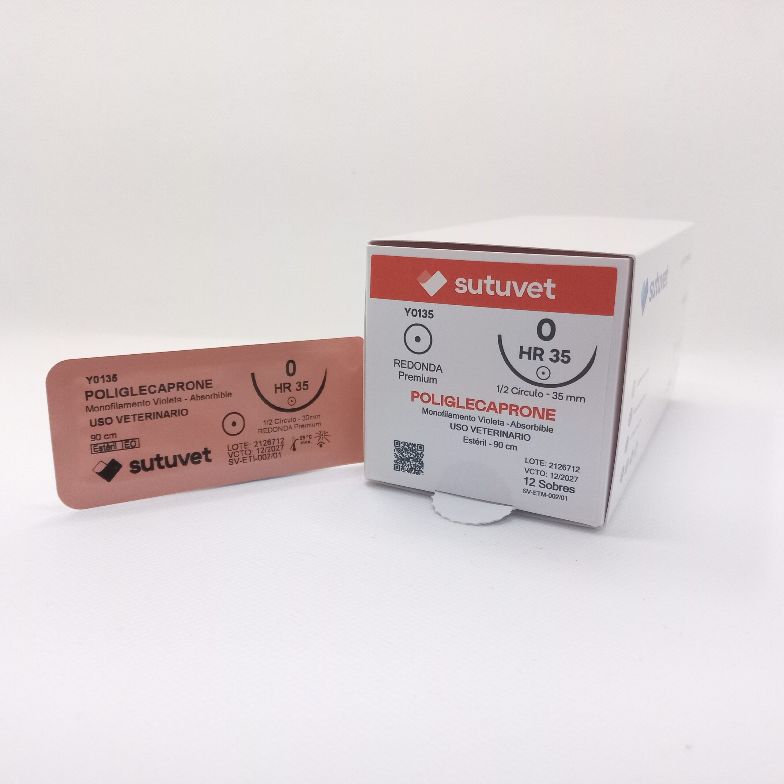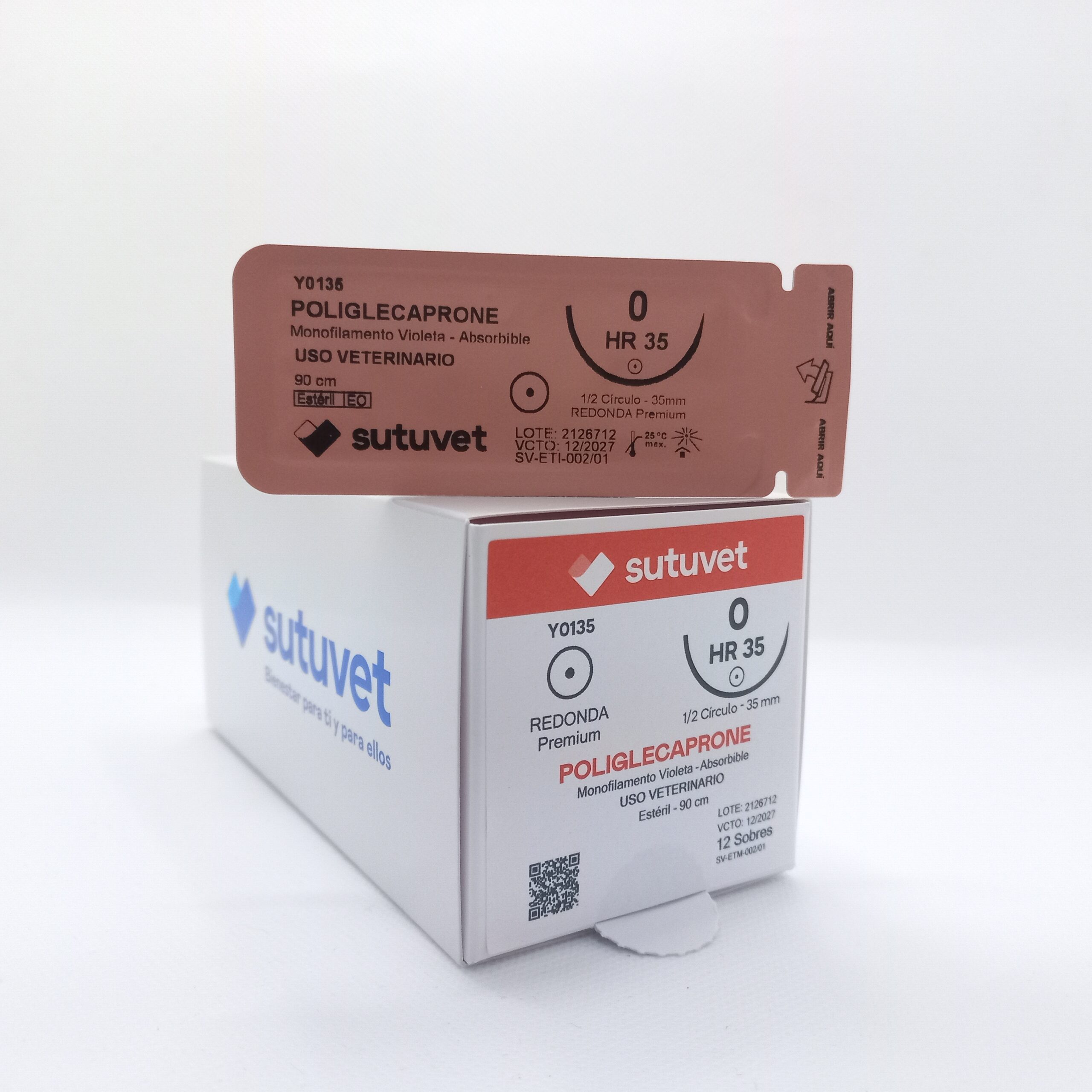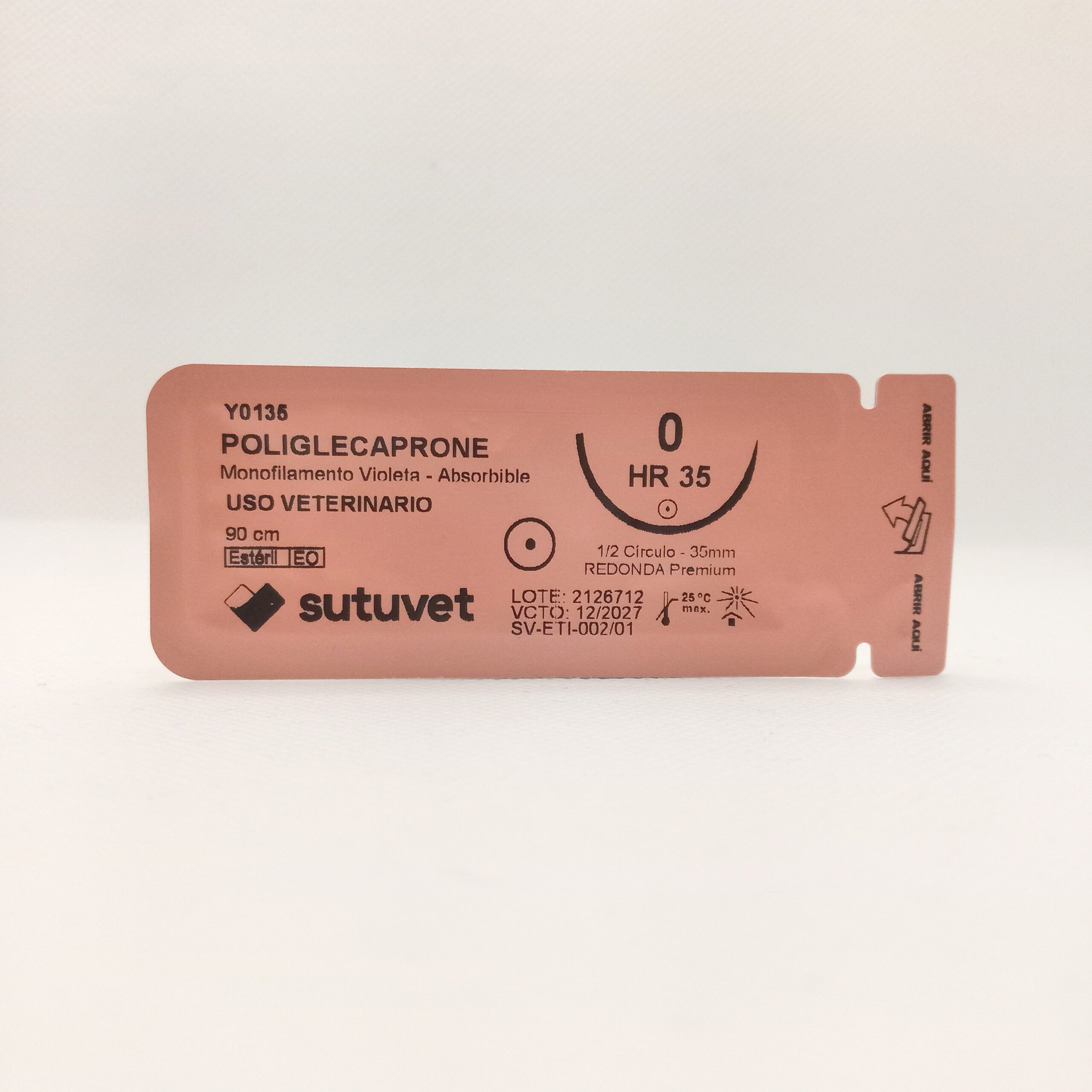 Sutuvet Colombia. Distribuidor exclusivo para Colombia, LANR Distribuciones. Sutura Monofilamento Absorbible de Poliglecaprone, calibre 0, longitud de 90cm con aguja curva, medio circulo de 35 mm, punta atraumática. Tiempo de absorción 60-90 días.