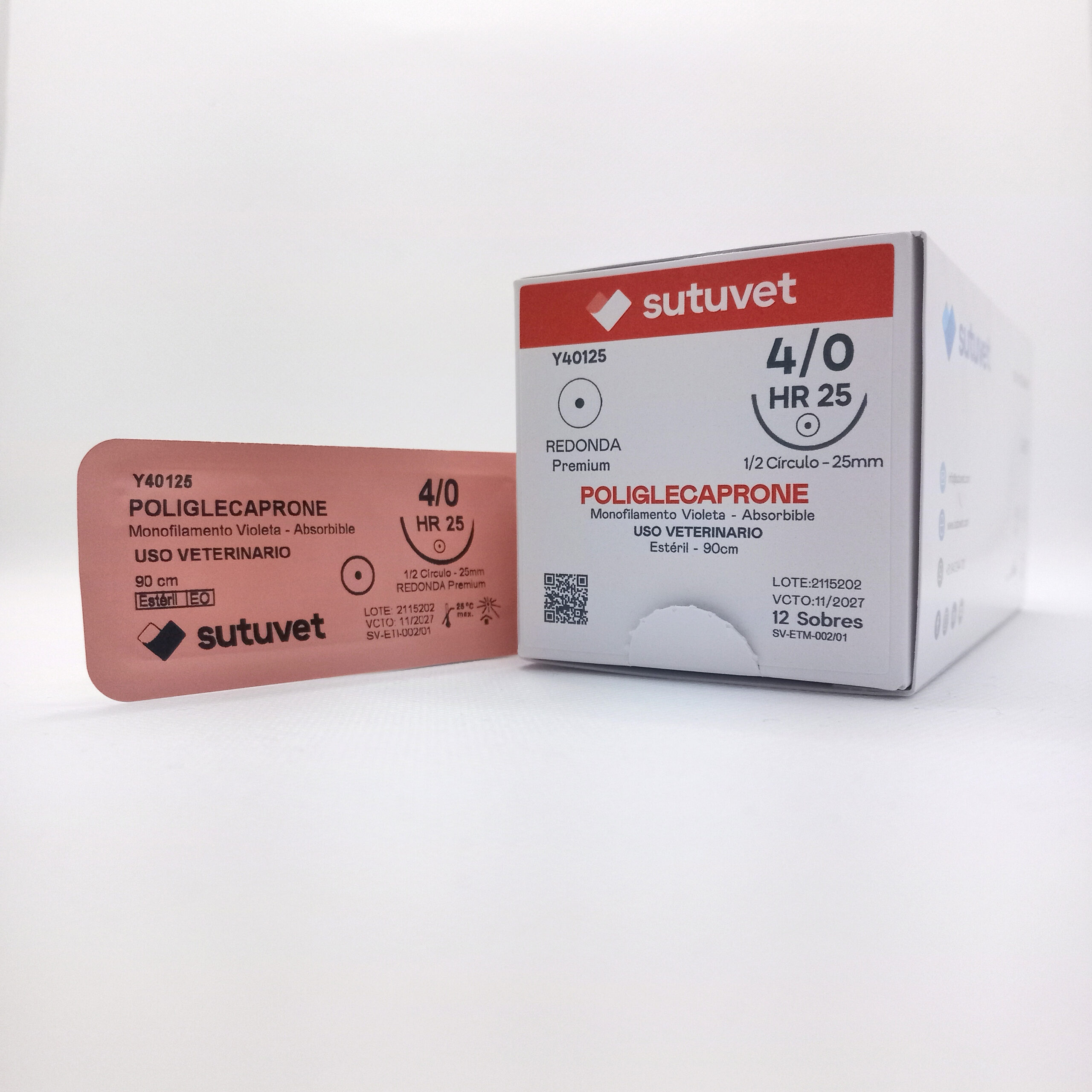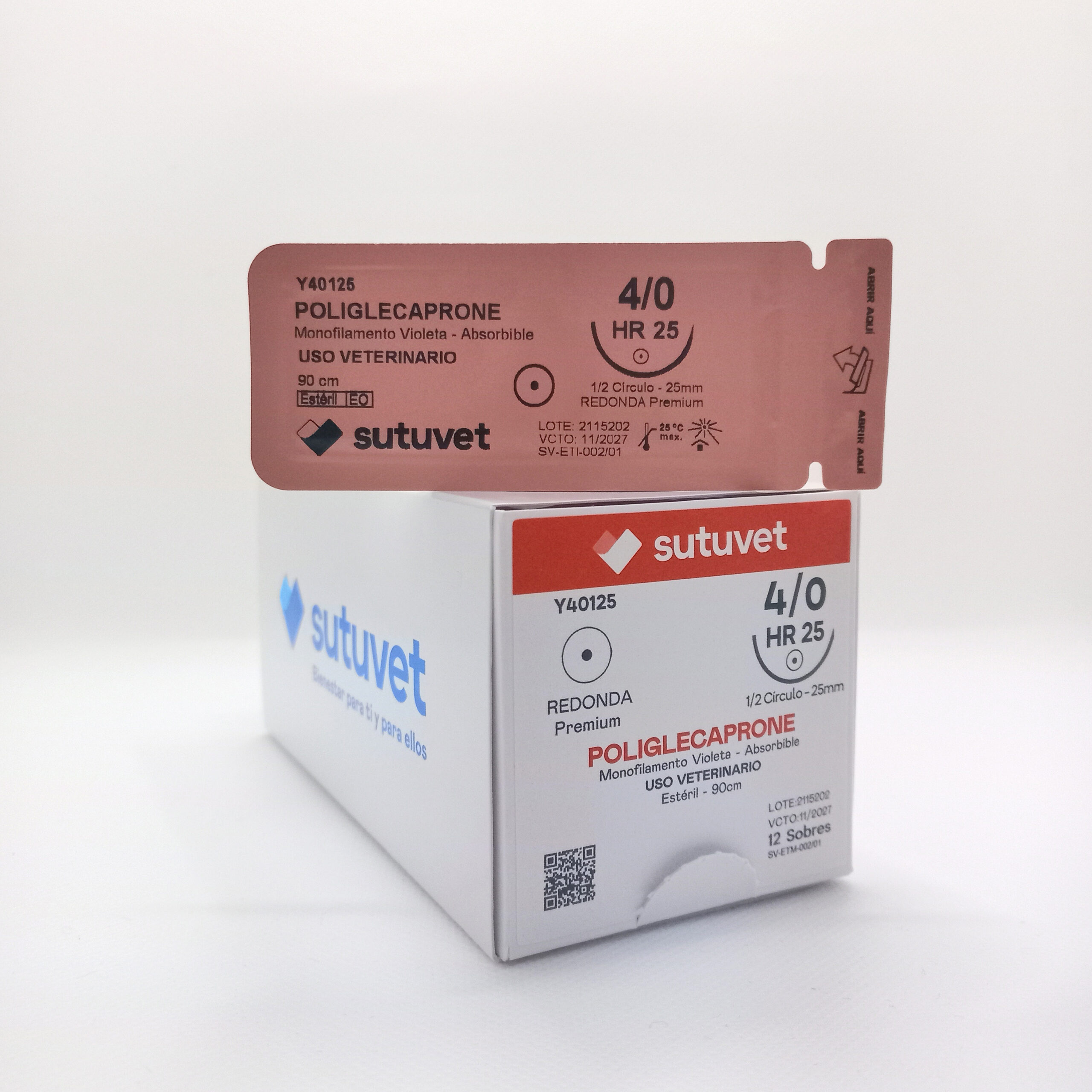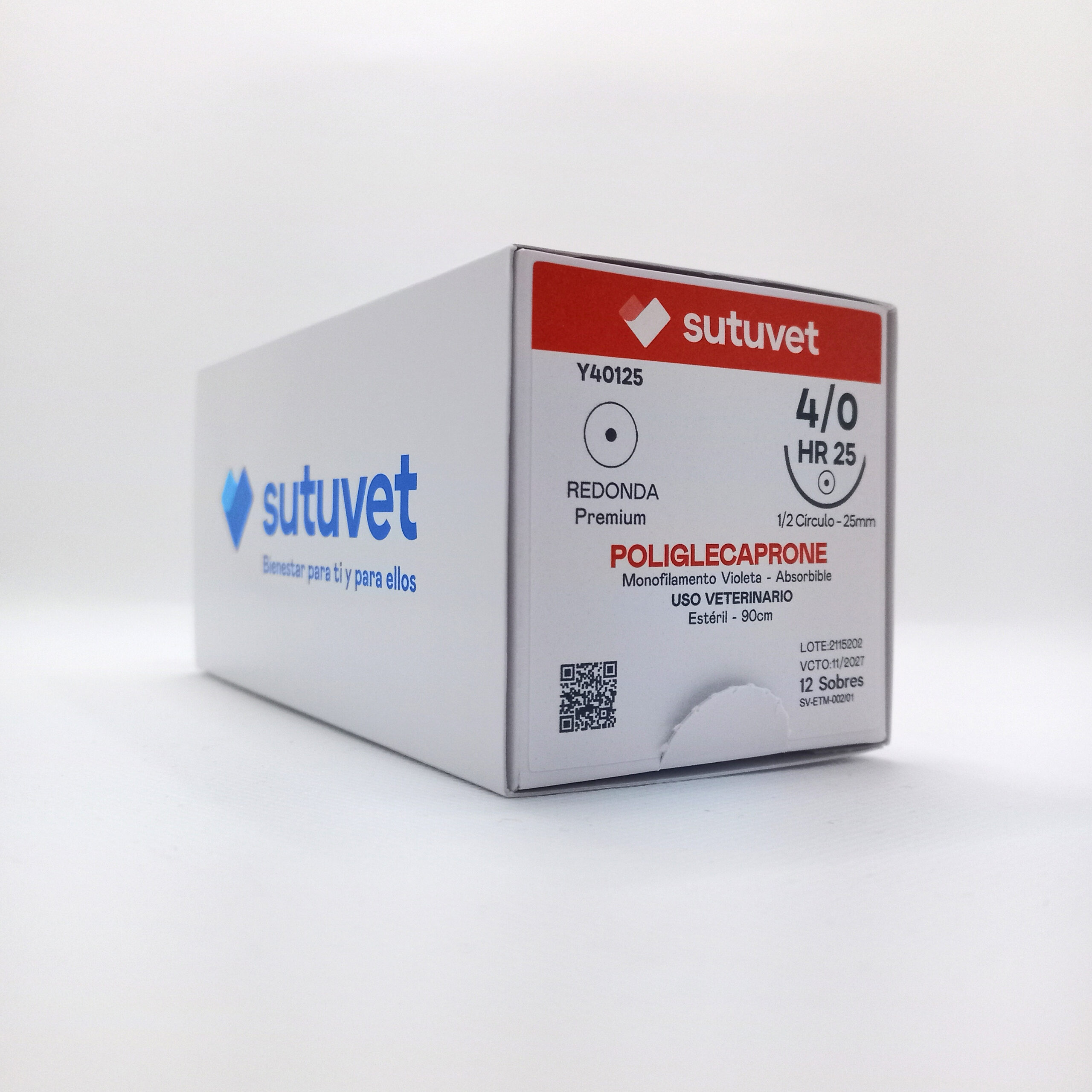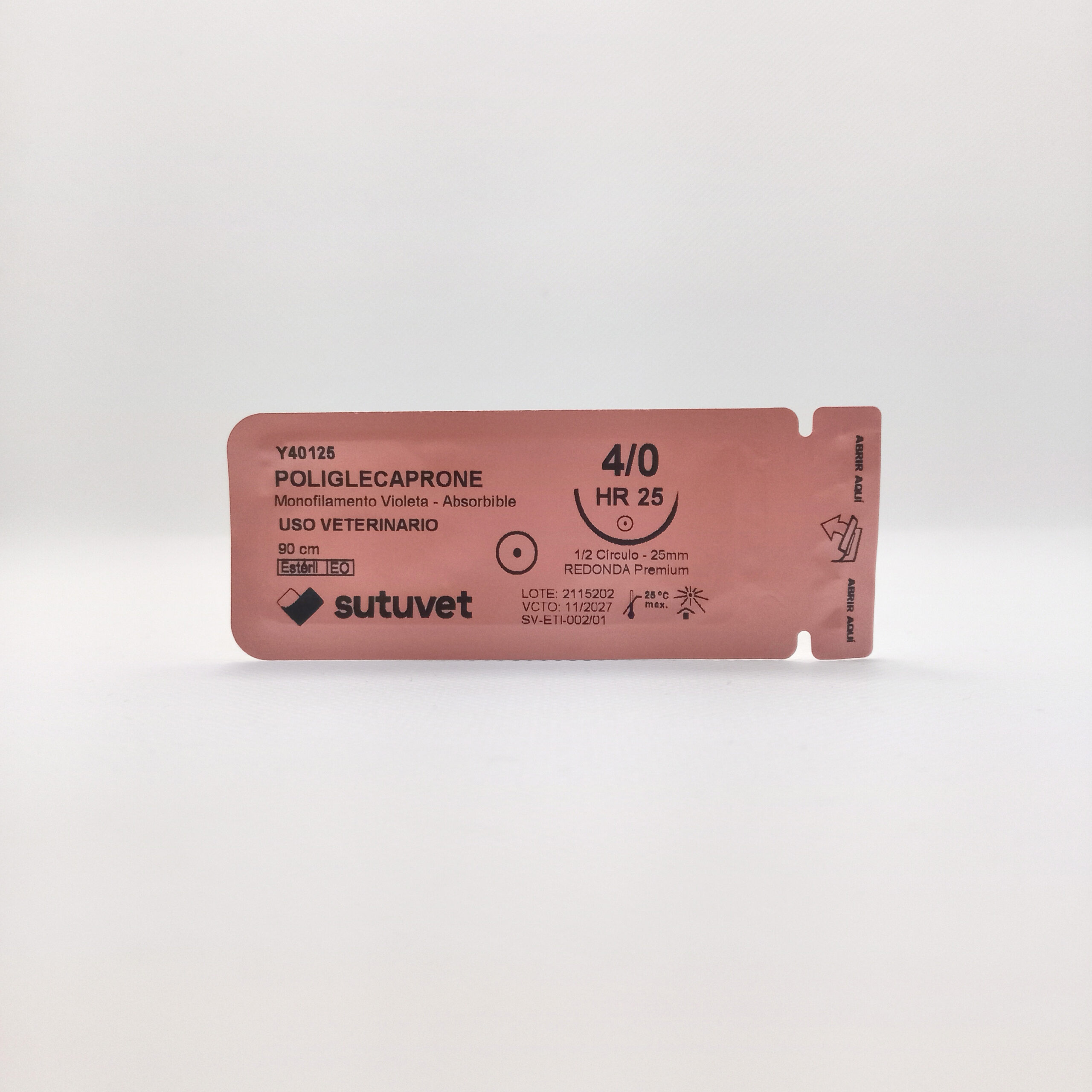 Sutuvet Colombia. Distribuidor exclusivo para Colombia, LANR Distribuciones. Sutura Monofilamento Absorbible de Poliglecaprone, calibre 4/0, longitud de 90cm con aguja curva, medio circulo de 25 mm, punta atraumática. Tiempo de absorción 60-90 días.