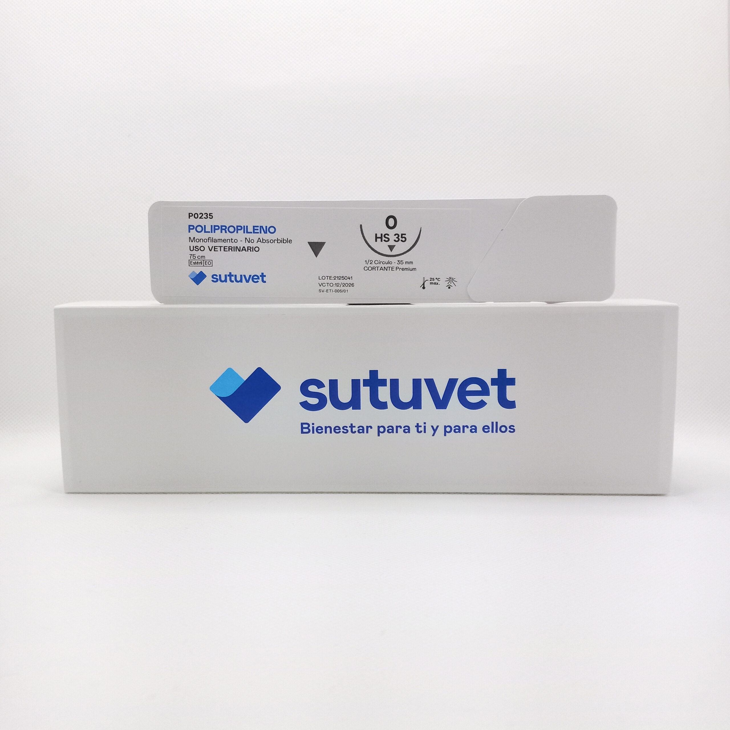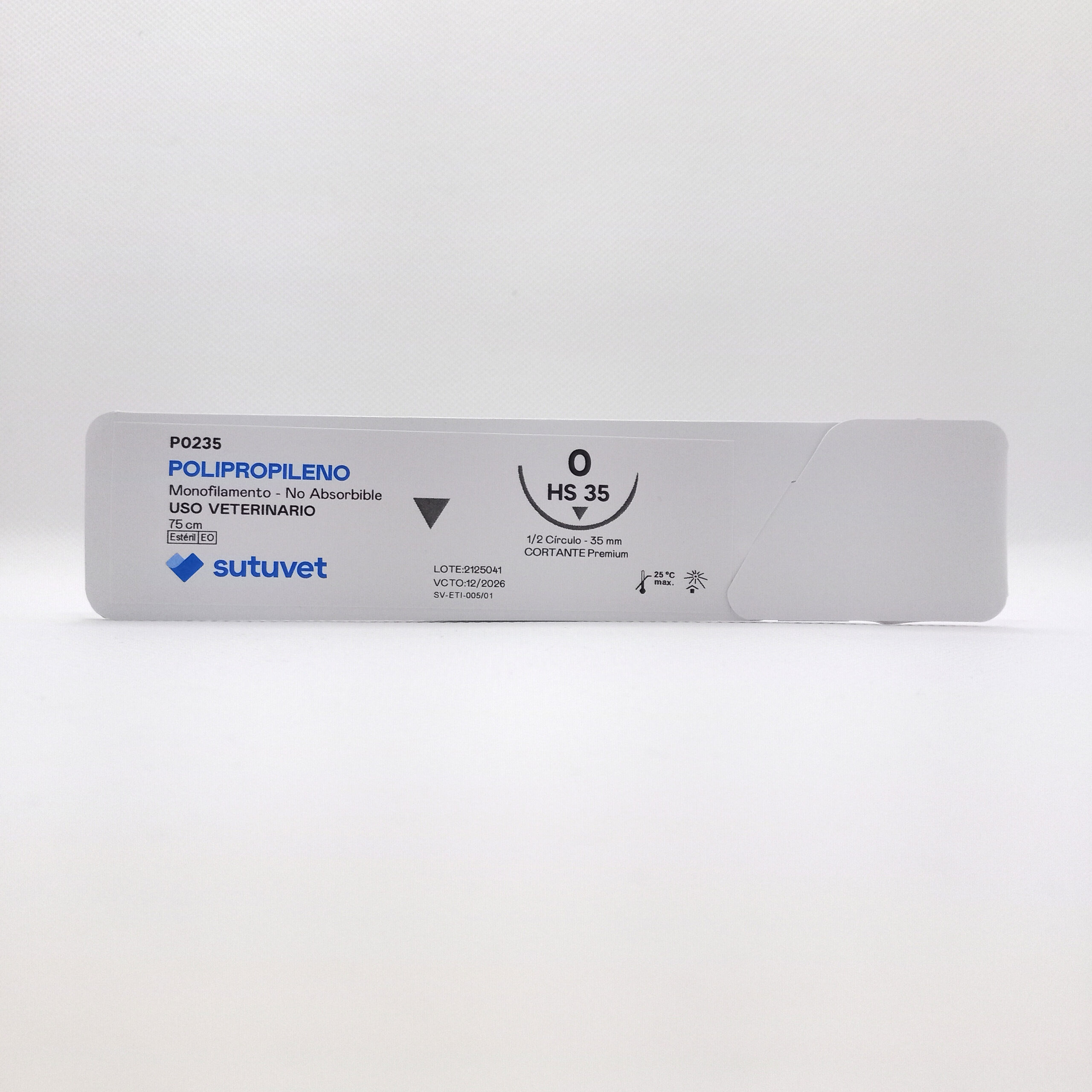 Sutuvet Colombia. Distribuidor exclusivo para Colombia, LANR Distribuciones. Sutura Monofilamento No absorbible de Polipropileno, calibre 0, longitud de 75 cm con aguja curva, medio circulo de 35 mm, punta traumática.