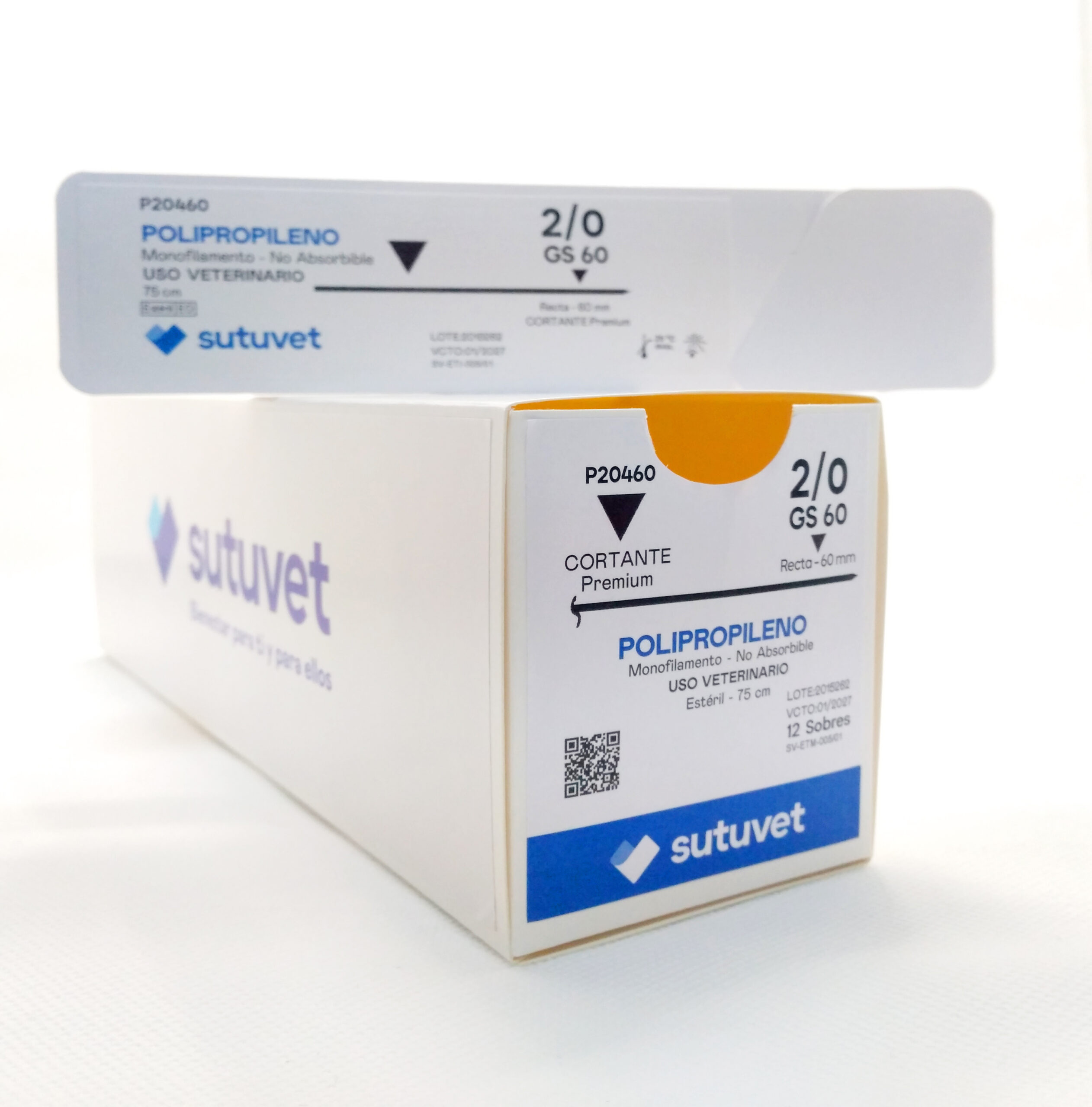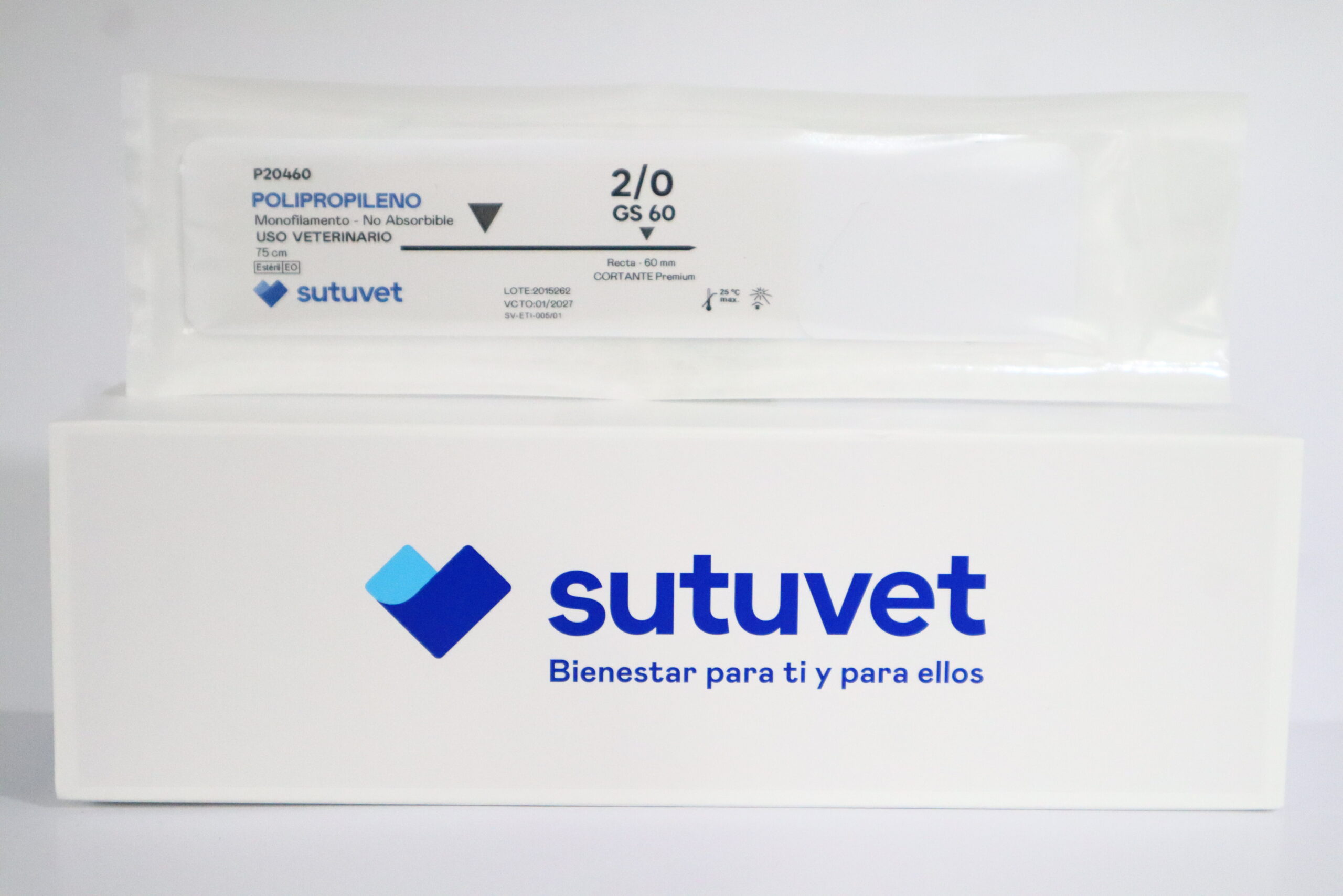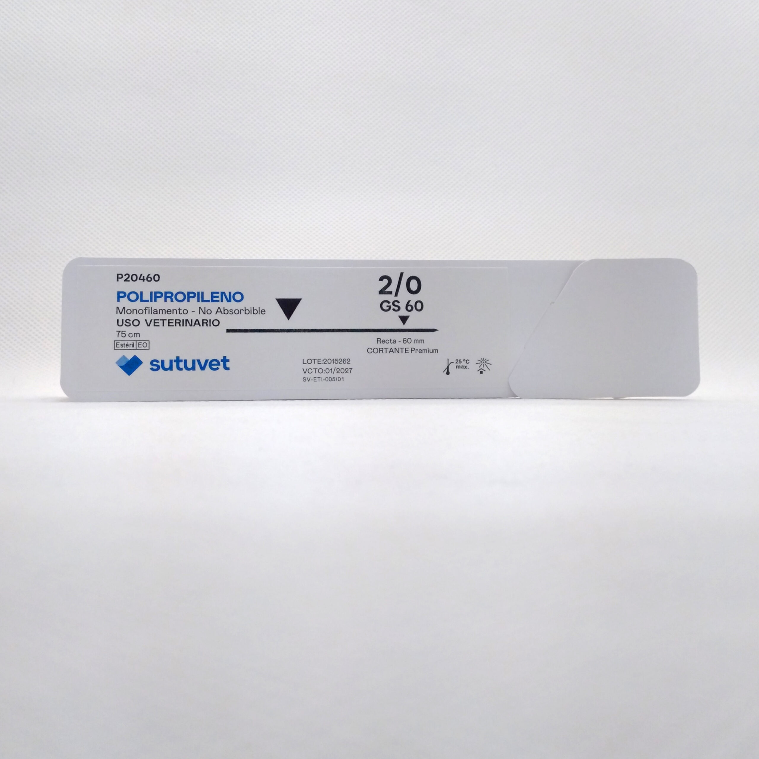 Sutuvet Colombia. Distribuidor exclusivo para Colombia, LANR Distribuciones. Sutura Monofilamento No absorbible de Polipropileno, calibre 2/0, longitud de 75 cm con aguja recta 60 mm, punta traumática.
