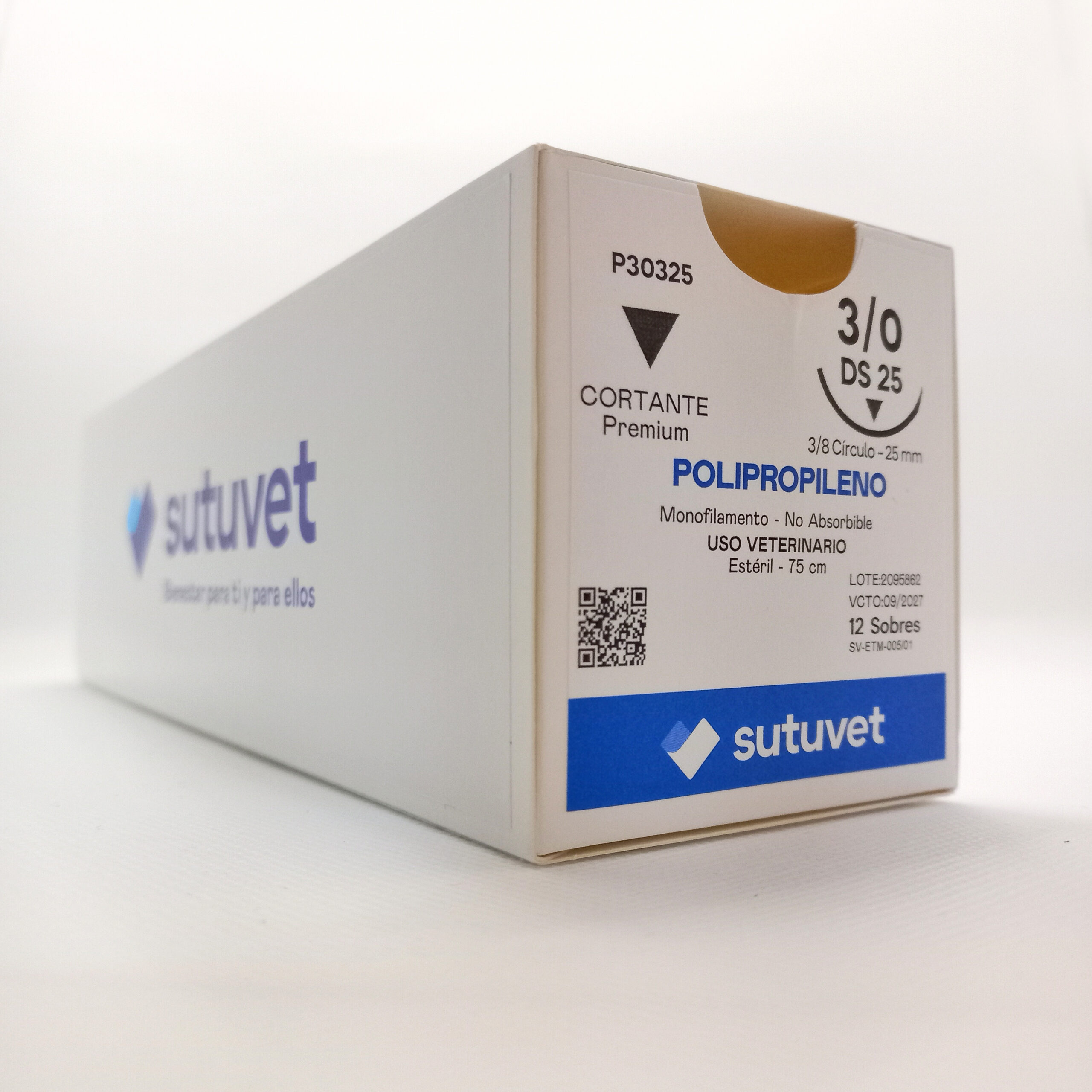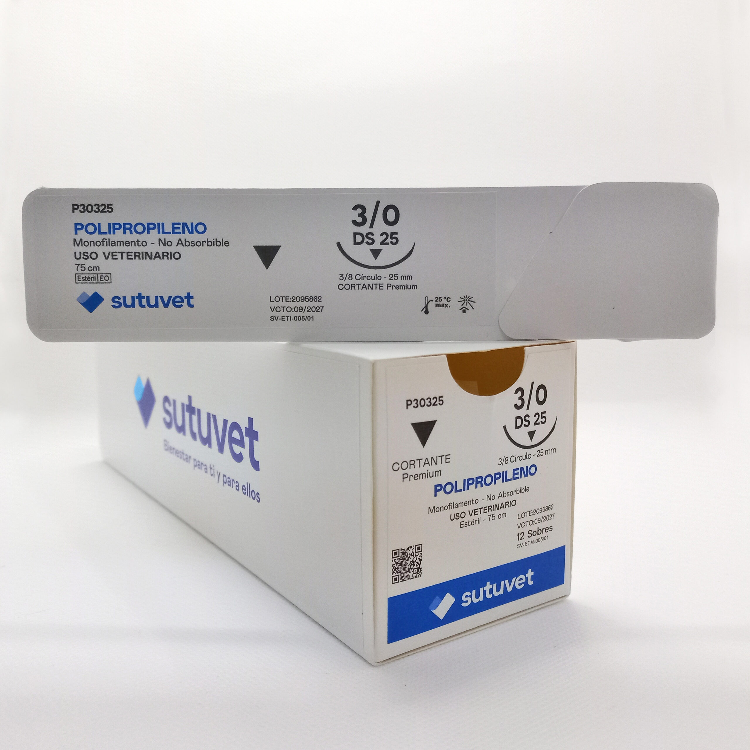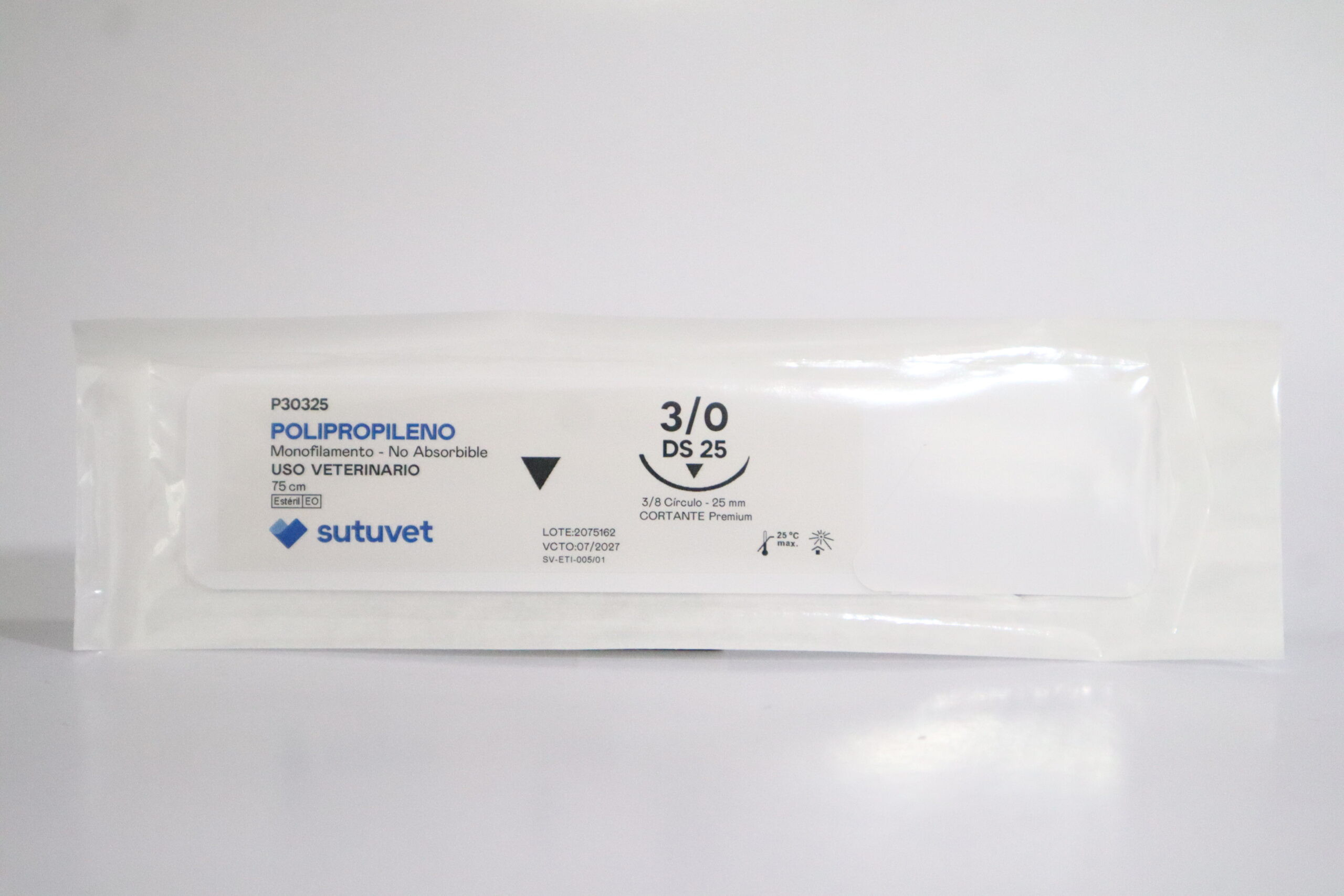 Sutuvet Colombia. Distribuidor exclusivo para Colombia, LANR Distribuciones. Sutura Monofilamento No absorbible de Polipropileno, calibre 3/0, longitud de 75 cm con aguja curva, 3/8 de circulo de 25 mm, punta traumática.