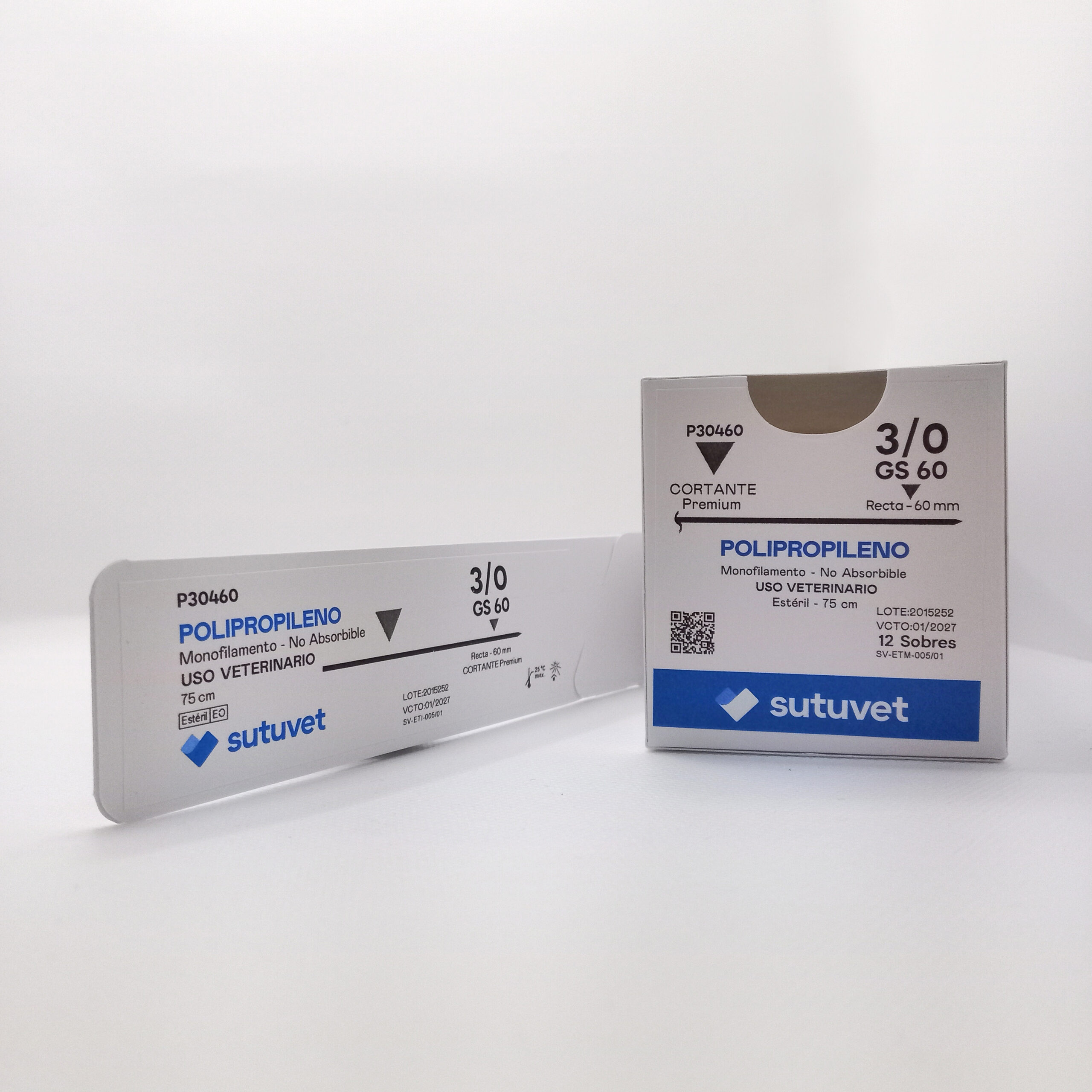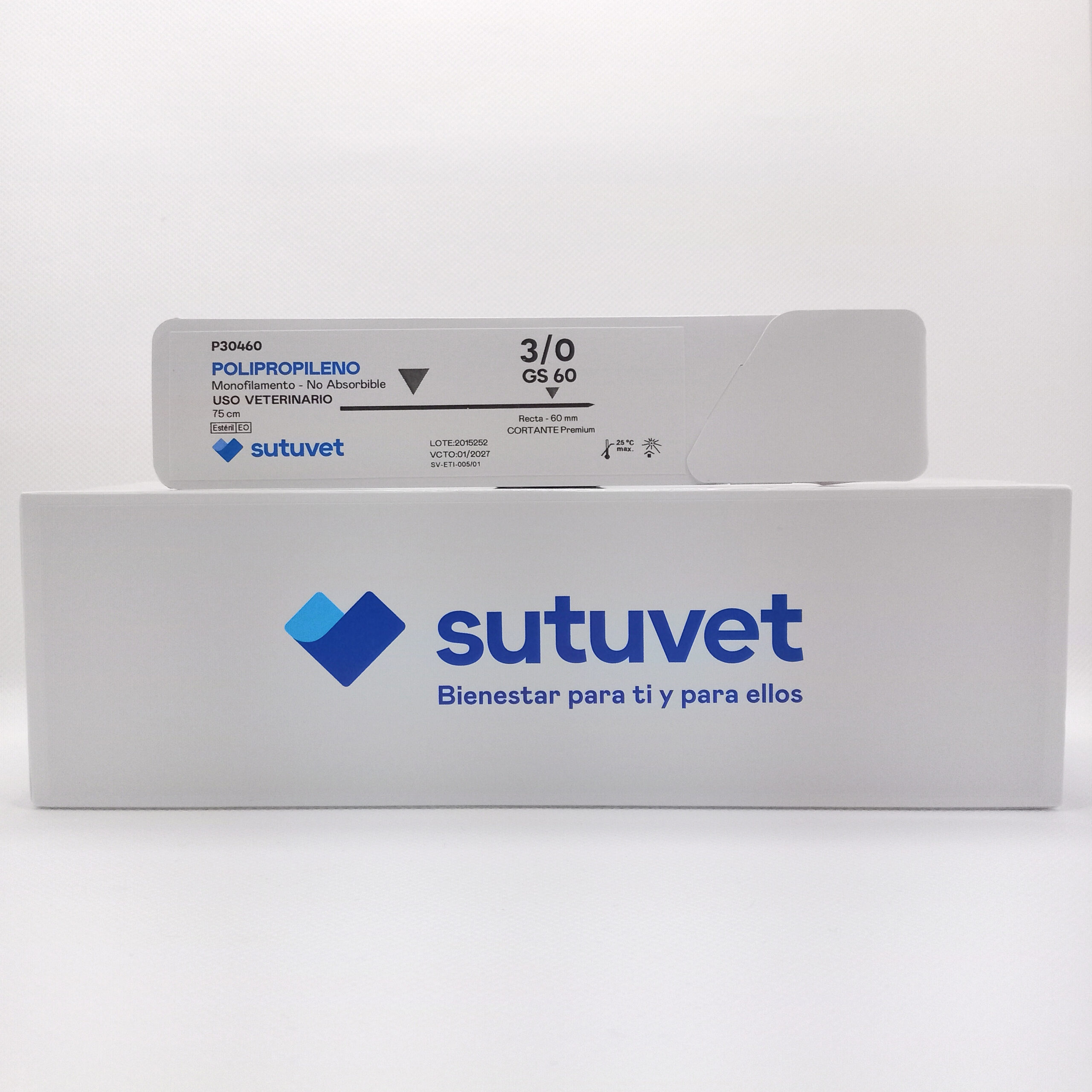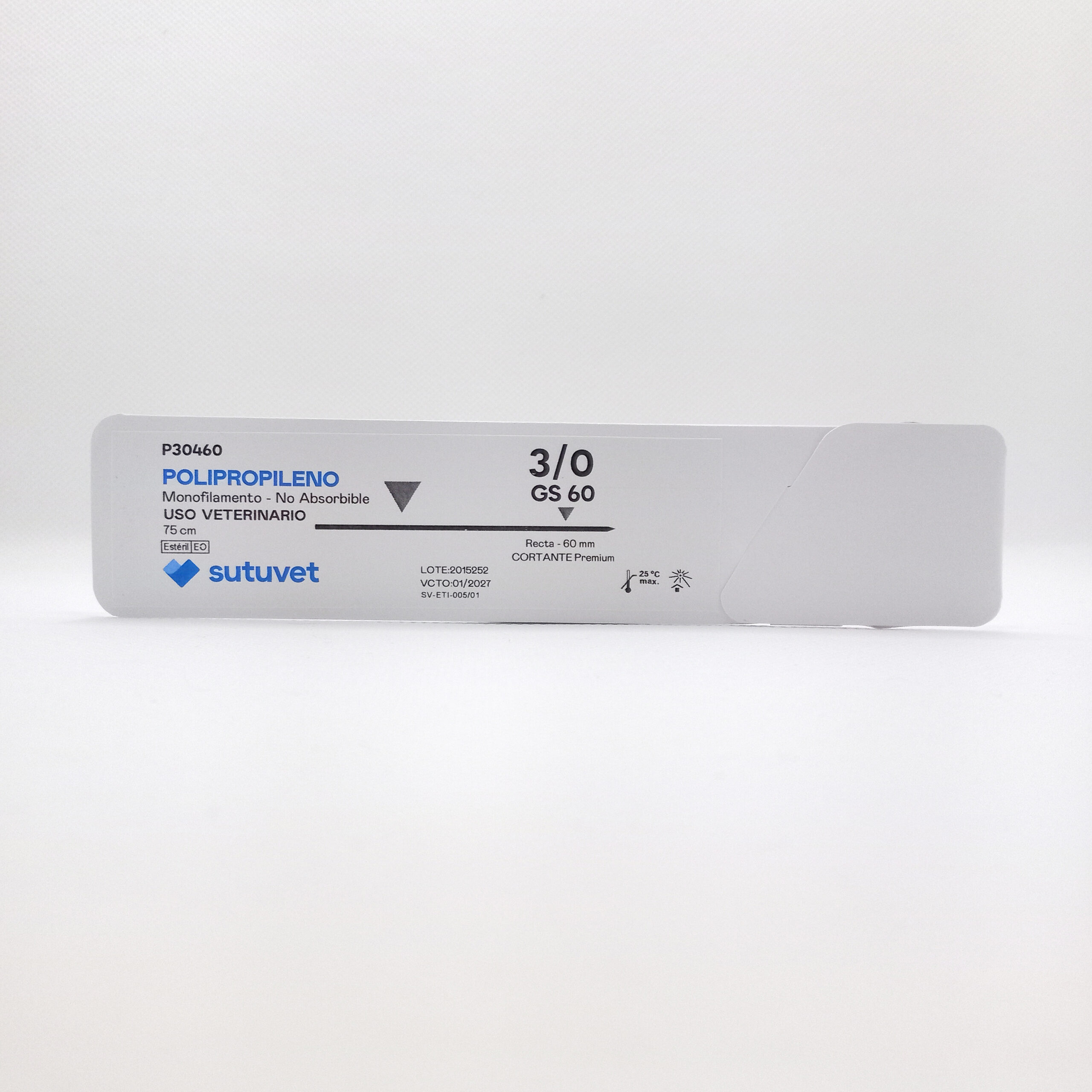 Sutuvet Colombia. Distribuidor exclusivo para Colombia, LANR Distribuciones. Sutura Monofilamento No absorbible de Polipropileno, calibre 3/0, longitud de 75 cm con aguja recta 60 mm, punta traumática.