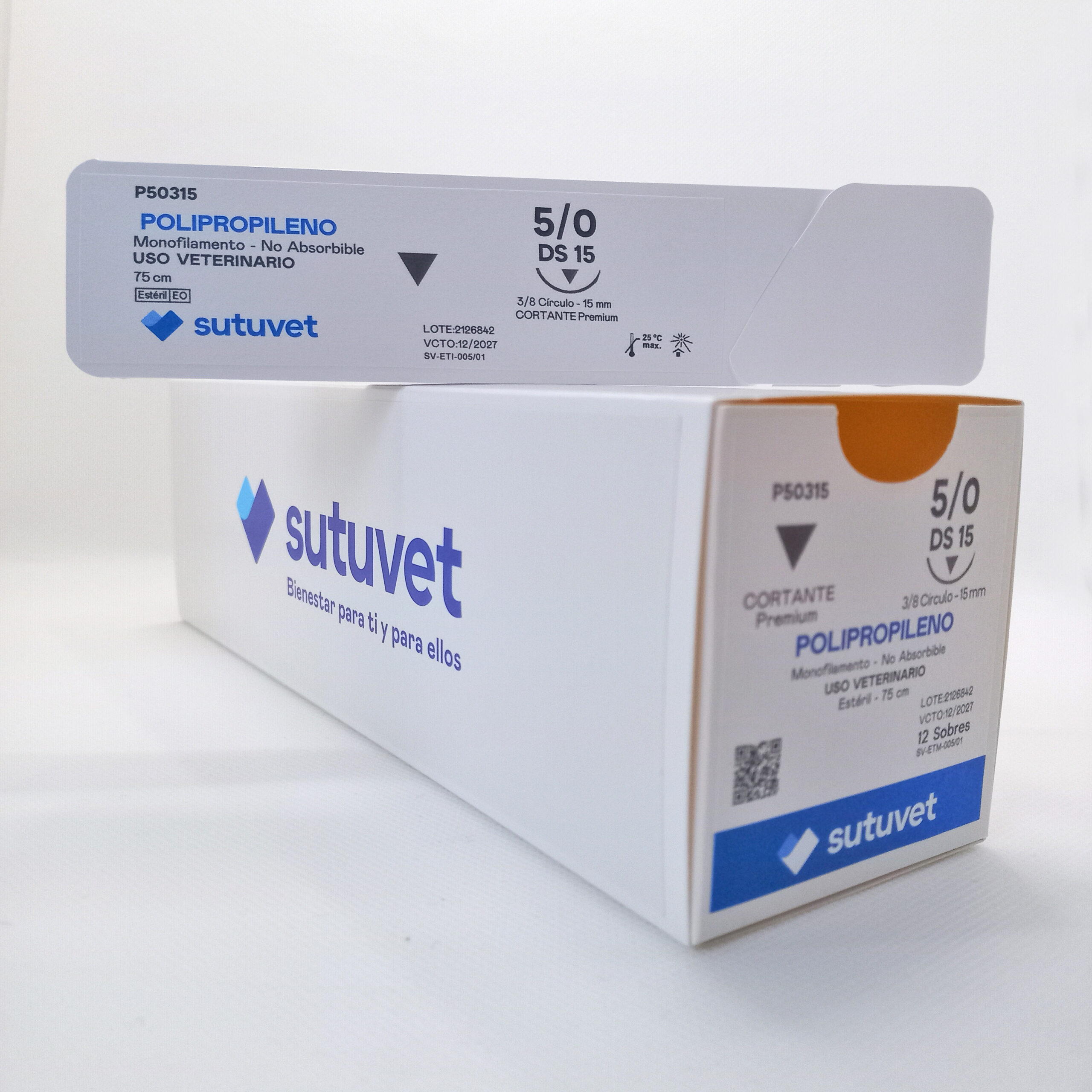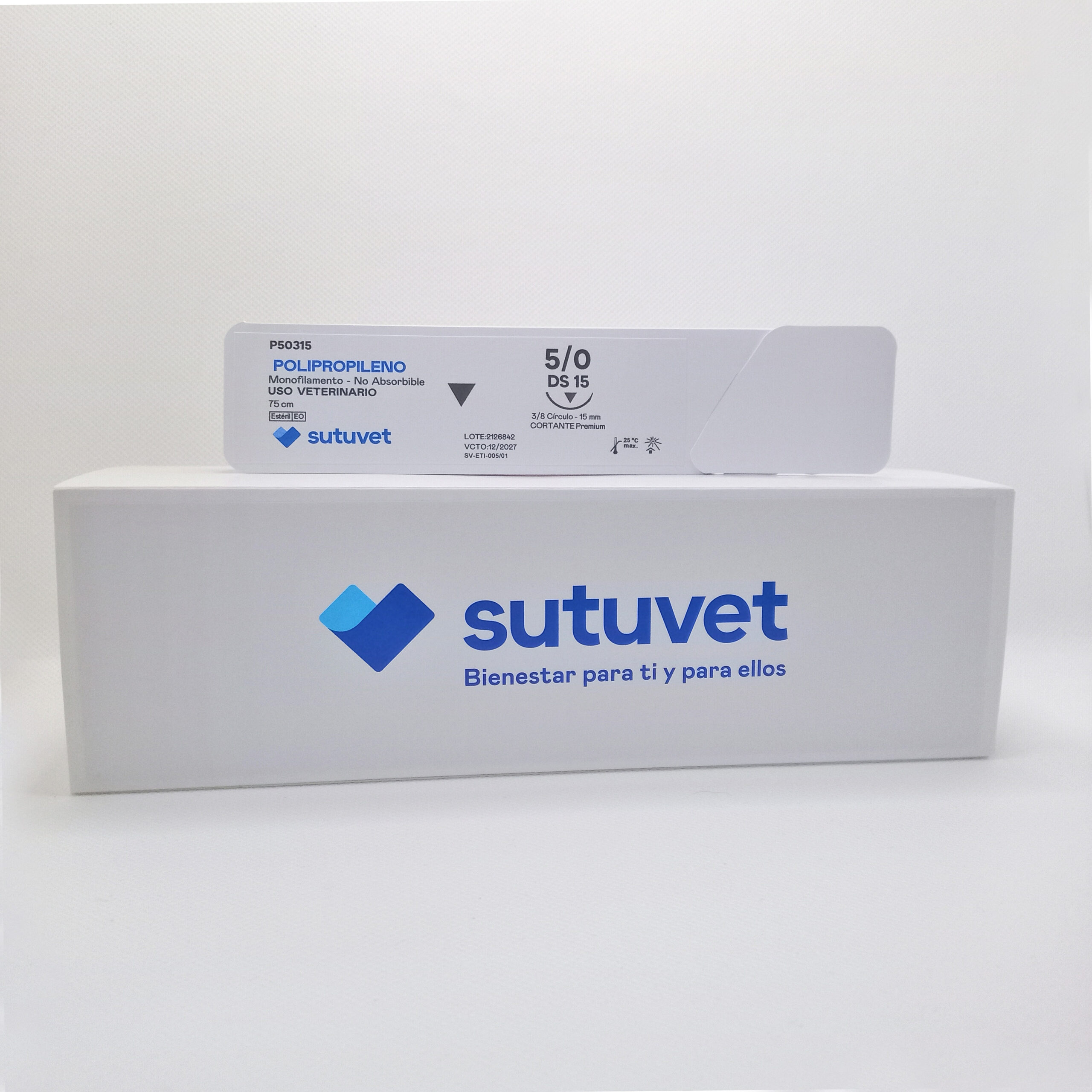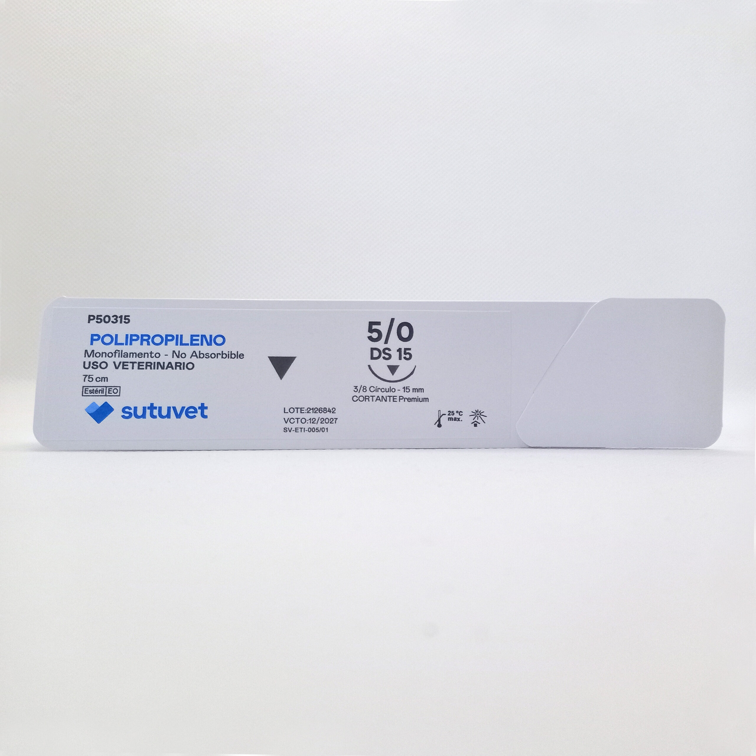 Sutuvet Colombia. Distribuidor exclusivo para Colombia, LANR Distribuciones. Sutura Monofilamento No absorbible de Polipropileno, calibre 5/0, longitud de 75 cm con aguja curva, 3/8 de circulo de 15 mm, punta traumática.